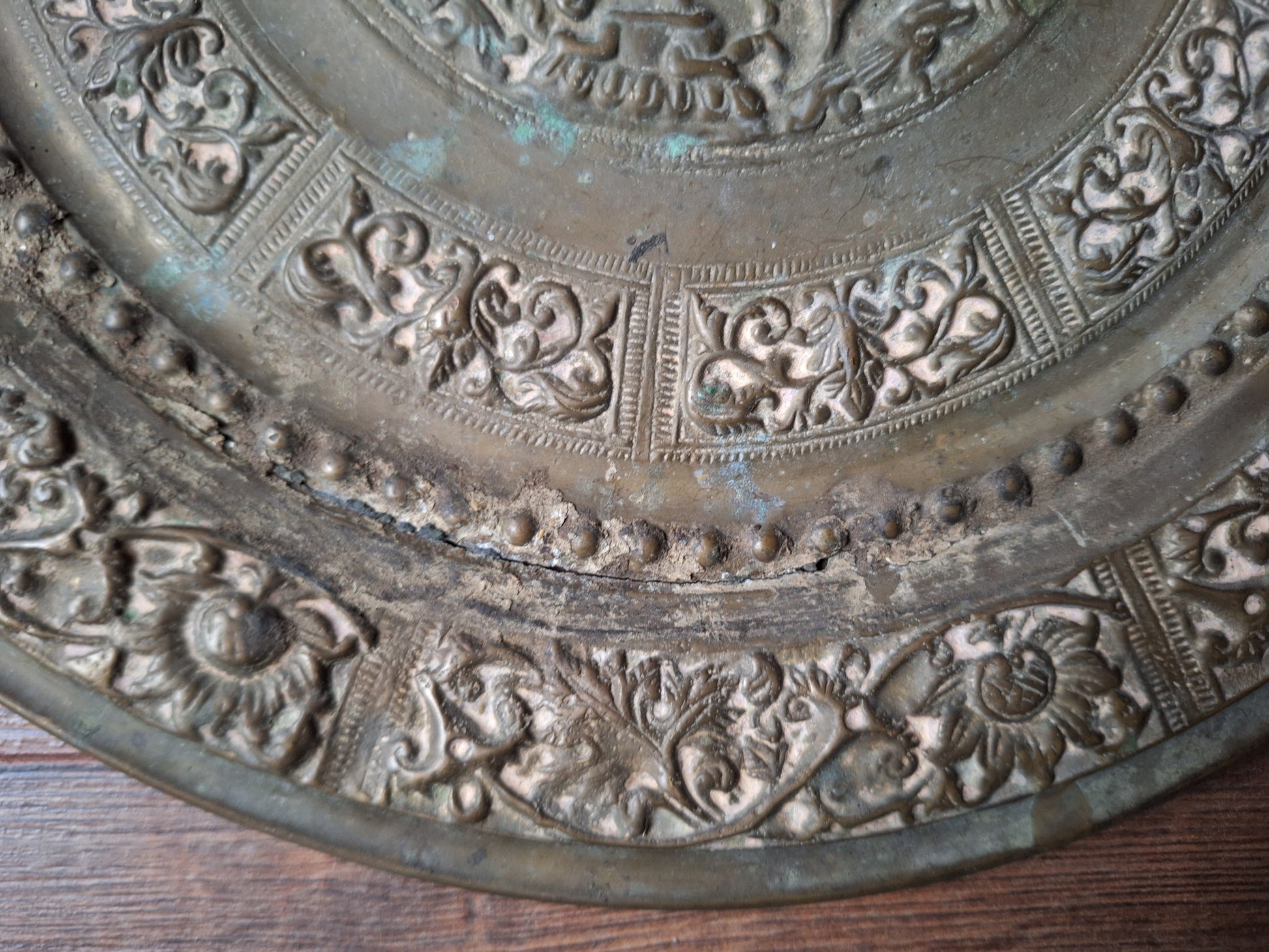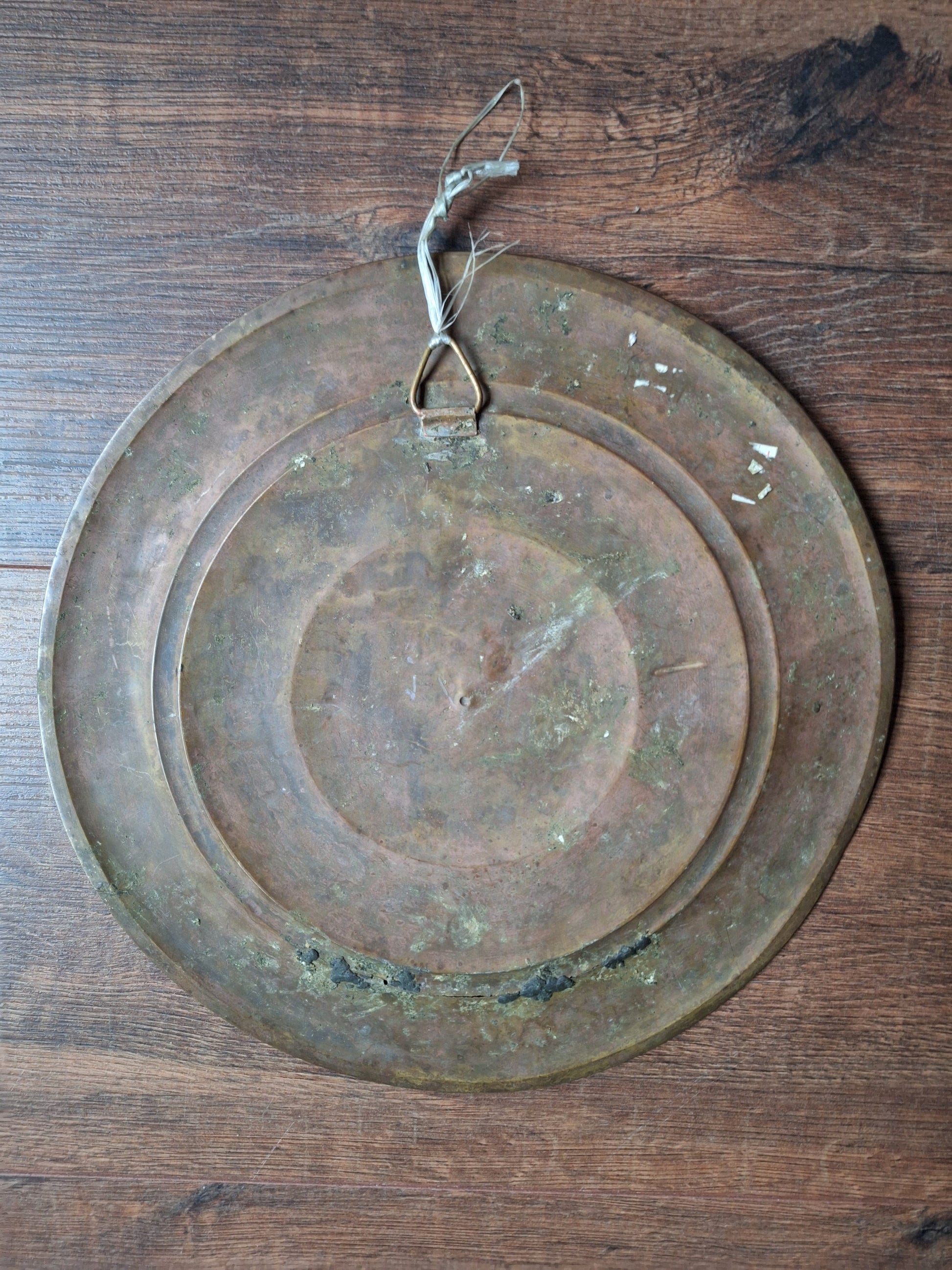 This wallhanger has quite some years of age to it already and, as can be seen on the pictures, over the years it has gained some damages and imperfections, most noteable of which is a crack between the inner circle and outer edge. This crack has been restored/stabilized by a previous owner, but can still be seen. But with its beautiful, elaborate decorations, this wallhanger is of course still a very nice piece to decorate your altar space or living room.