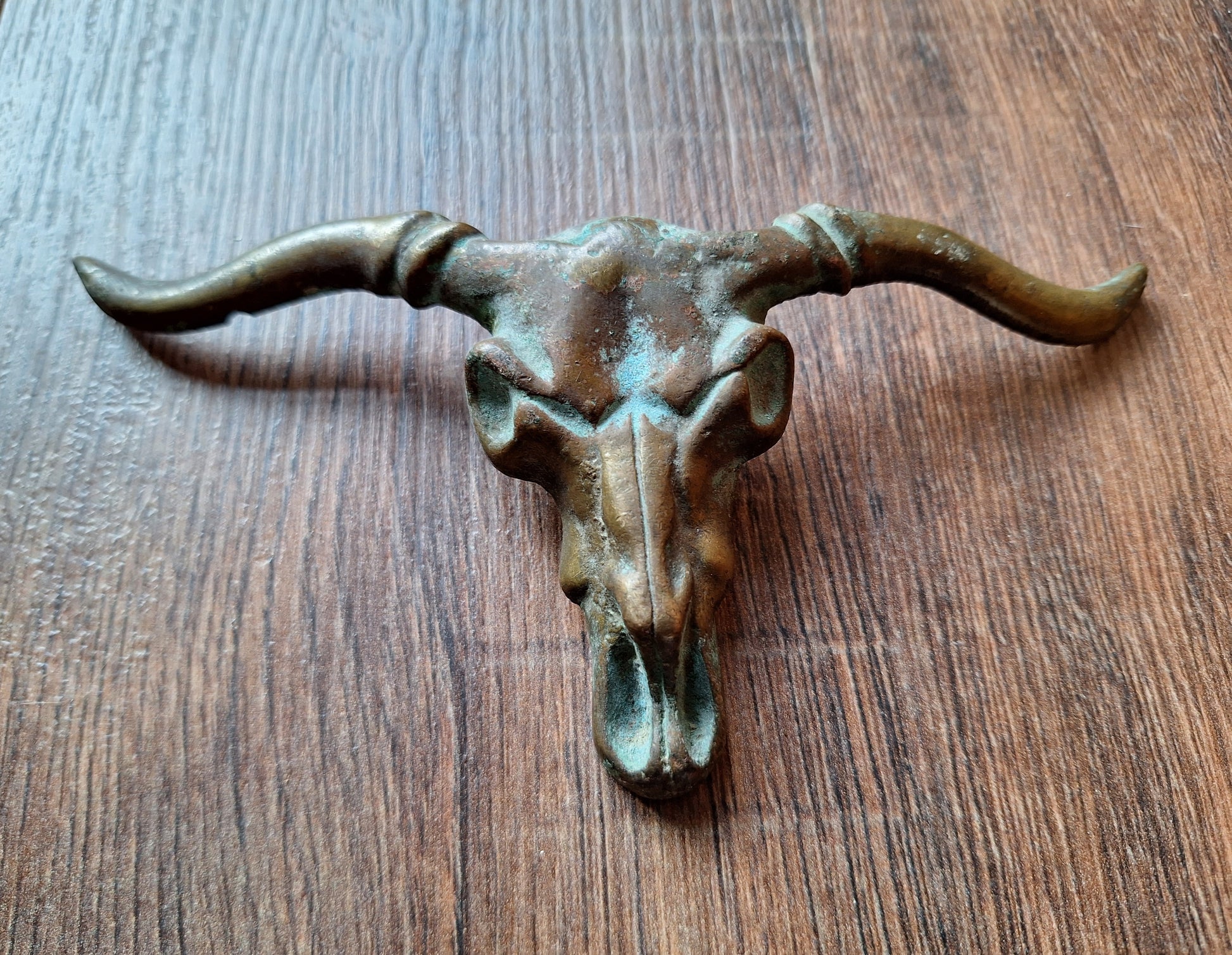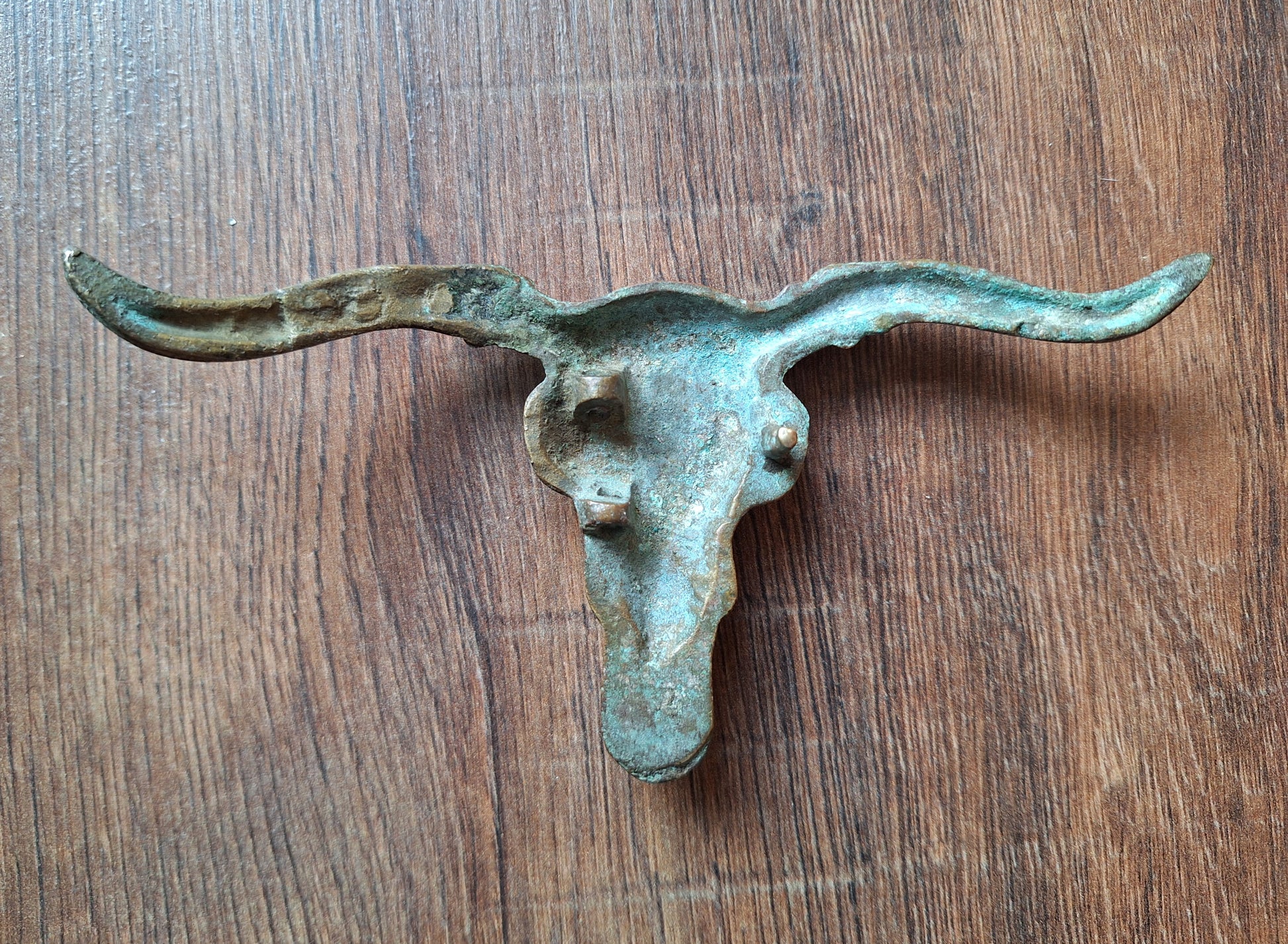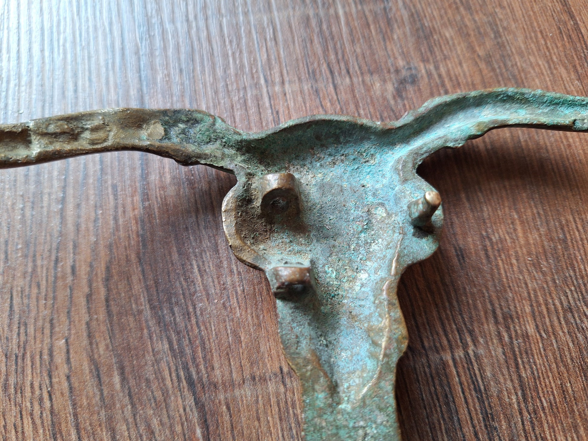 Please note; as can be seen on the pictures, the fixation pin on the backside has gone missing over time, so you will have to be a little creative if you want to turn it into an attachable buckle again. But of course this bull head can also be used for example as an altar piece or as an item for your personal crafting purposes.