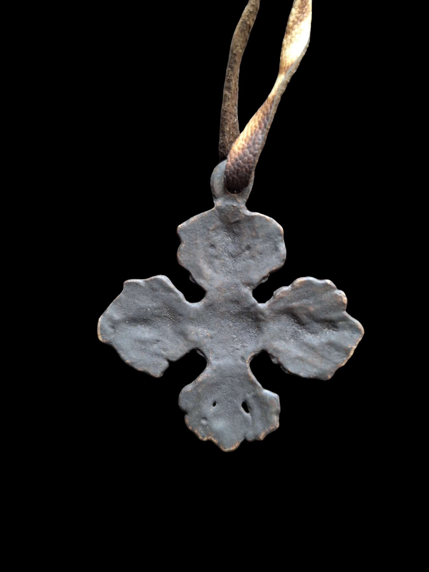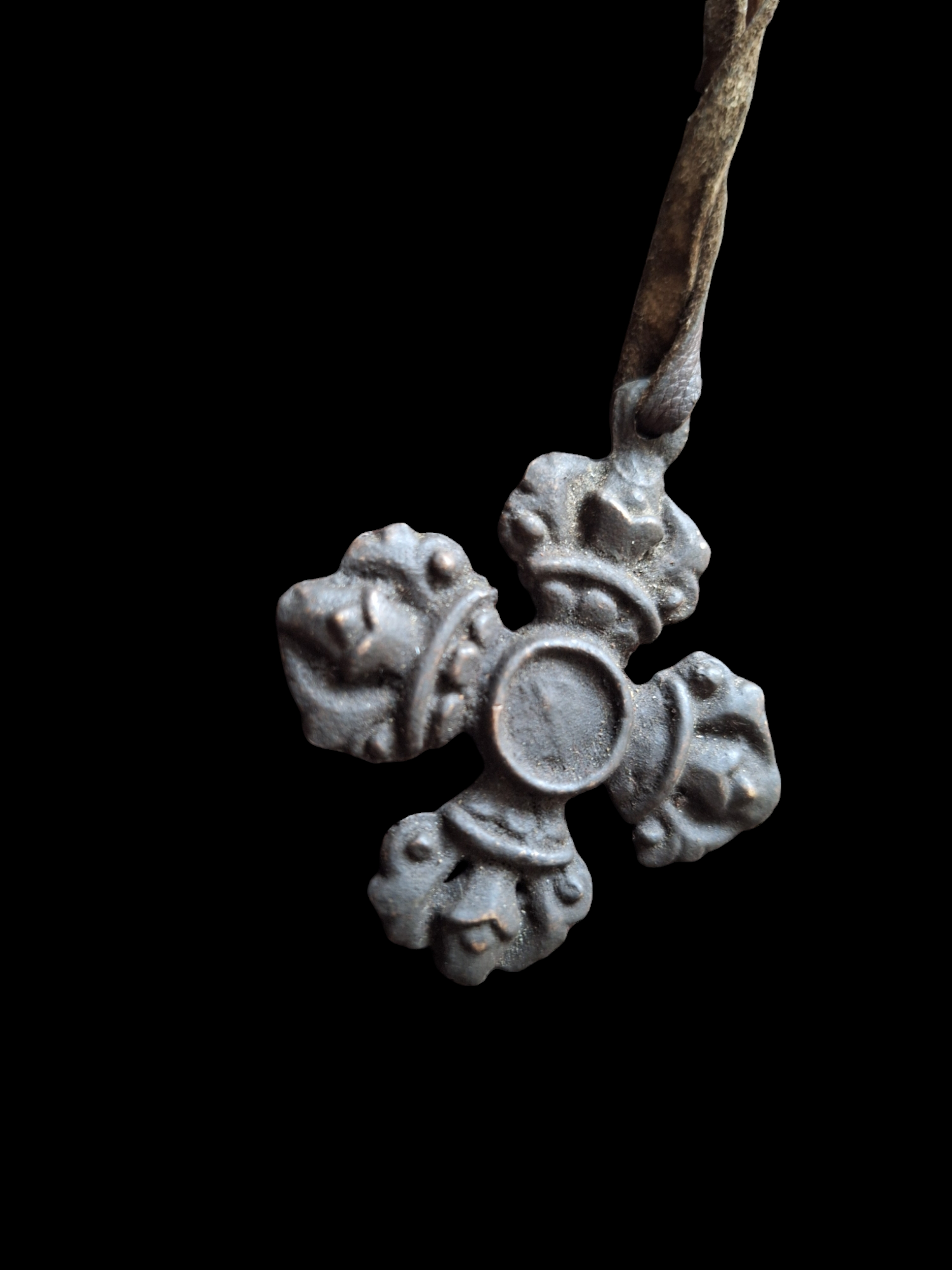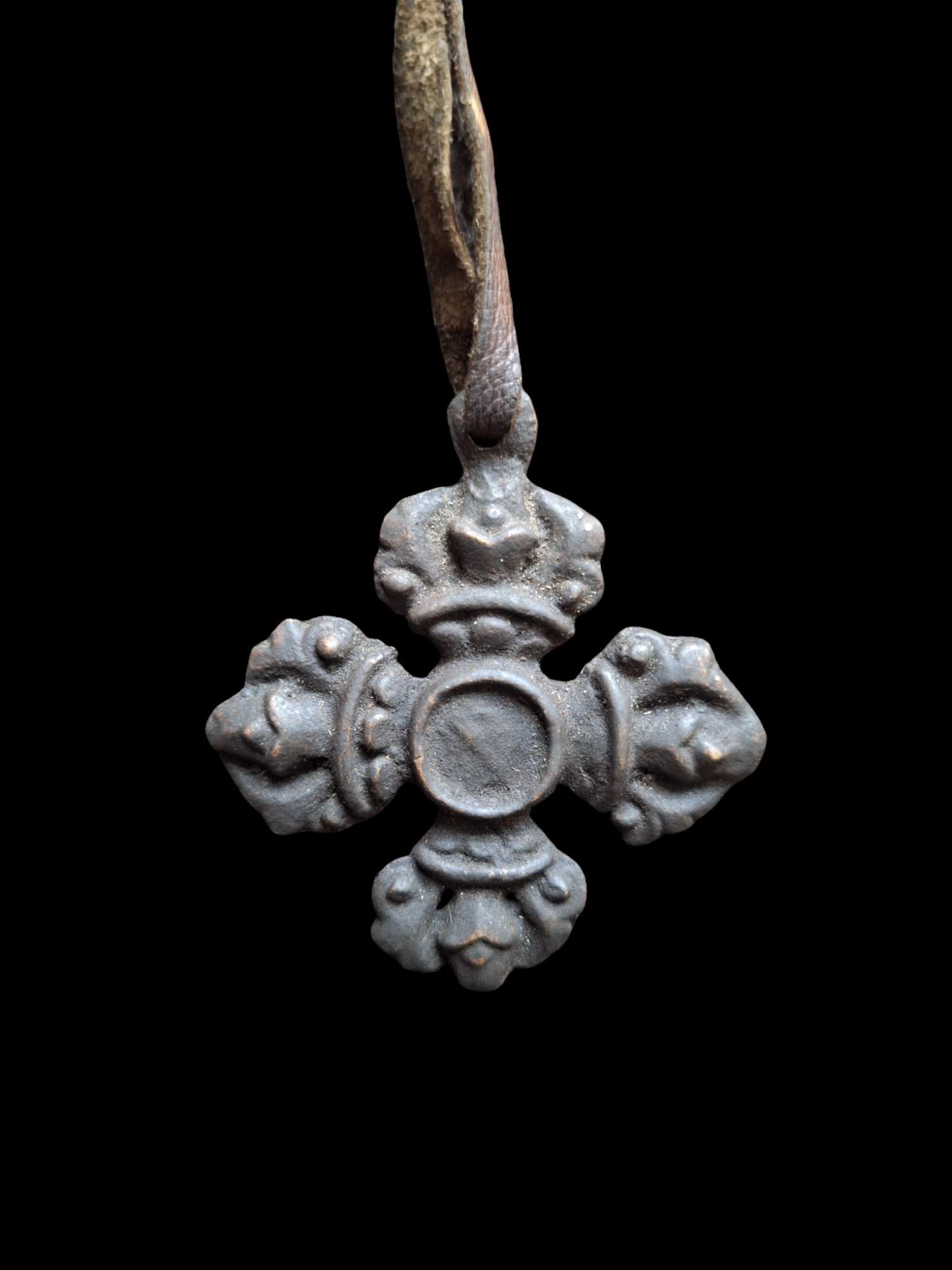 This bronze pendant is made to resemble an ancient 'thogchag' (or 'thokcha'). Thogchags are small metal objects, worn as amulets. Their history can be dated back thousands of years and the real thogchags are said to be made of meteorite iron (or at least a metal alloy which also includes meteorite iron) and have fallen from the sky or magically produced when a thunderbolt strikes the earth.