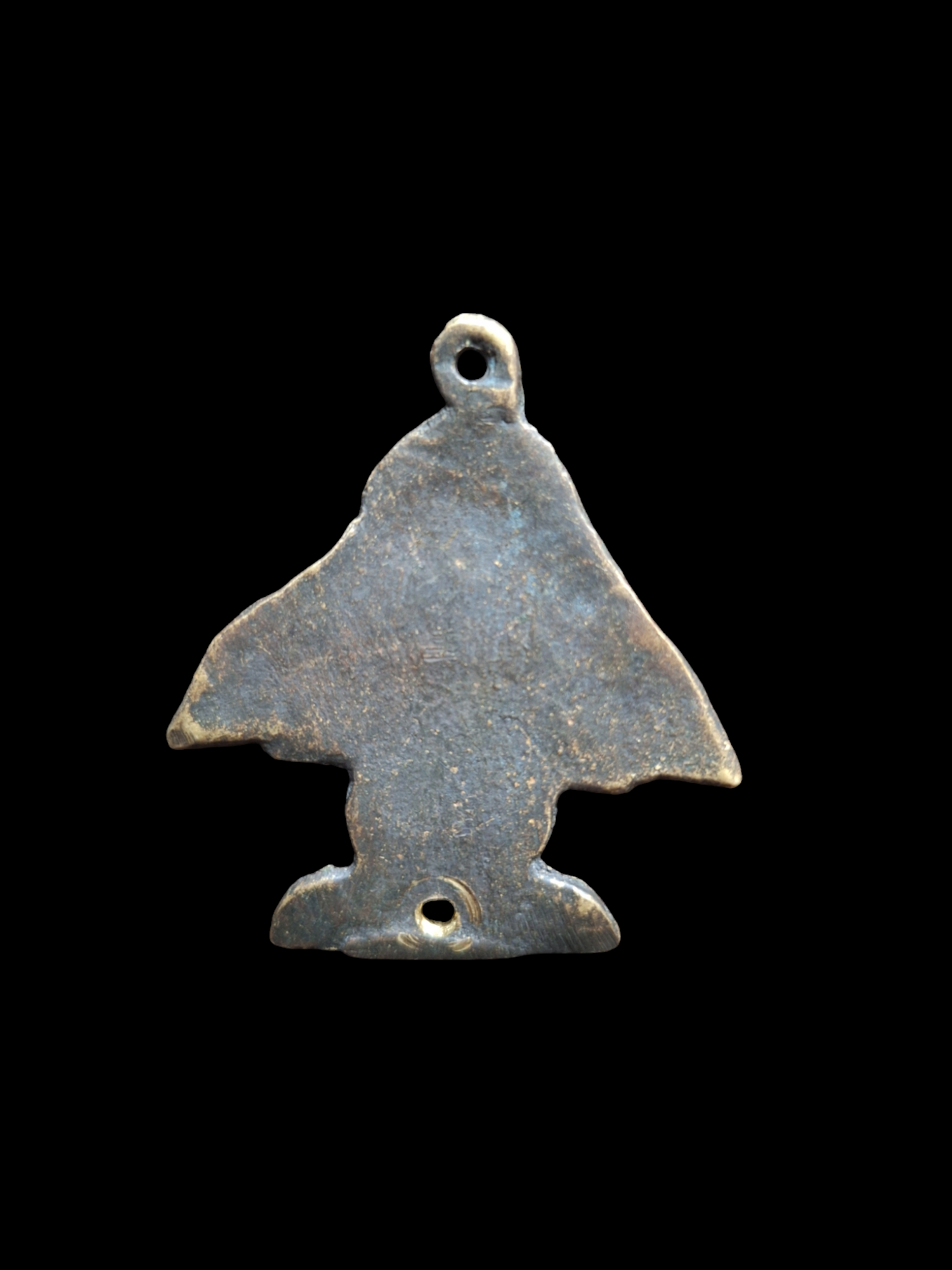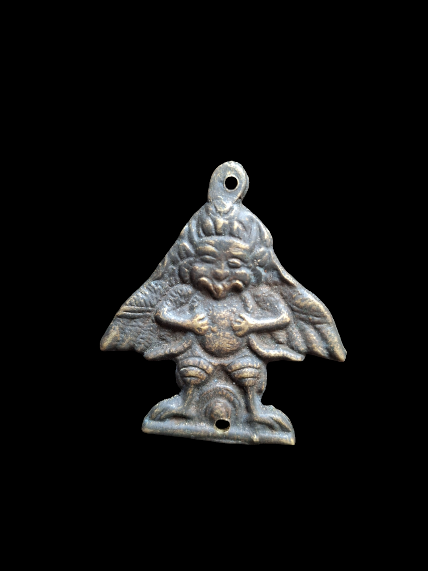 This Garuda pendant is a very old one. It comes from Nepal and is made from bronze which has gained a beautiful dark patina over the years. Size is approximately 55 millimeters high (including the eyelet) and 50 millimeters wide. It weighs 21 grams. This pendant has an eyelet on top, to wear it as a necklace, but also a small hole on the bottom, so it can also be strung as a spacer in rosaries and such.
