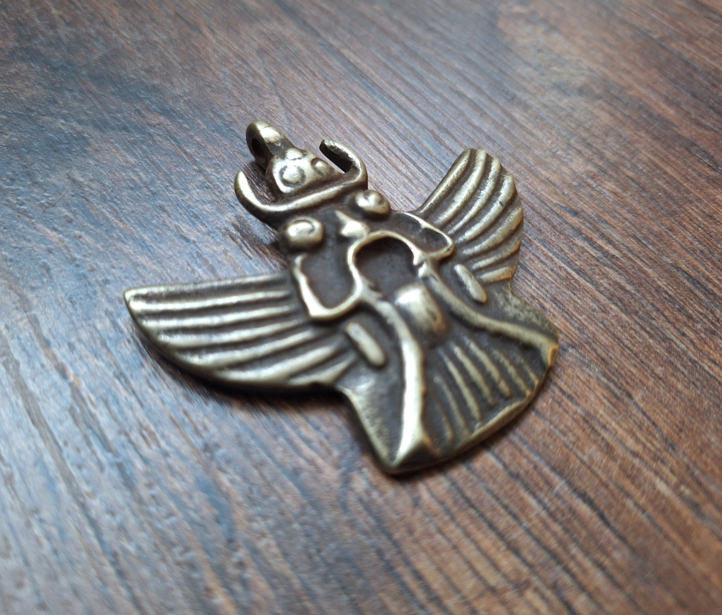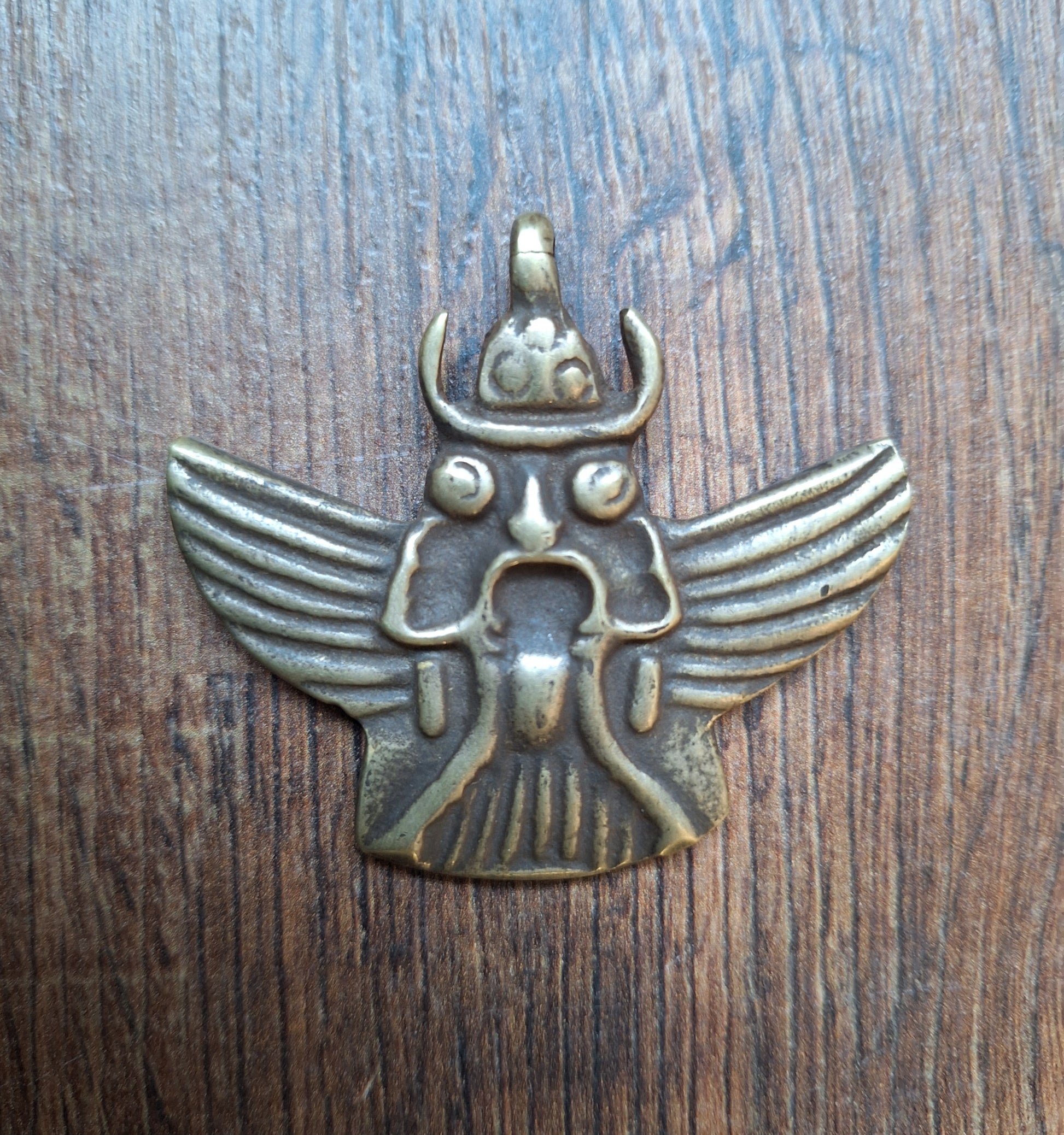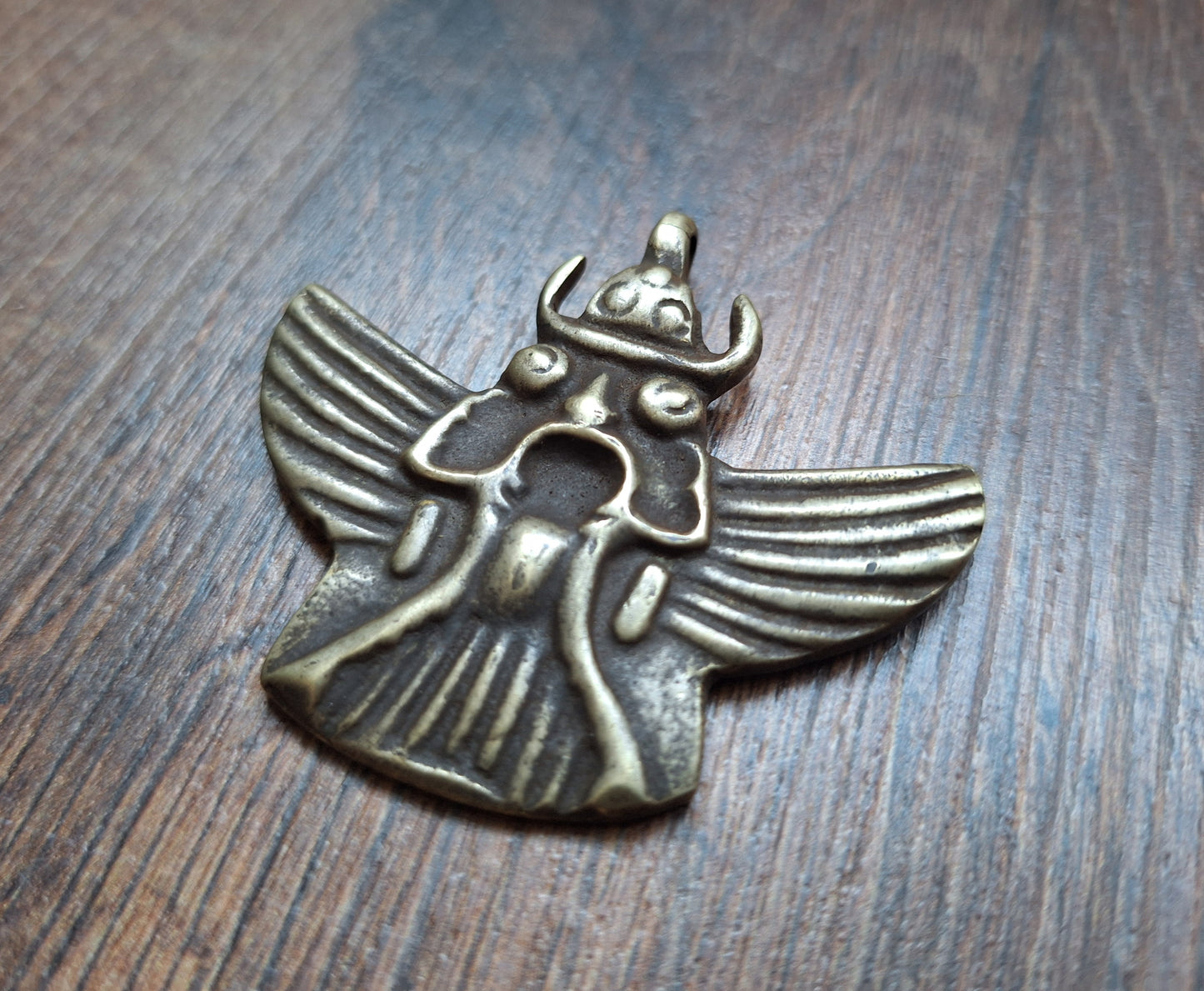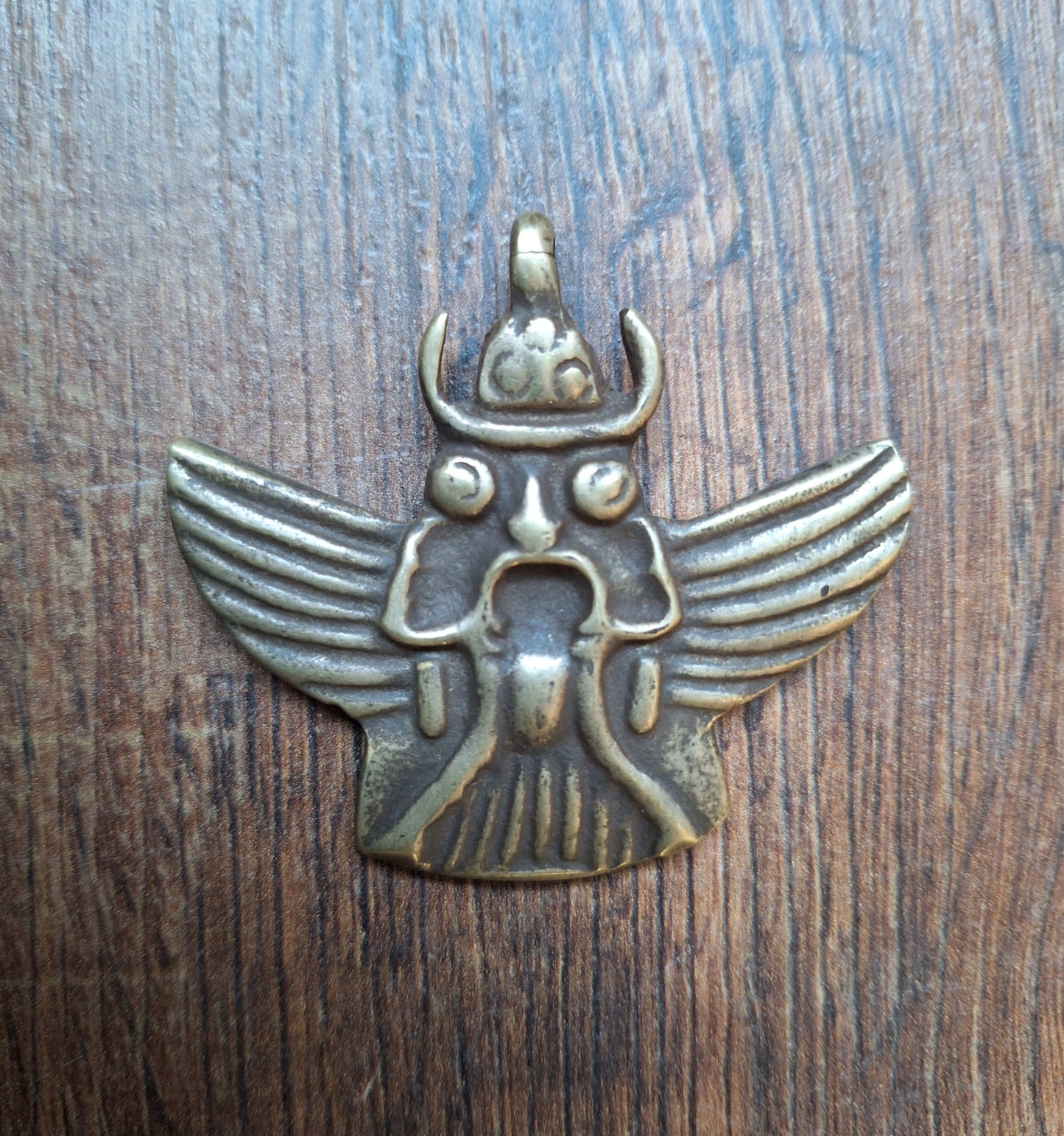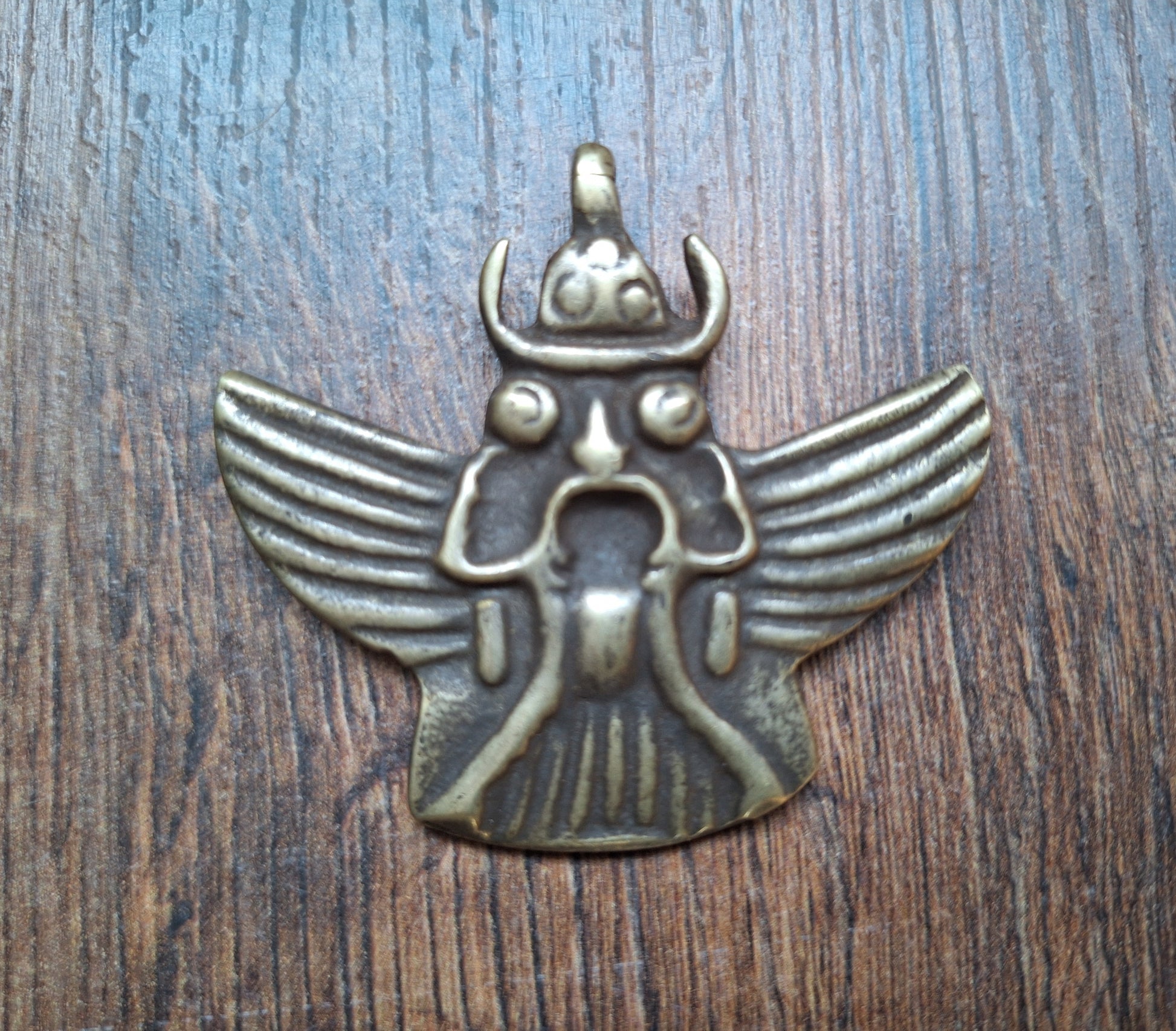 This Garuda pendant comes from Nepal. Size is approximately 55 millimeters high (measured including the eyelet) and 70 millimeters wide. It weighs 30 grams. Please note; as can be seen on the pictures, the eyelet from this pendant shows a little damage. For now however, this damage looks still stable and the eyelet can be used as such.