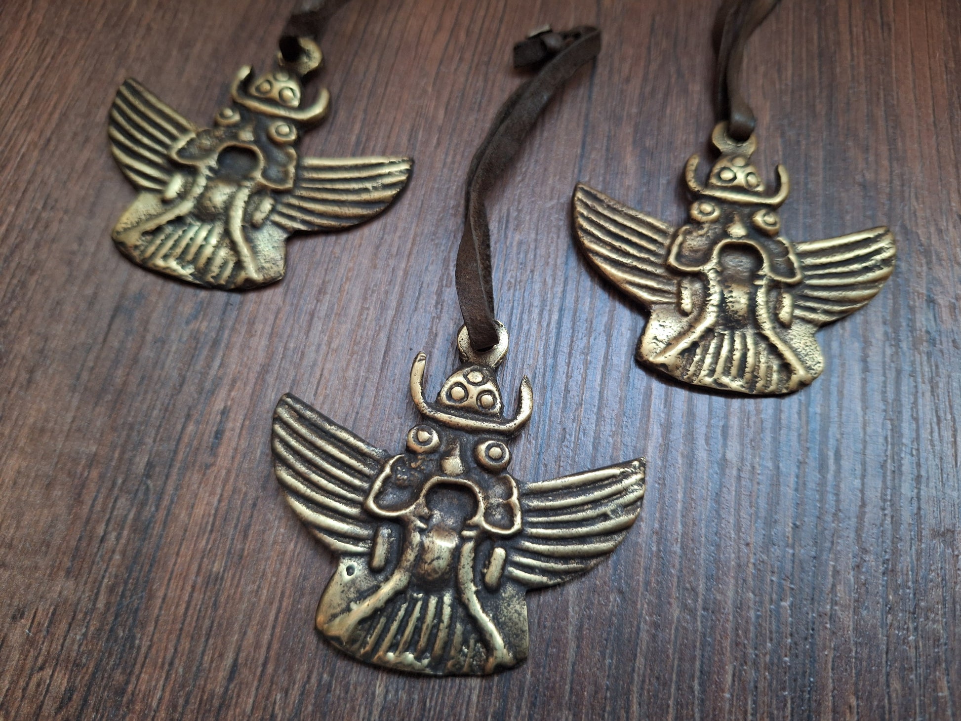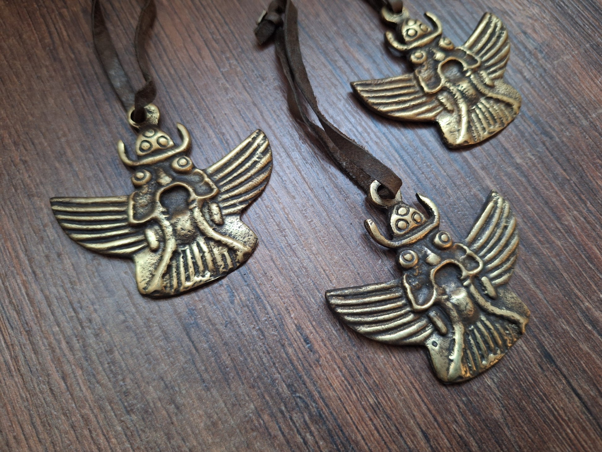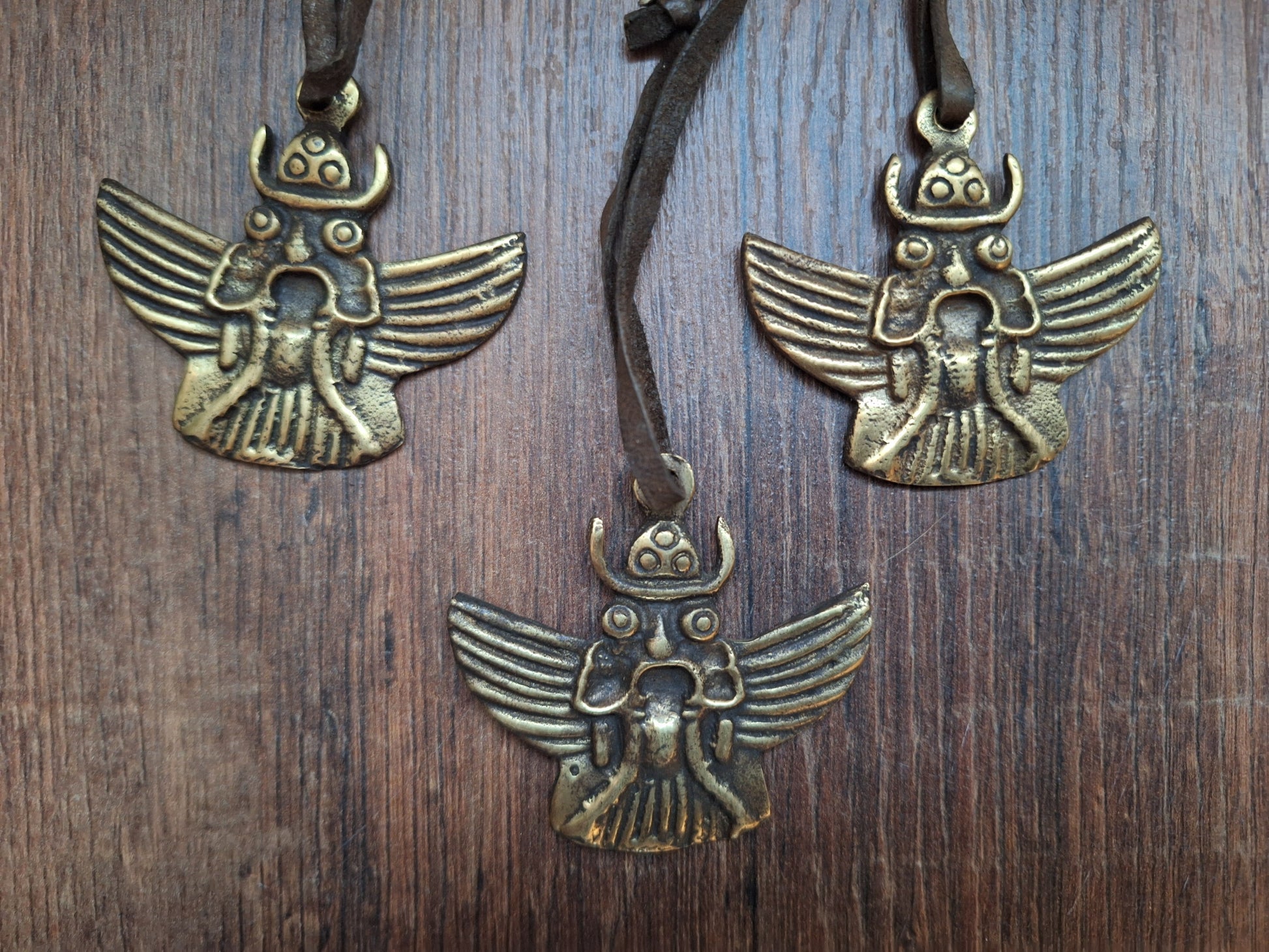 These bronze pendants are made to resemble an ancient 'thogchag' (or 'thokcha'). Thogchags are small metal objects, worn as amulets. Their history can be dated back thousands of years and the real thogchags are said to be made of meteorite iron (or at least a metal alloy which also includes meteorite iron) and have fallen from the sky or magically produced when a thunderbolt strikes the earth.