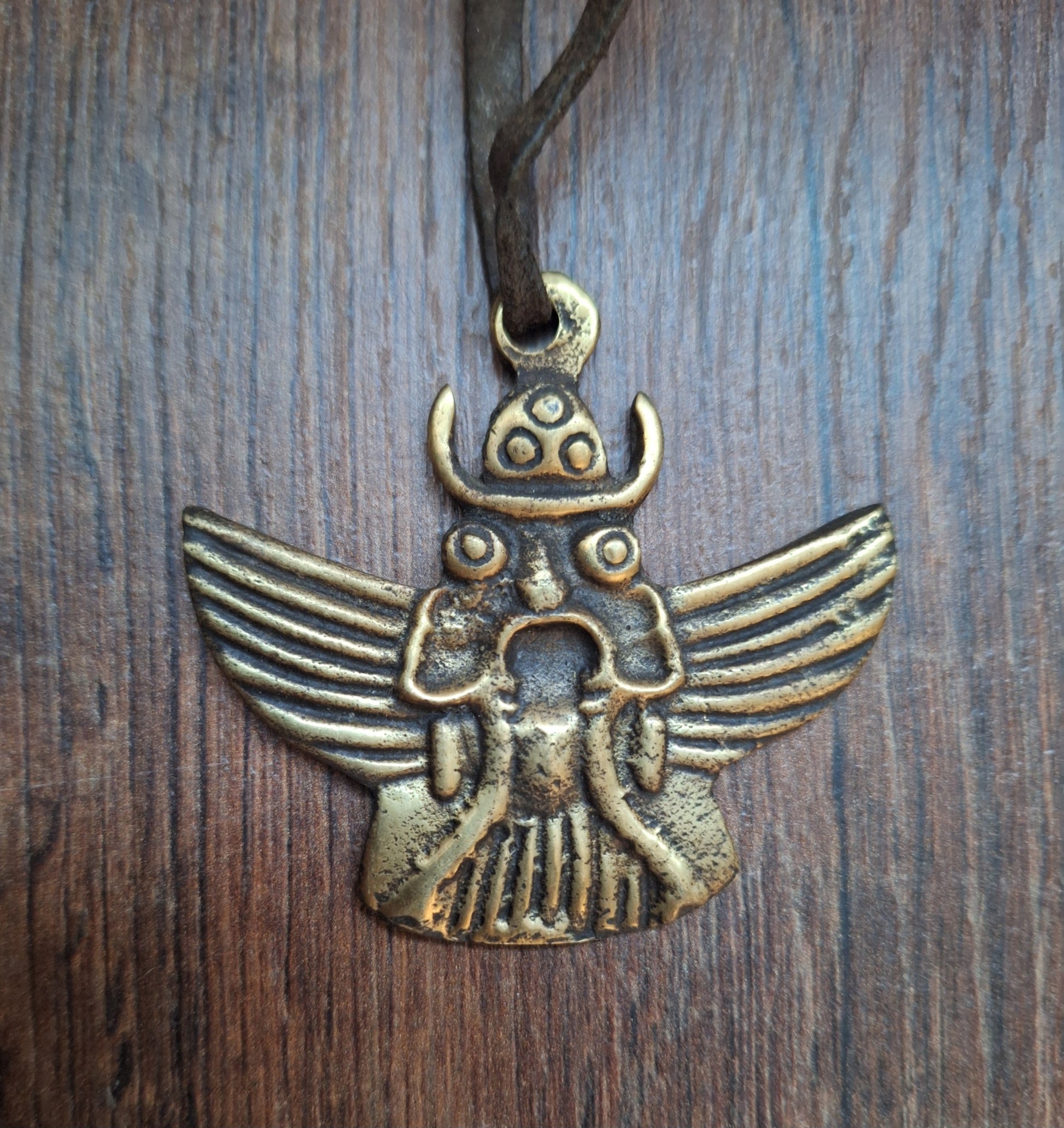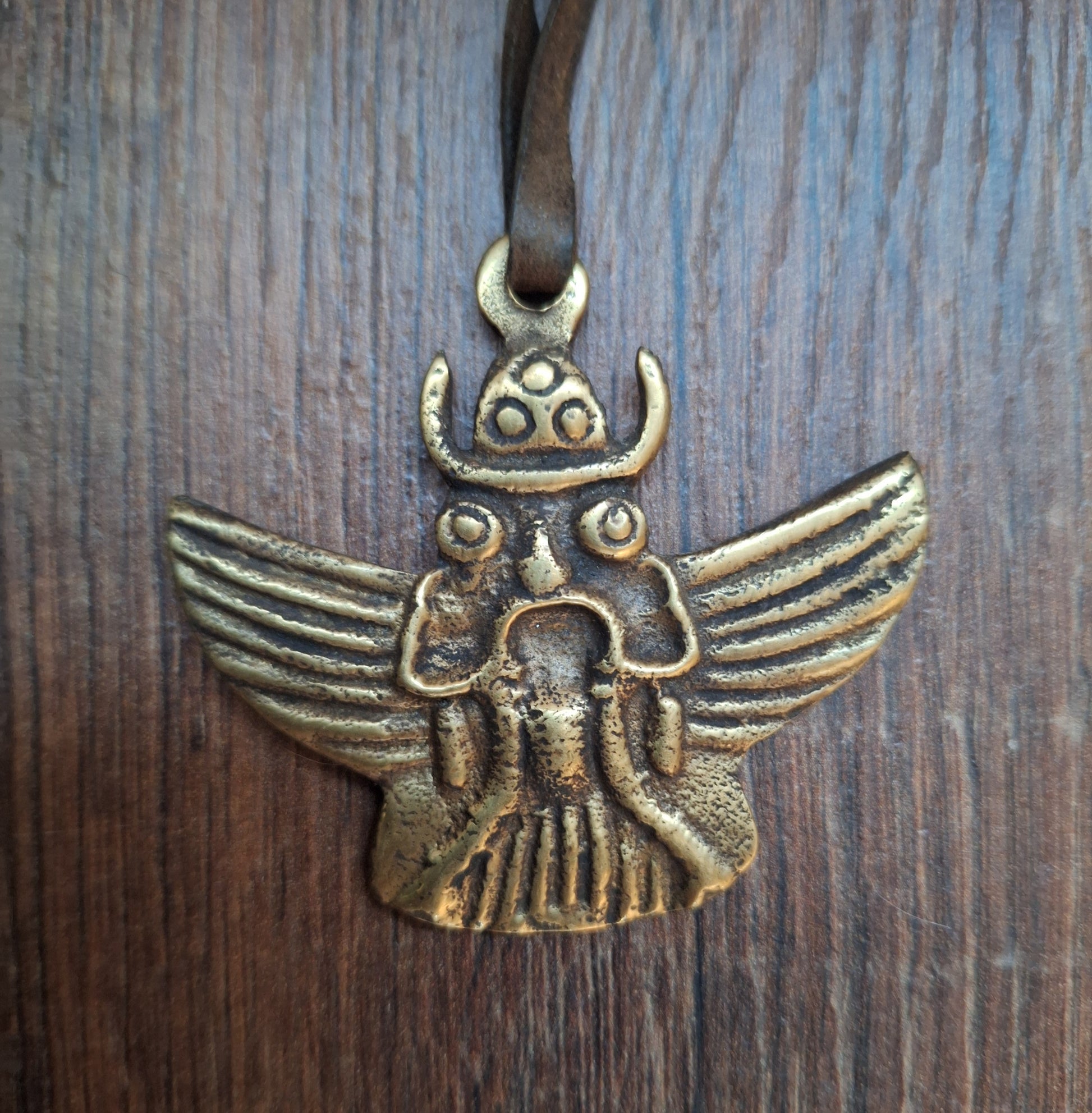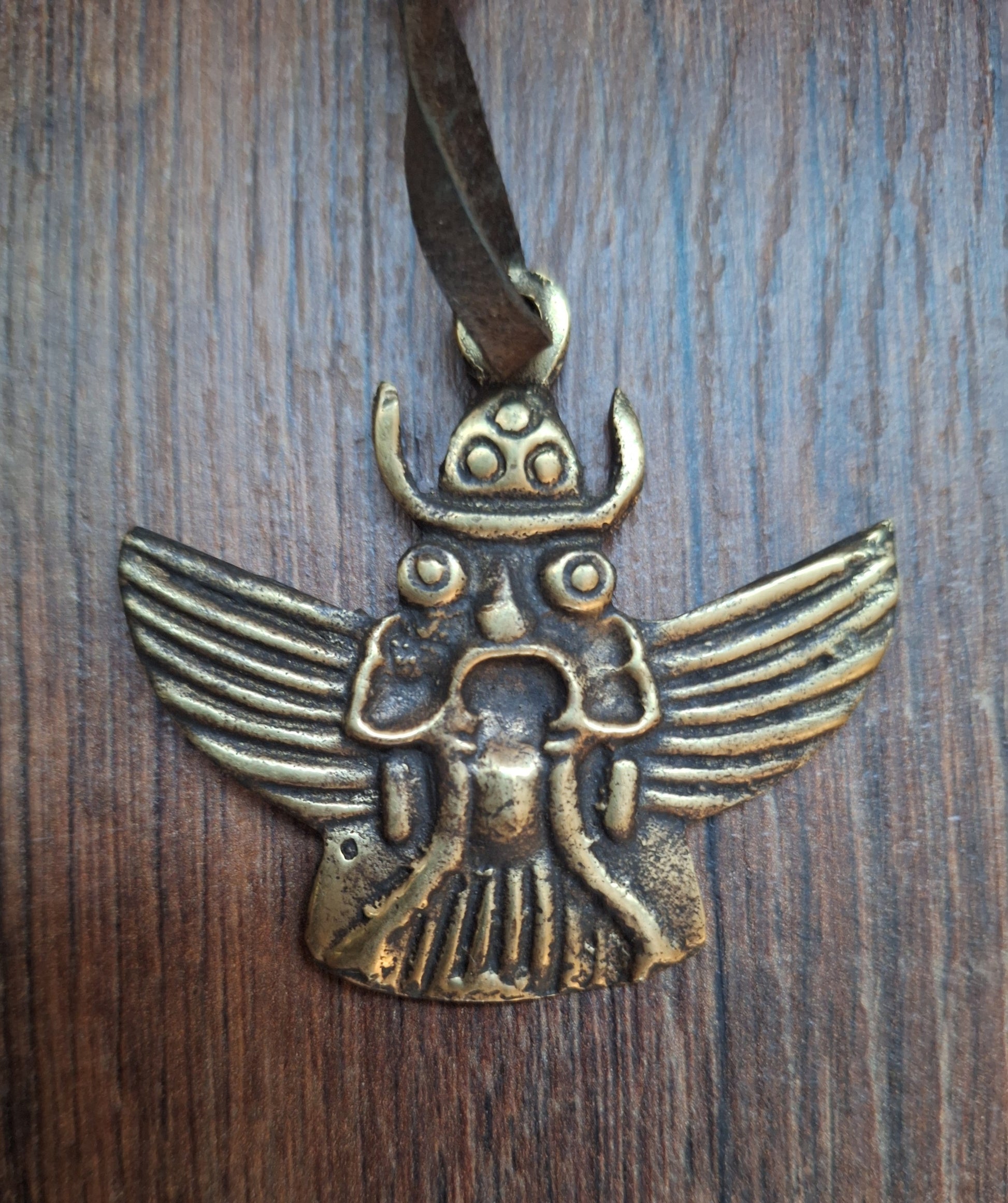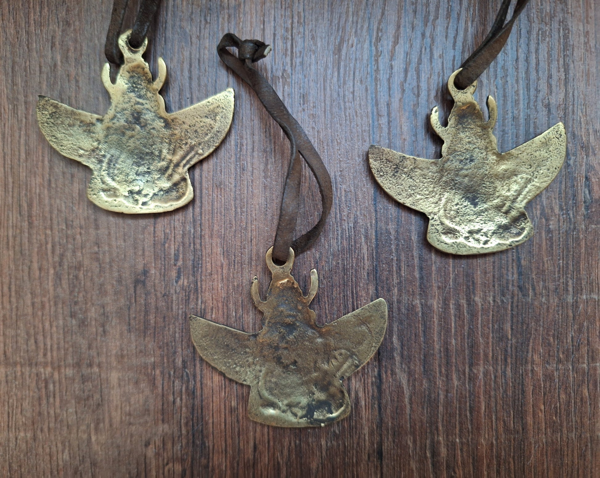 These bronze pendants are made to resemble an ancient 'thogchag' (or 'thokcha'). Thogchags are small metal objects, worn as amulets. Their history can be dated back thousands of years and the real thogchags are said to be made of meteorite iron (or at least a metal alloy which also includes meteorite iron) and have fallen from the sky or magically produced when a thunderbolt strikes the earth.