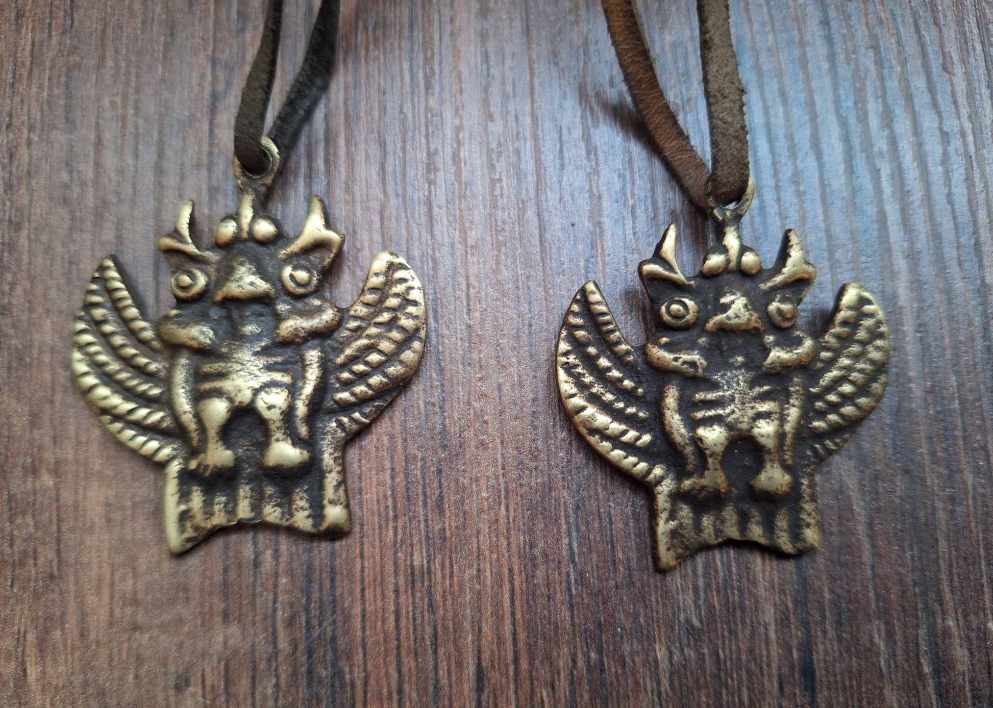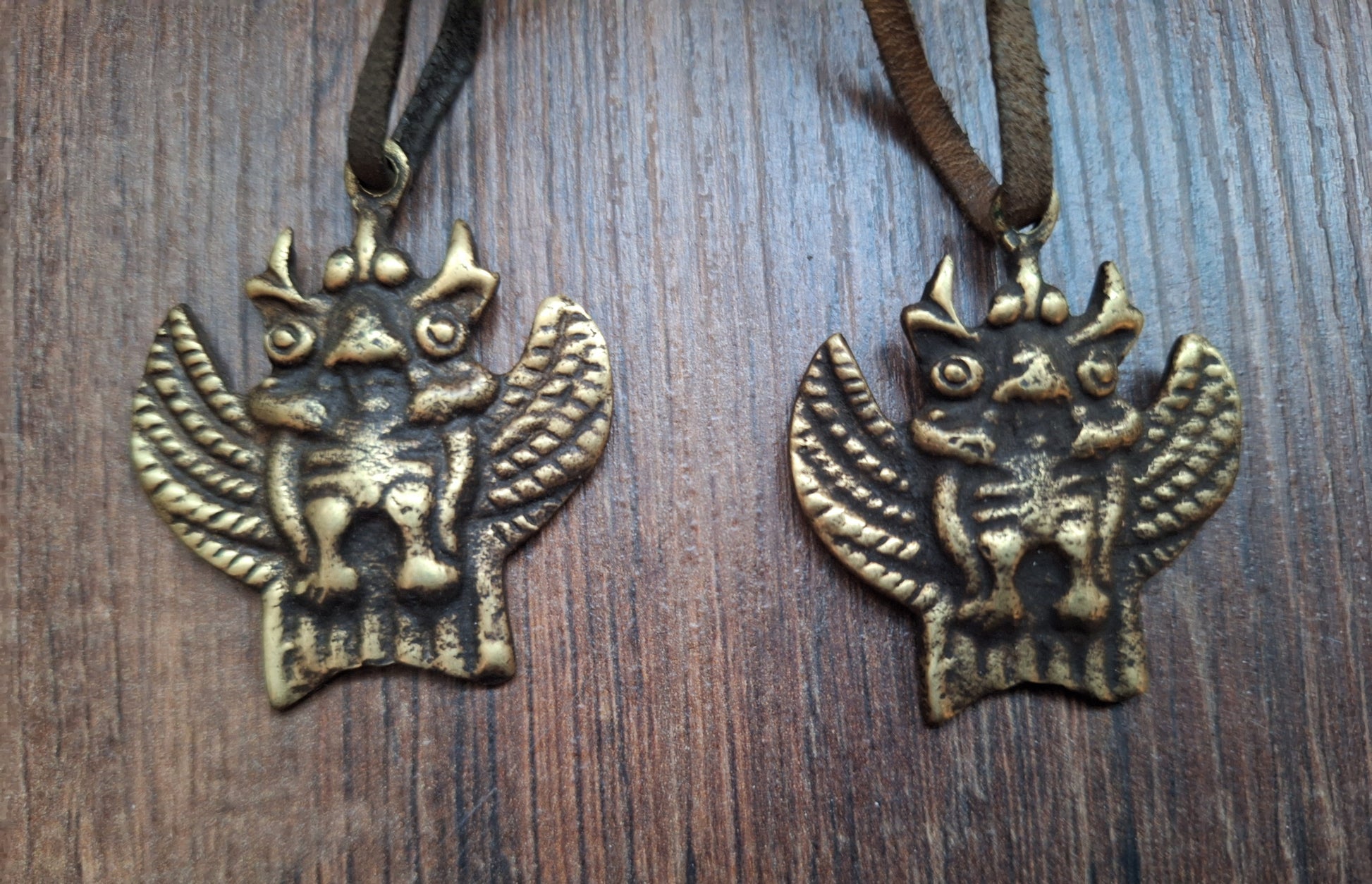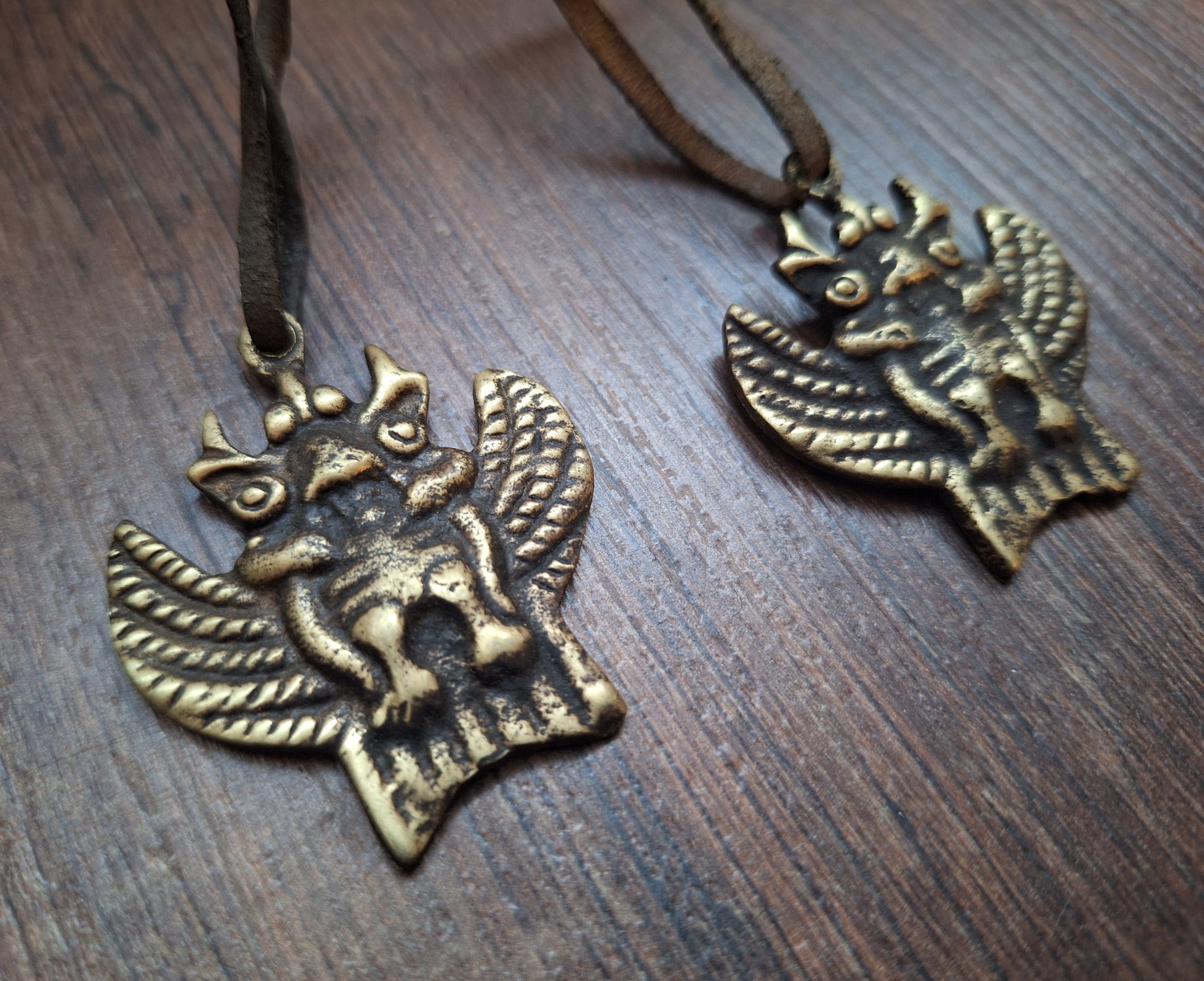 These bronze pendants are made to resemble an ancient 'thogchag' (or 'thokcha'). Thogchags are small metal objects, worn as amulets. Their history can be dated back thousands of years and the real thogchags are said to be made of meteorite iron (or at least a metal alloy which also includes meteorite iron) and have fallen from the sky or magically produced when a thunderbolt strikes the earth.