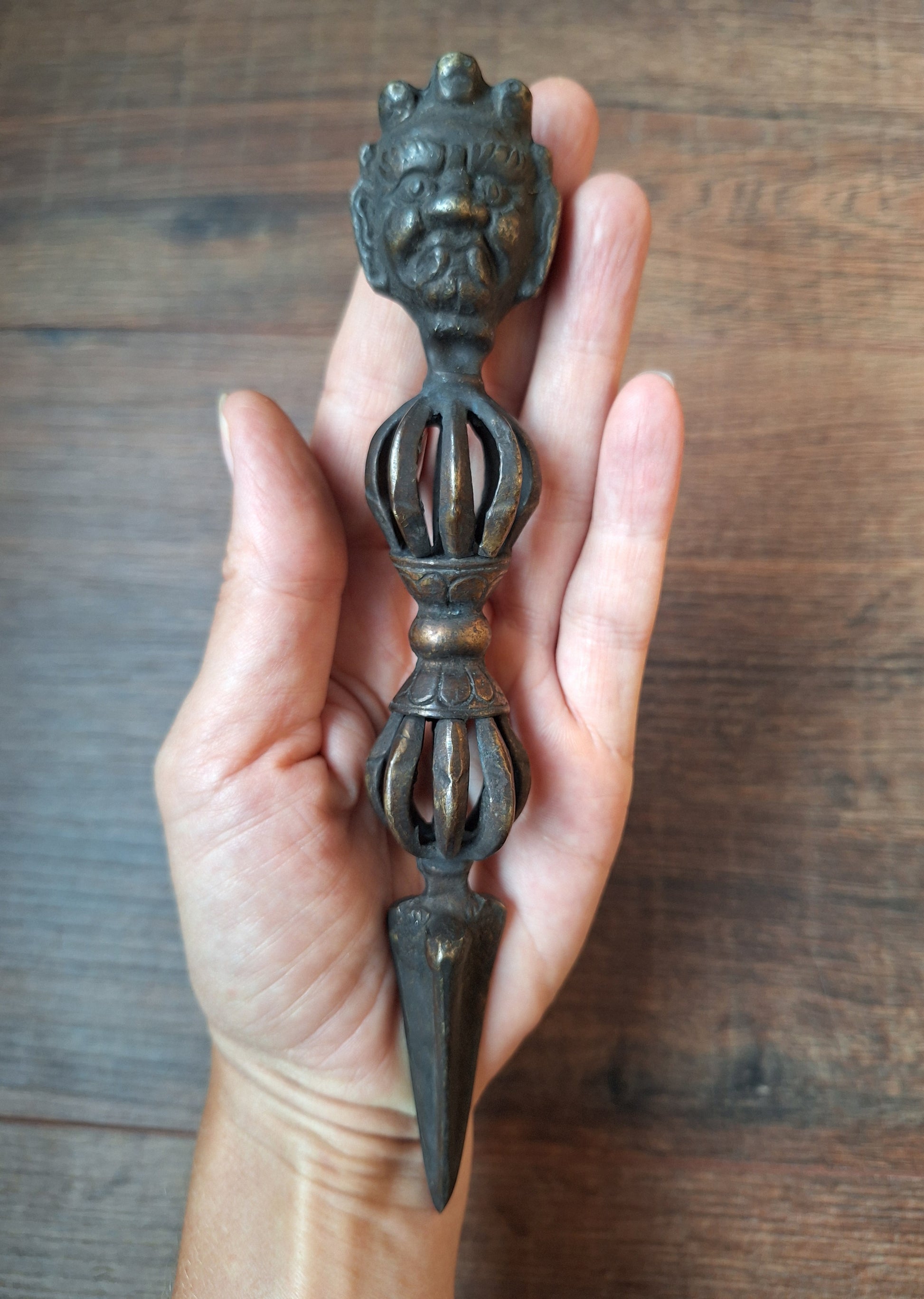 Old bronze phurba from Nepal. This phurba has quite some years of age to it already and shows some signs of this. But overall it is still in very good condition. Over the years, the bronze has beautifully darkened and gained some patina.
