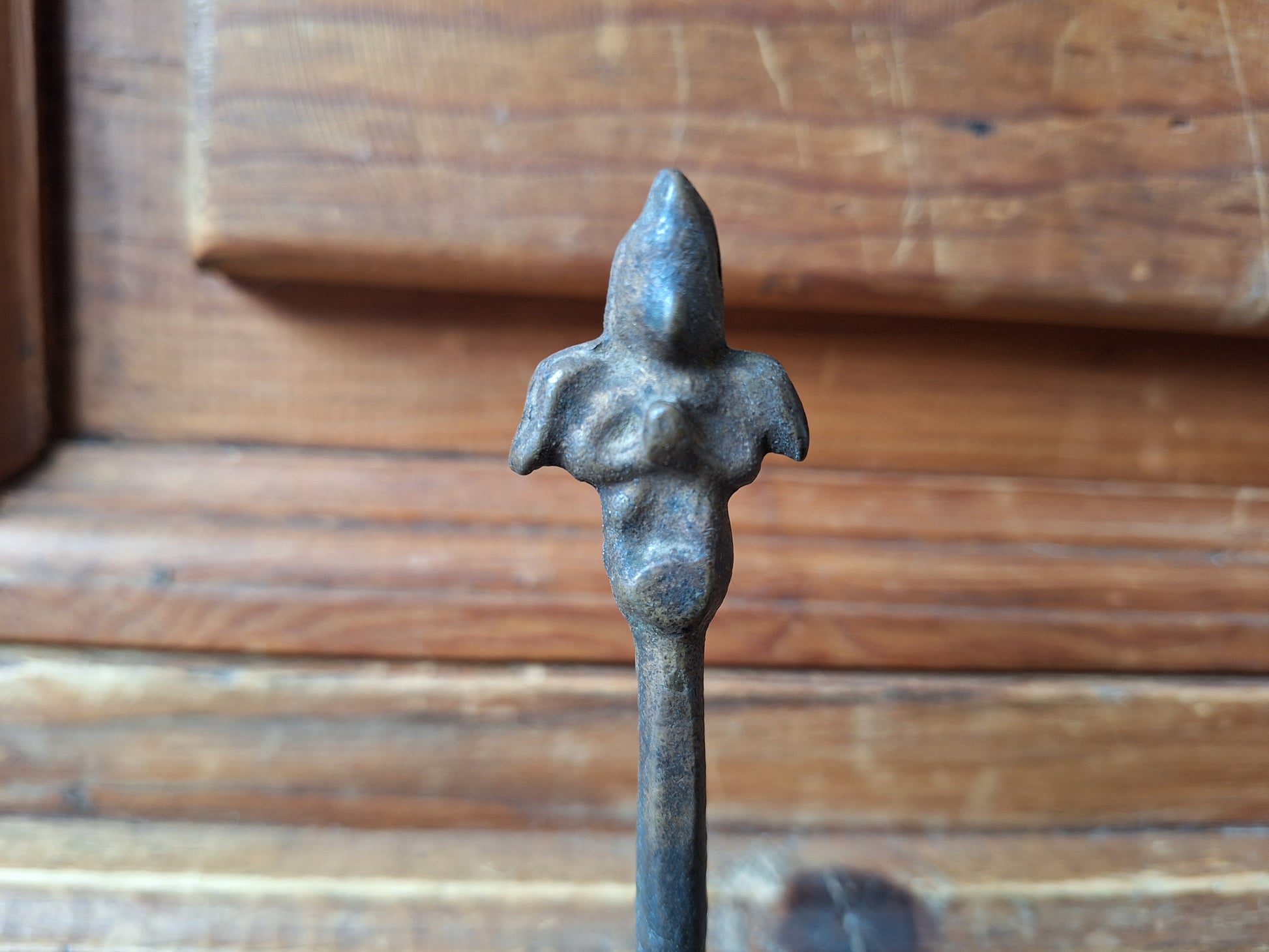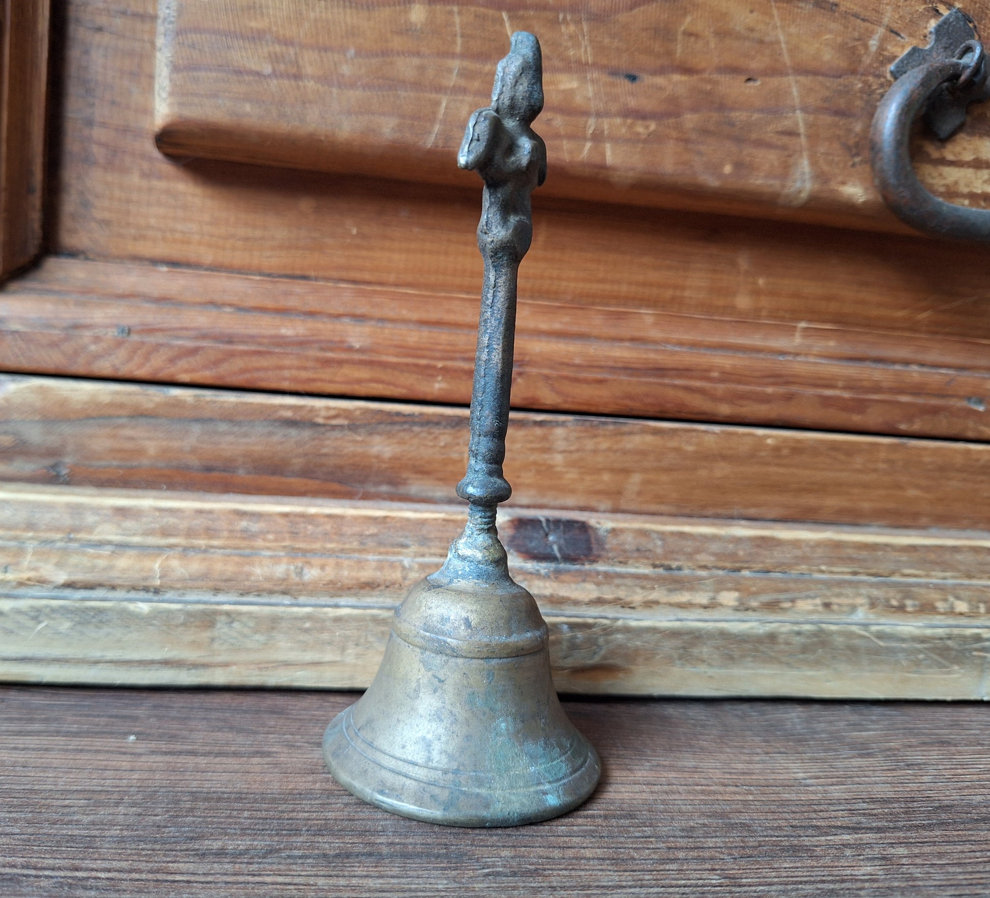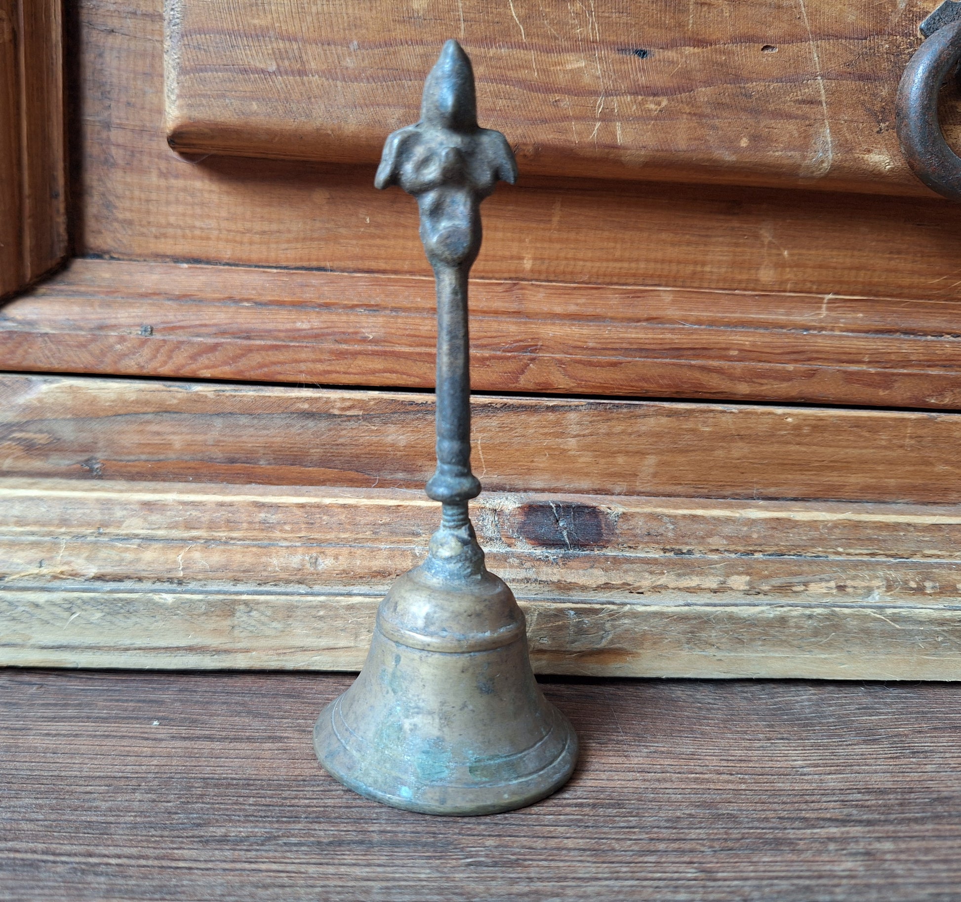 This somewhat smaller sized altar bell comes has been made in India or Nepal, where they are especially used for Hinduist (daily) pooja rituals, that can take place both as community ceremonies in temples as in smaller family or individual settings at the home altar. They are intimate moments of personal worship and connection to the gods and spirits. The bell is rang to start and end the ritual, or even continuously during the ritual. Traditionally they are held in the left hand, while the right hand places the offerings on the altar. This beautiful old bell shows a depiction of Garuda at the handle; the part man - part eagle Hindu God whose image has spread all over Asian territories and (spiritual/religious) traditions.