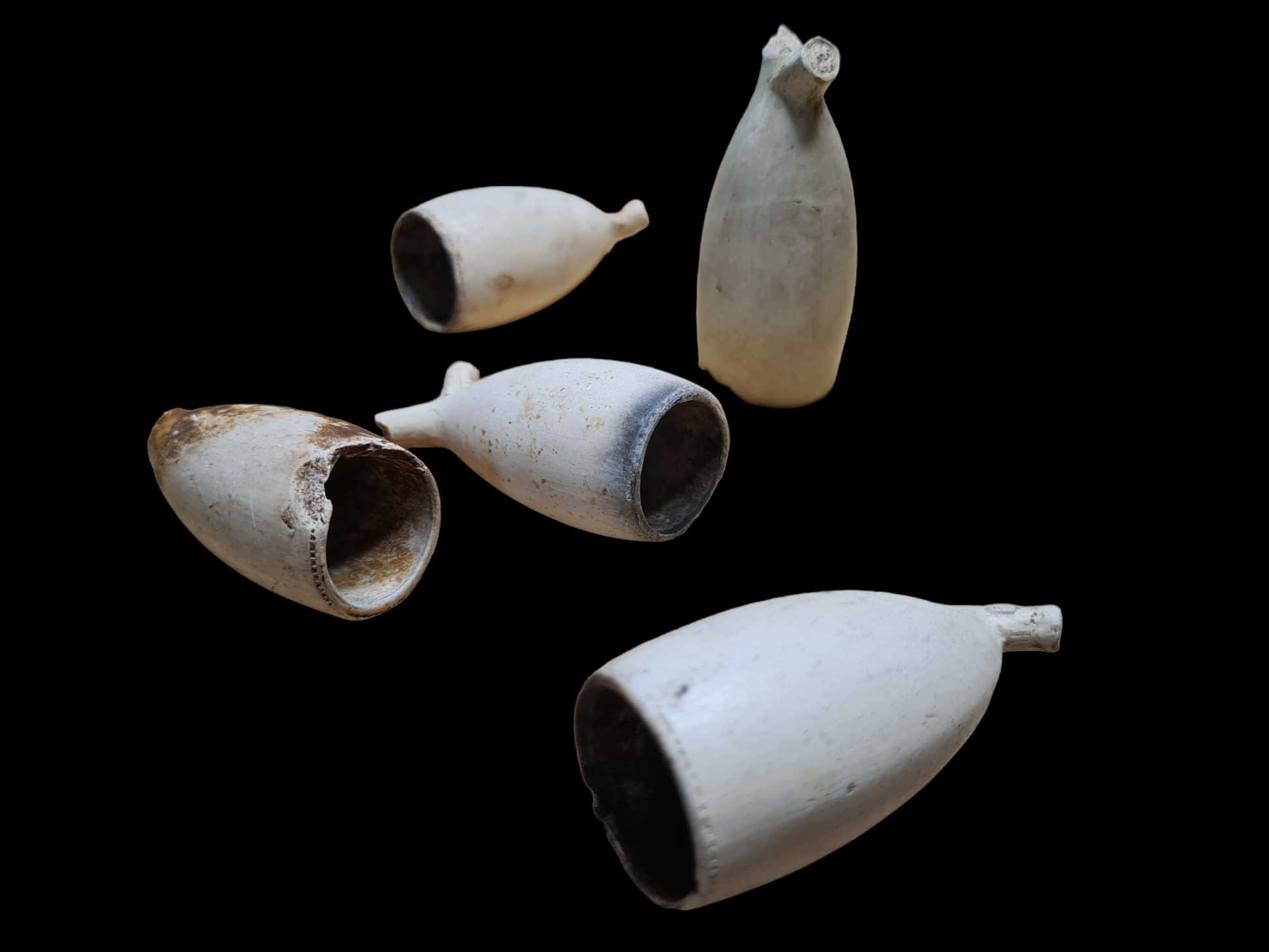 These pipe heads come from those glorydays of Gouda's pipe-manufacturing, they are hundreds of years old, and (as can be seen by the well-smoked interiors of the cettles) have been used for smoking.