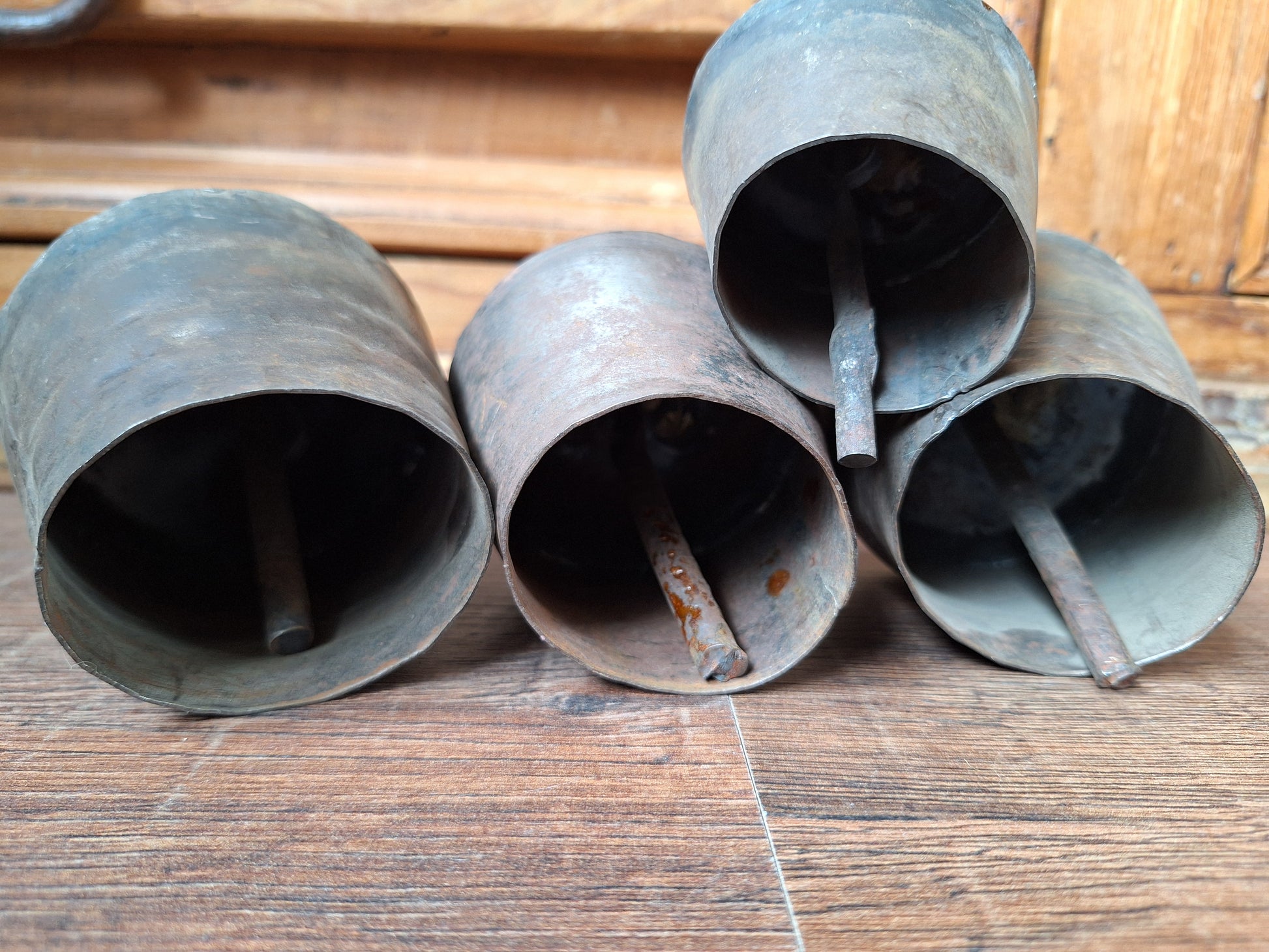 Old iron yak bells from Nepal, in a simple, handmade, traditional design. Bells like these are hung around the necks of the cattle for practical purposes; to help the herder locate the animals and alert passers-by on their presence.