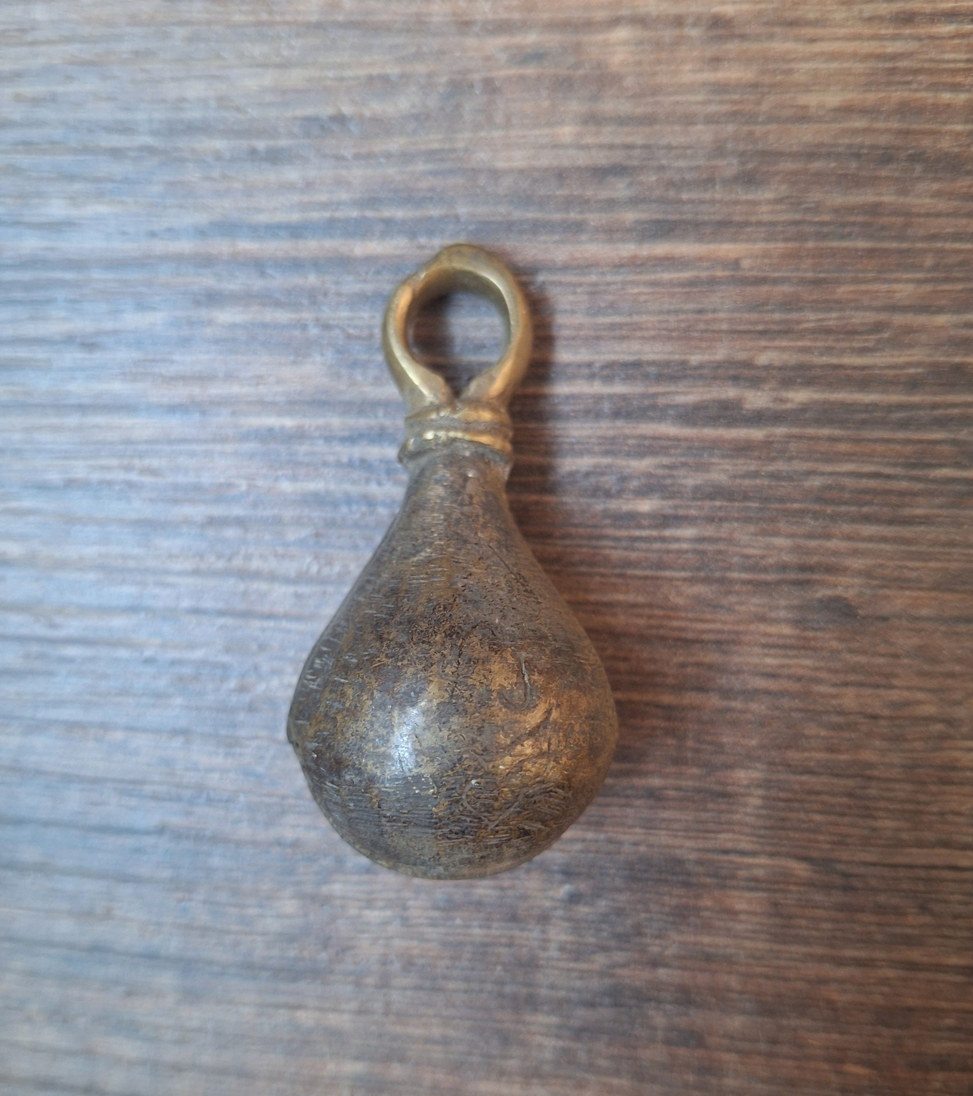 #1; 34 grams, 25 millimeters diameter measured without the eyelet and 45 millimeters high measured including the eyelet. This one is made of brass.