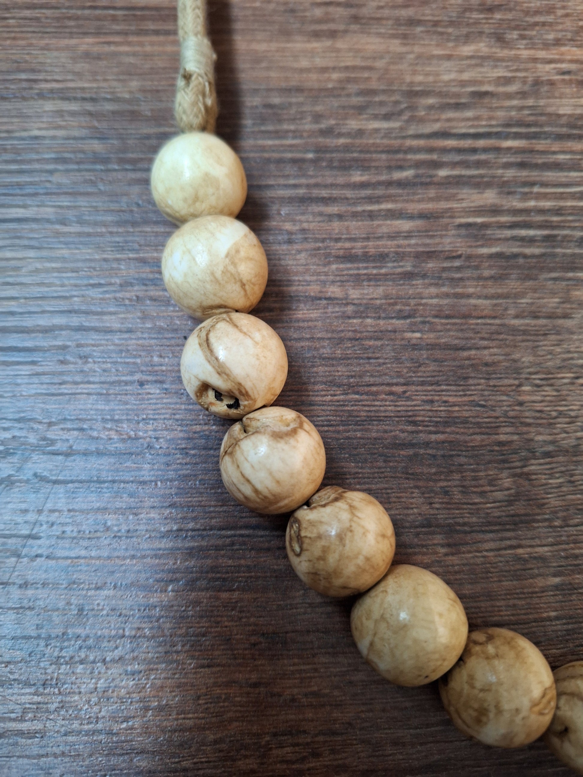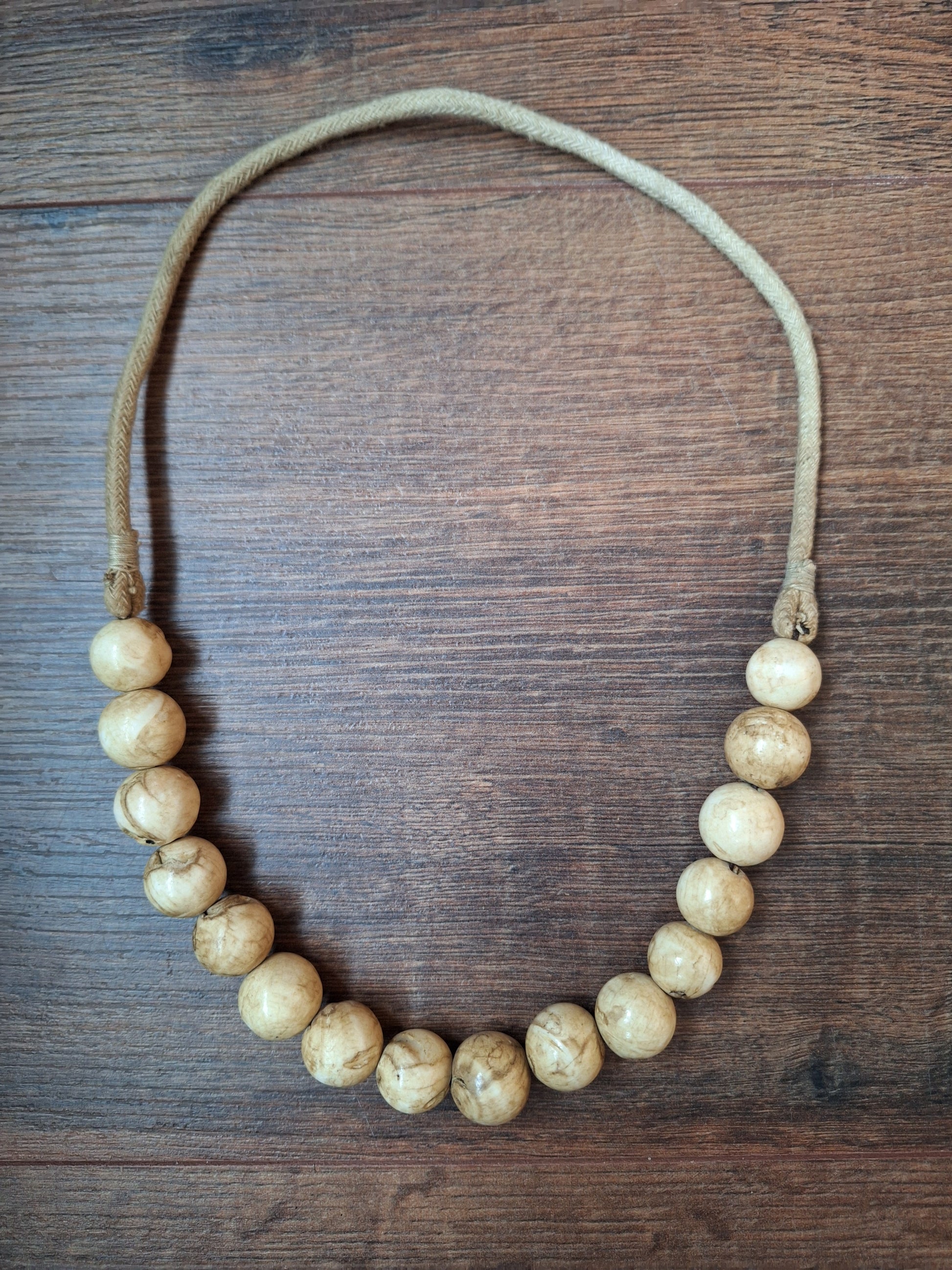 The beads have been strung on beige cotton cord. Total length of the necklace is approximately 68 centimeters.