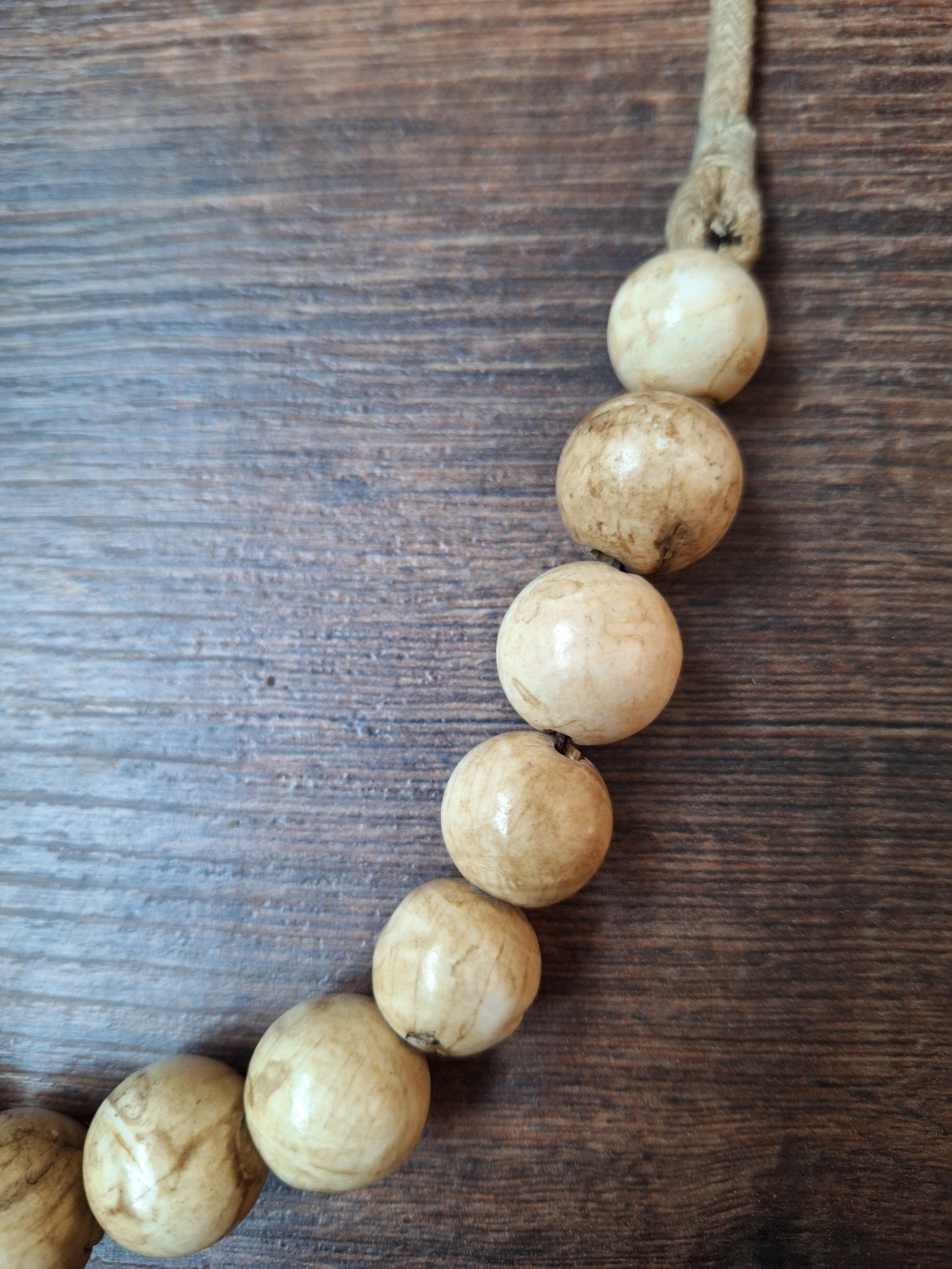 Beautiful old Nepalese necklace made with 16 beads carved from conch shell. In some of the beads the spiraling shell-structure can still be very well seen.