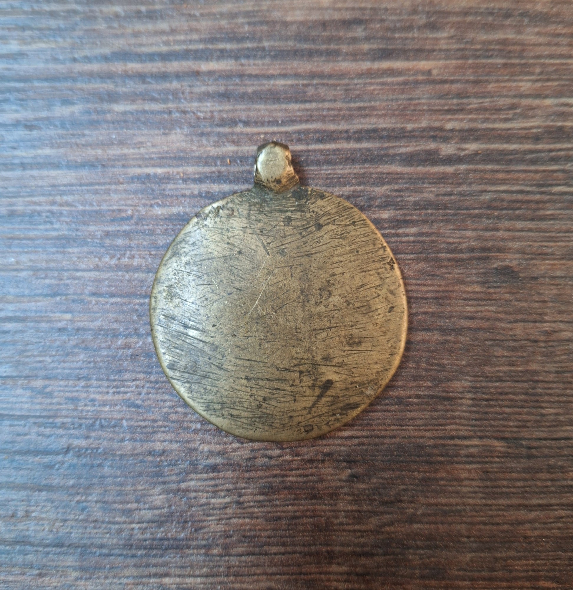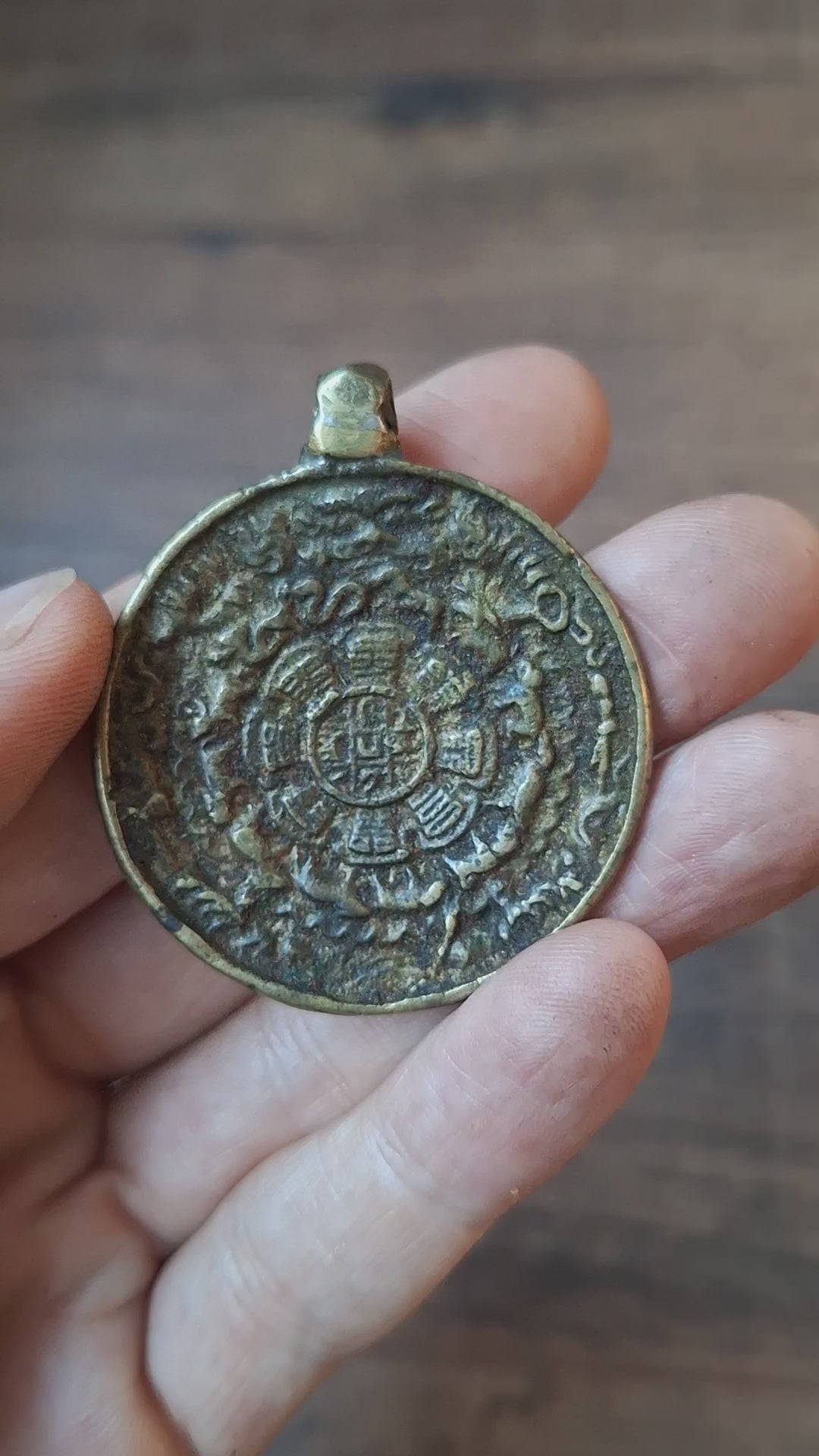 Old bronze mirror from Nepal, with a diameter of 42 millimeters (measured without the eyelet) and a weight of 23 grams. In Nepal, mirrors such as these are called 'melong'. They are traditionally often worn on the belt, instead of around the neck.