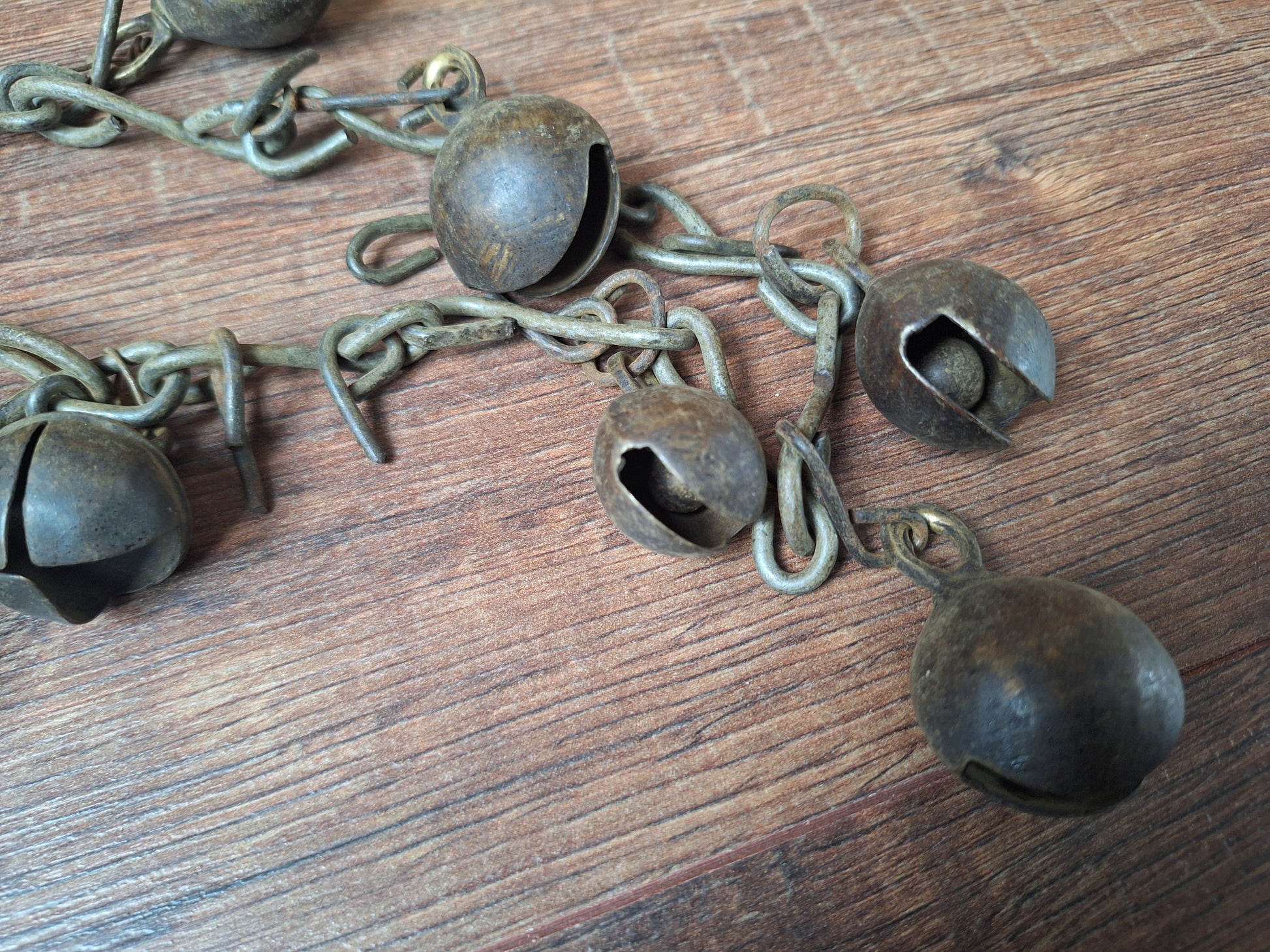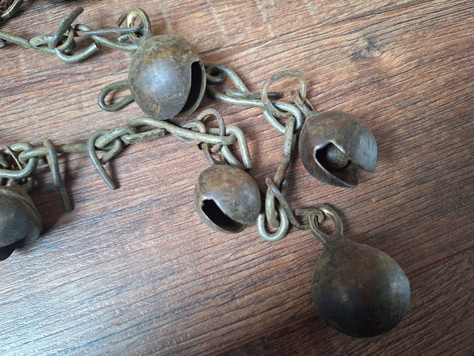 The bells vary in size between 25 - 33 millimeters diameter. Total length of the chain is approximately 96 centimeters, total weight is 720 grams. On the chain some extra / (now) empty hooks can be seen. They might have been used to attach extra bells, amulets or eerens to the chain.