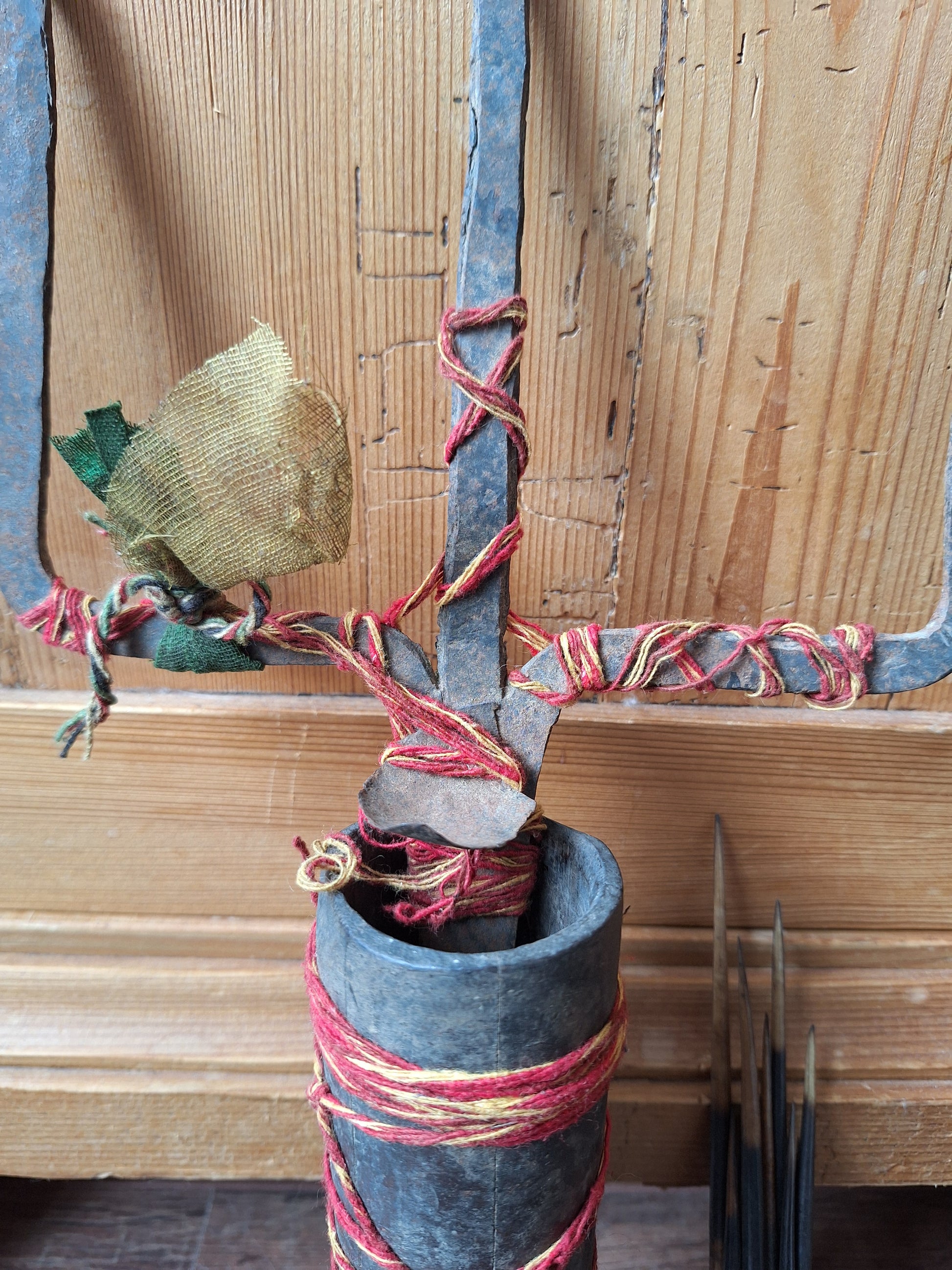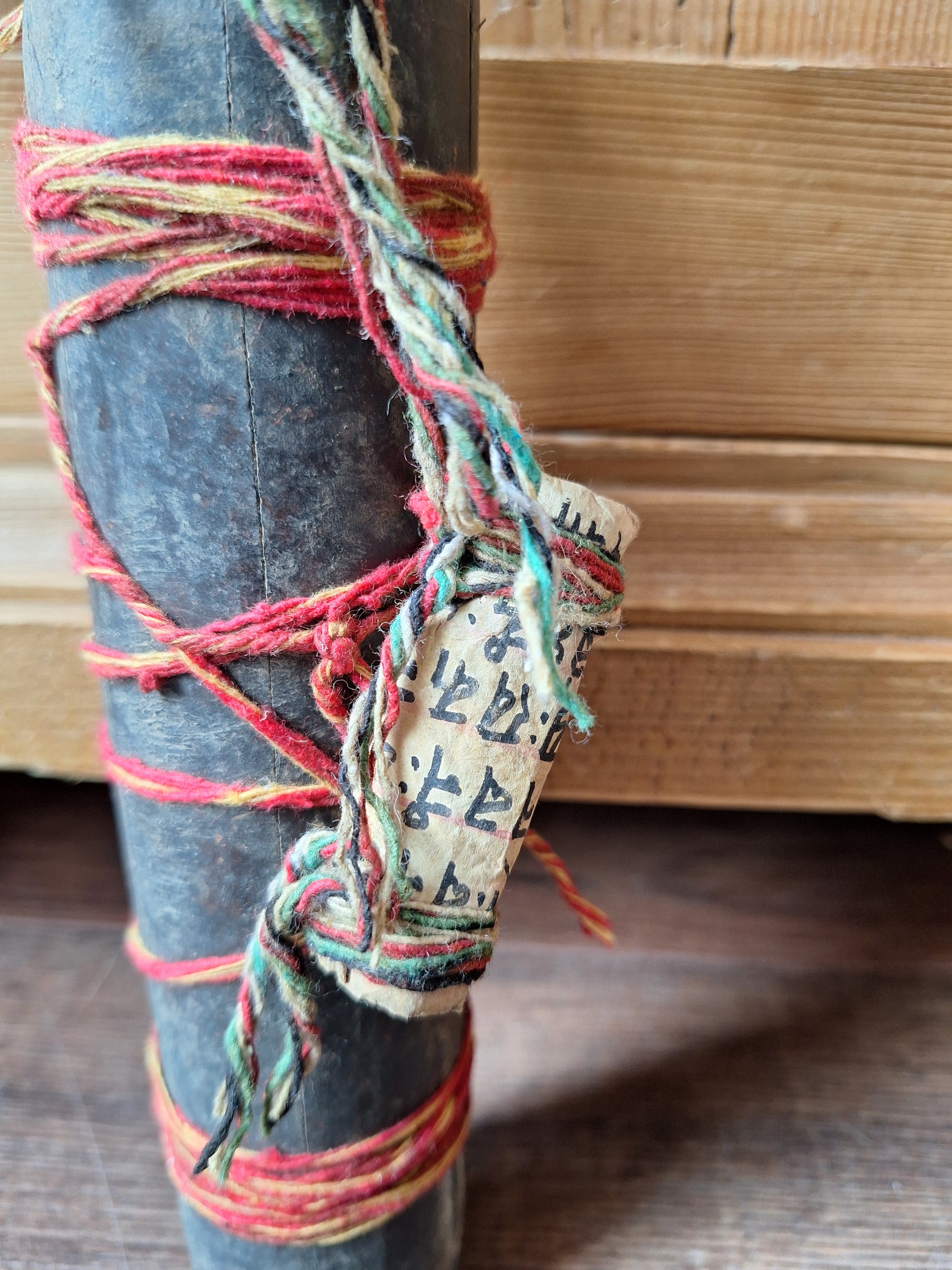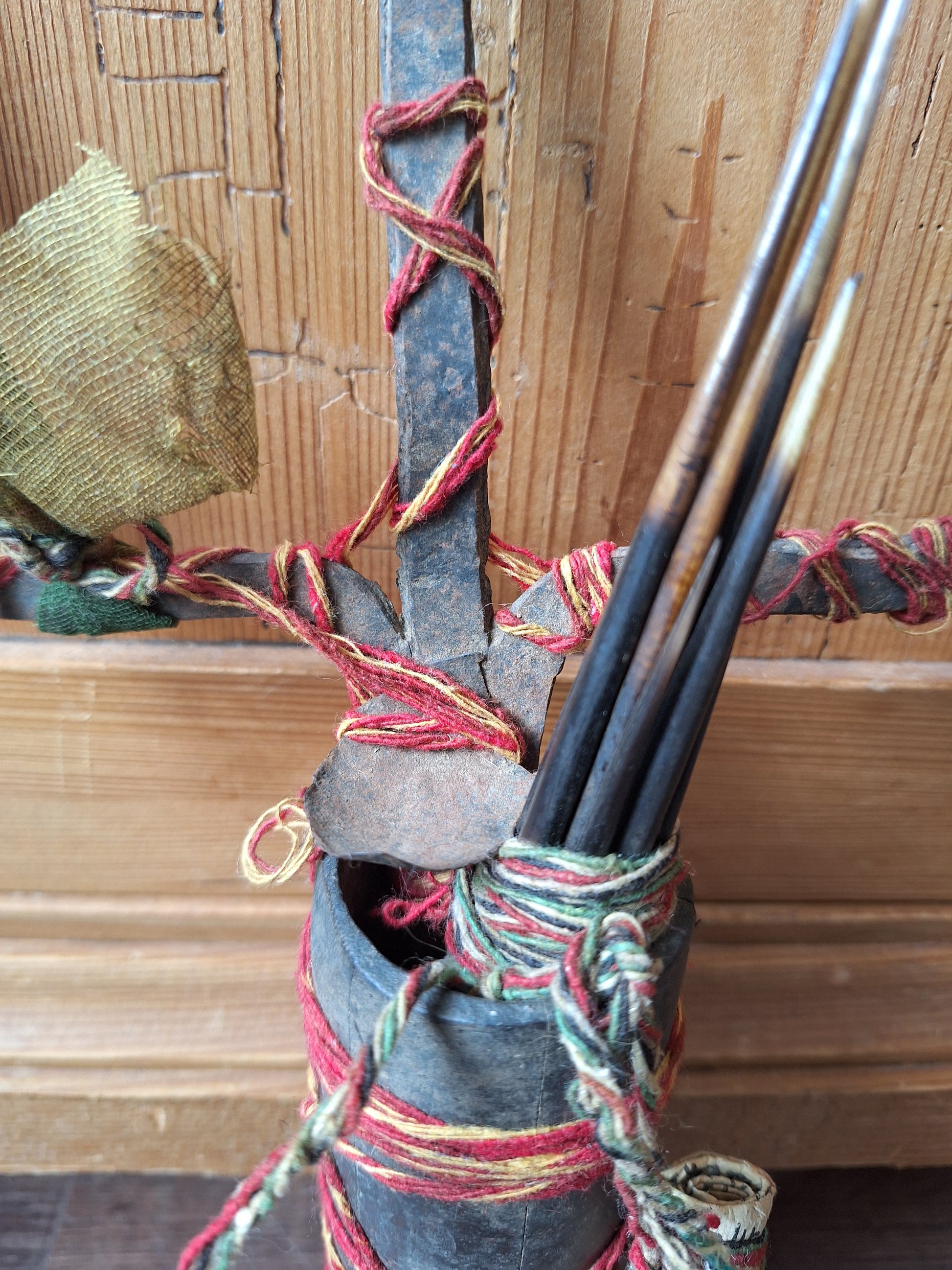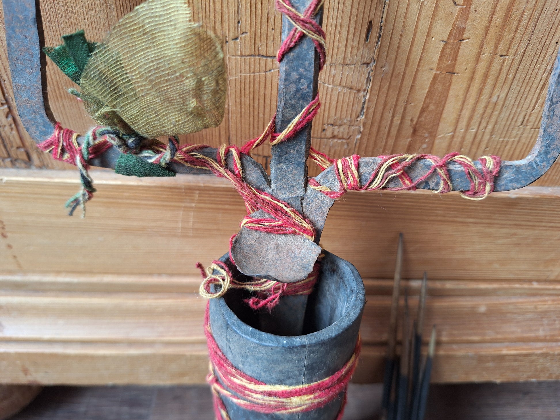 This trident here in our shop has been used as a personal attribute by a traditional Nepalese shaman. The trident has been attached into a simple wooden sleeve and combined with some other sacred objects; a bundle of porcupine quills and a mantra scroll. Everything has been bound together with blessed puja-thread. The pieces of cotton fabric show the consecrations / empowerments / blessings given to it by its previous owner.