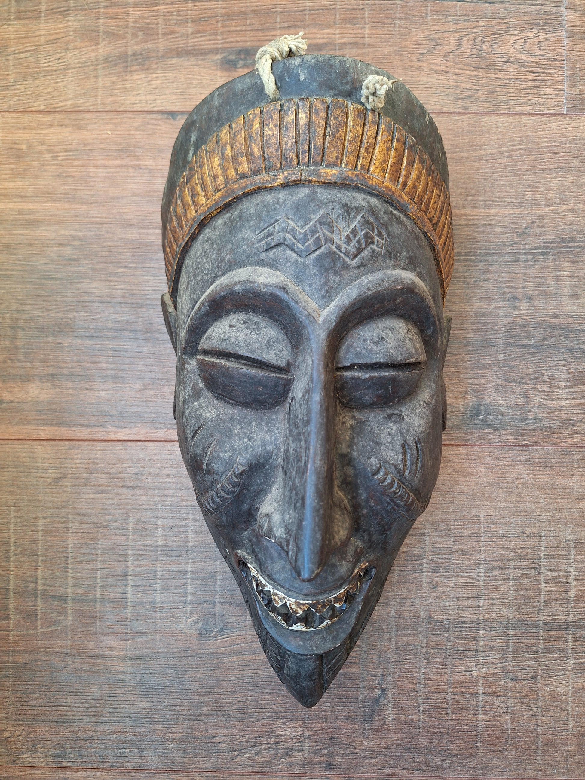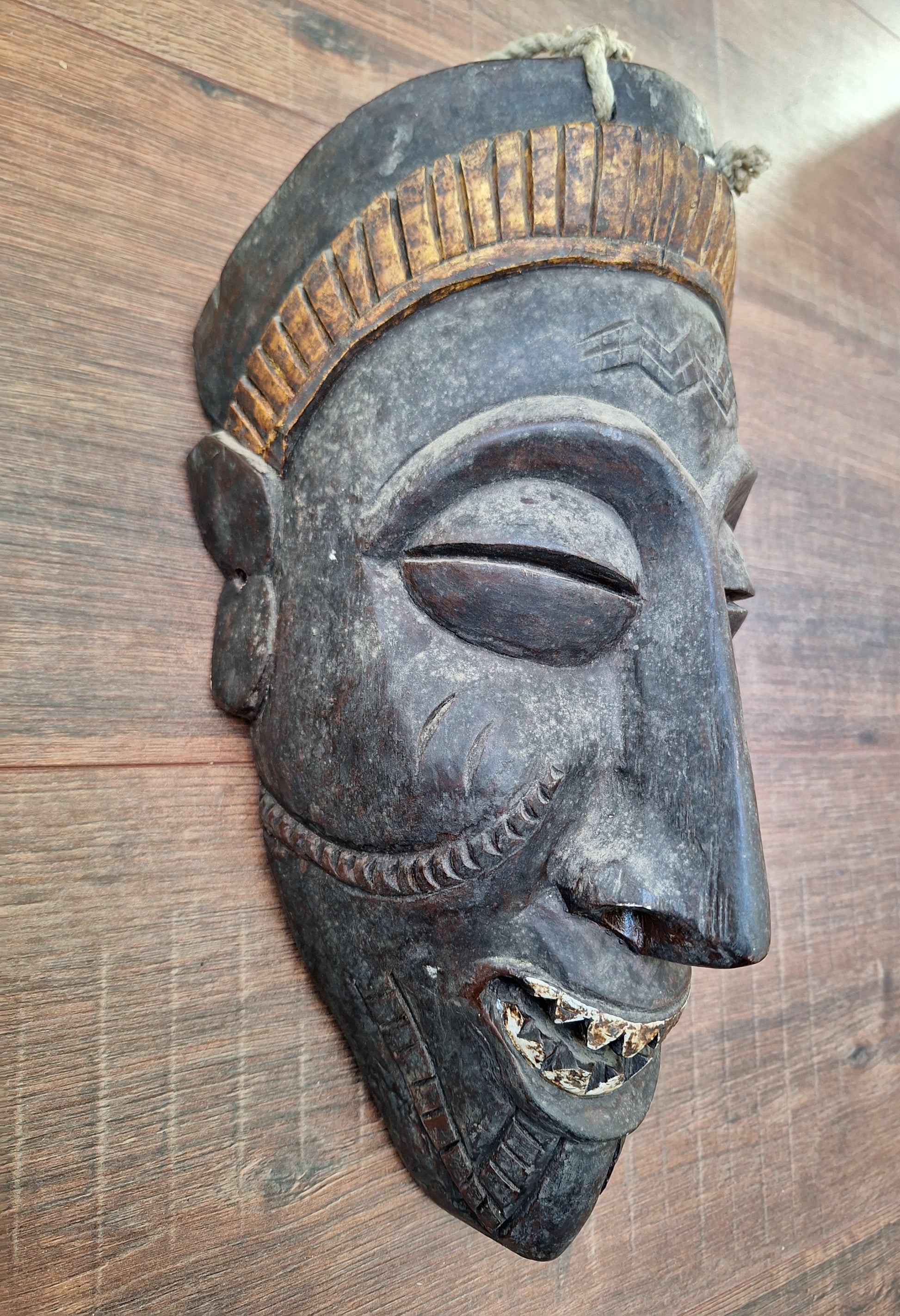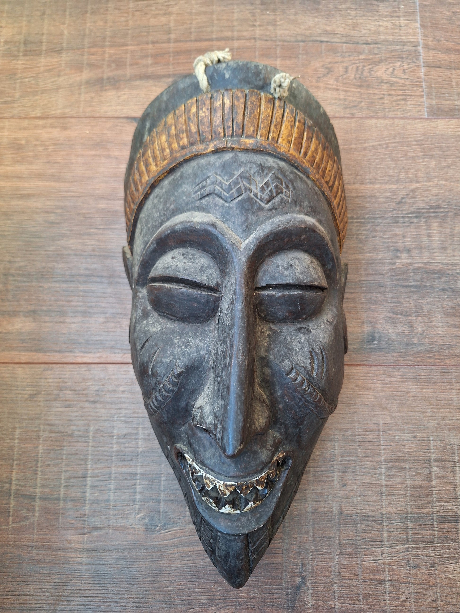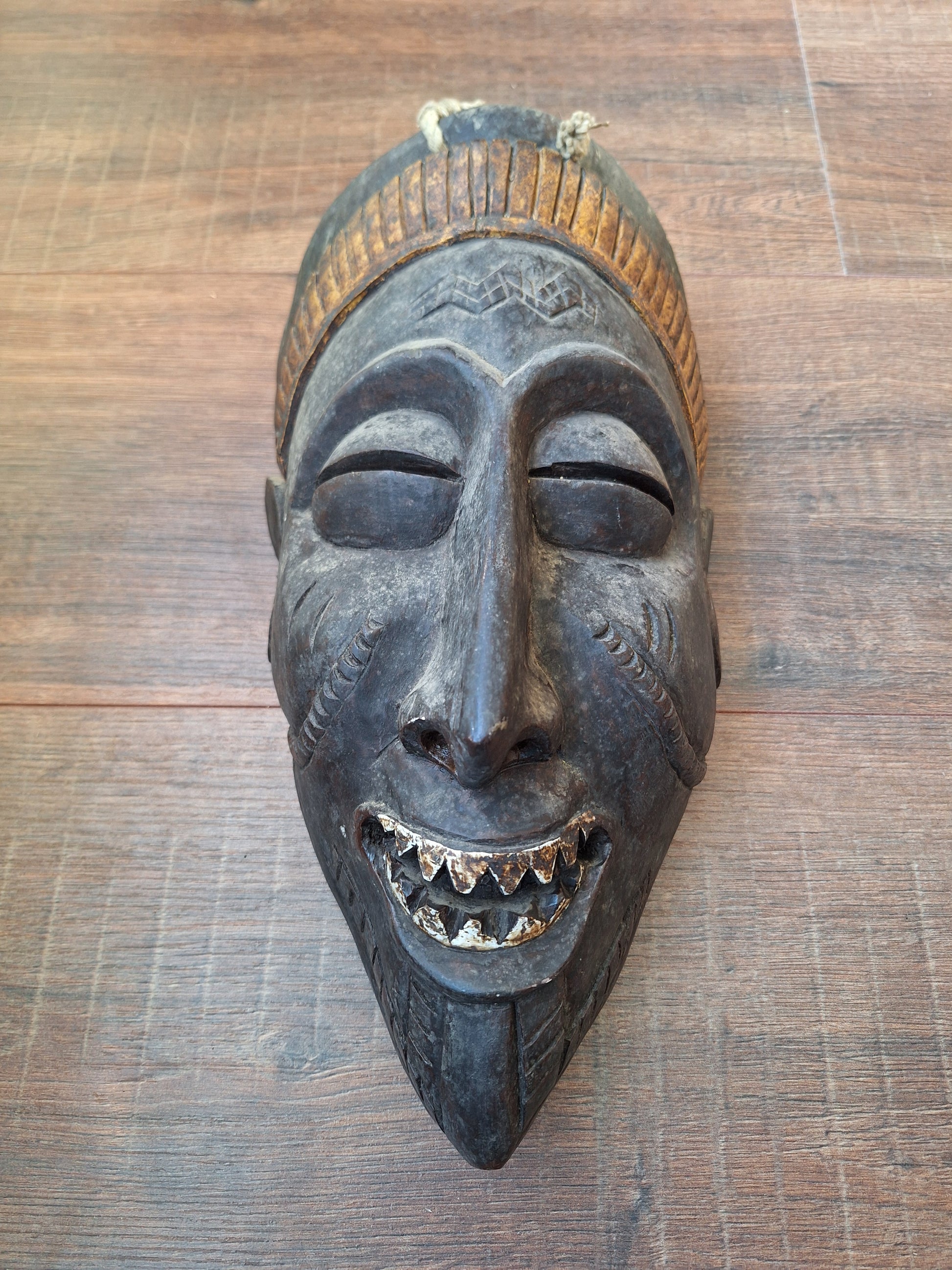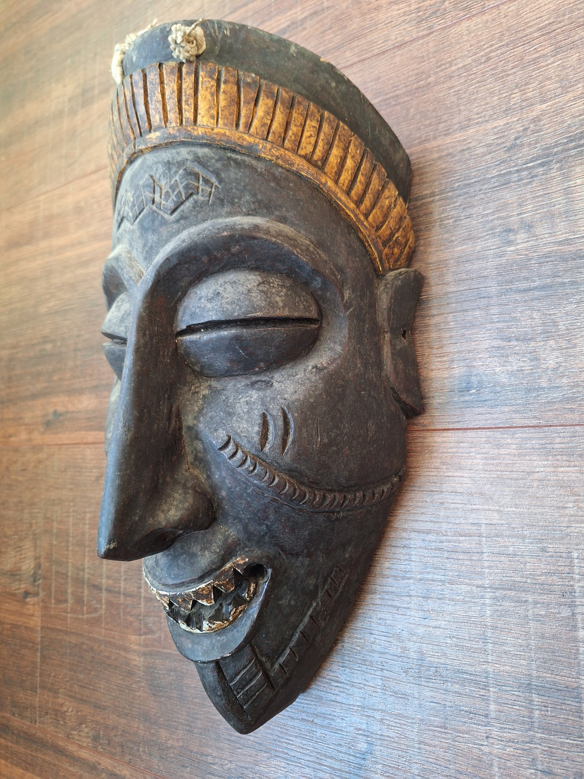 Very nice hard-wooden Nepalese ceremonial mask. Masks like this are worn during specific ceremonies and festivals. When they are 'off duty' for shorter or longer time, they are hung in houses near doors or windows, where they serve as houses for benevolent spirits who protect the house and family against malevolent spirits and diseases. They are then of course regularly fed offerings such as incense, ghee, wodka and milk, which over time gives them a beautiful dark and glossy patina.