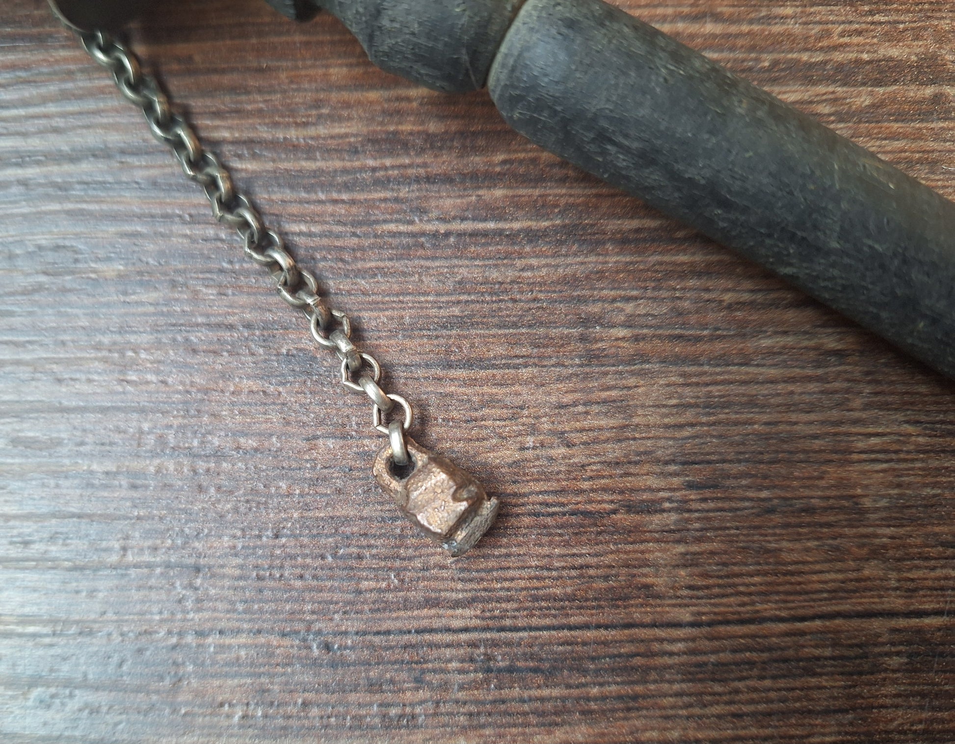 This somewhat smaller sized Tibetan hand held prayer wheel here in our shop is quite an old one already and of course shows some signs of its age and previous usage, but overall still in good condition. This prayer wheel consists of a red copper cylinder, with some brass ornaments and decoration, on a wooden handle.