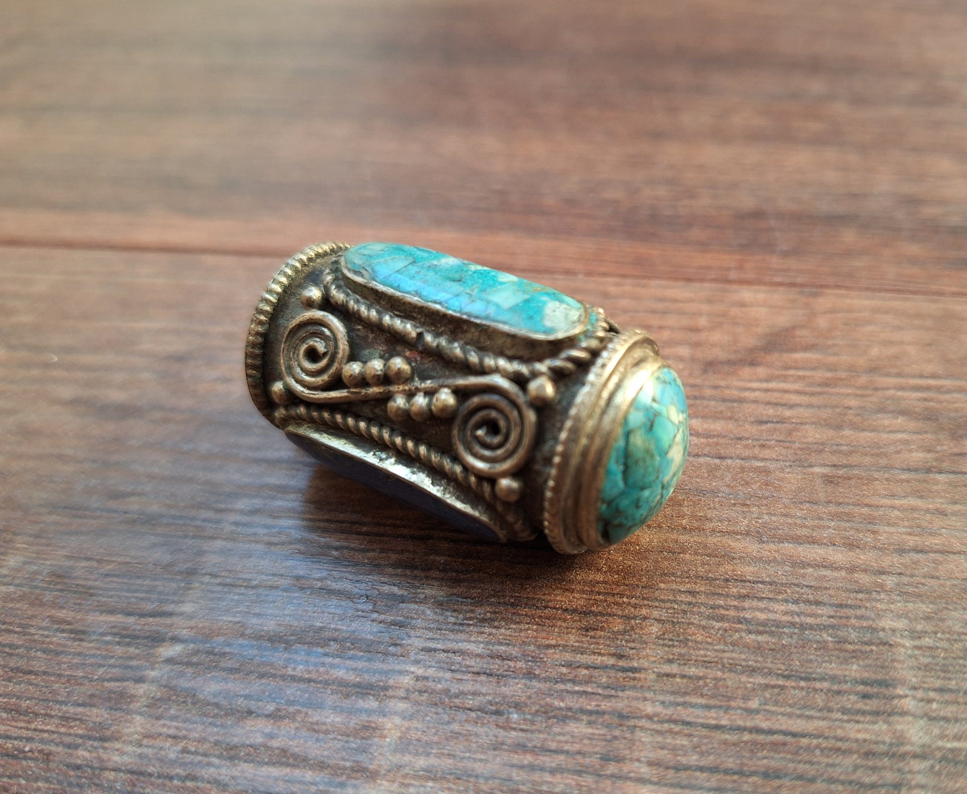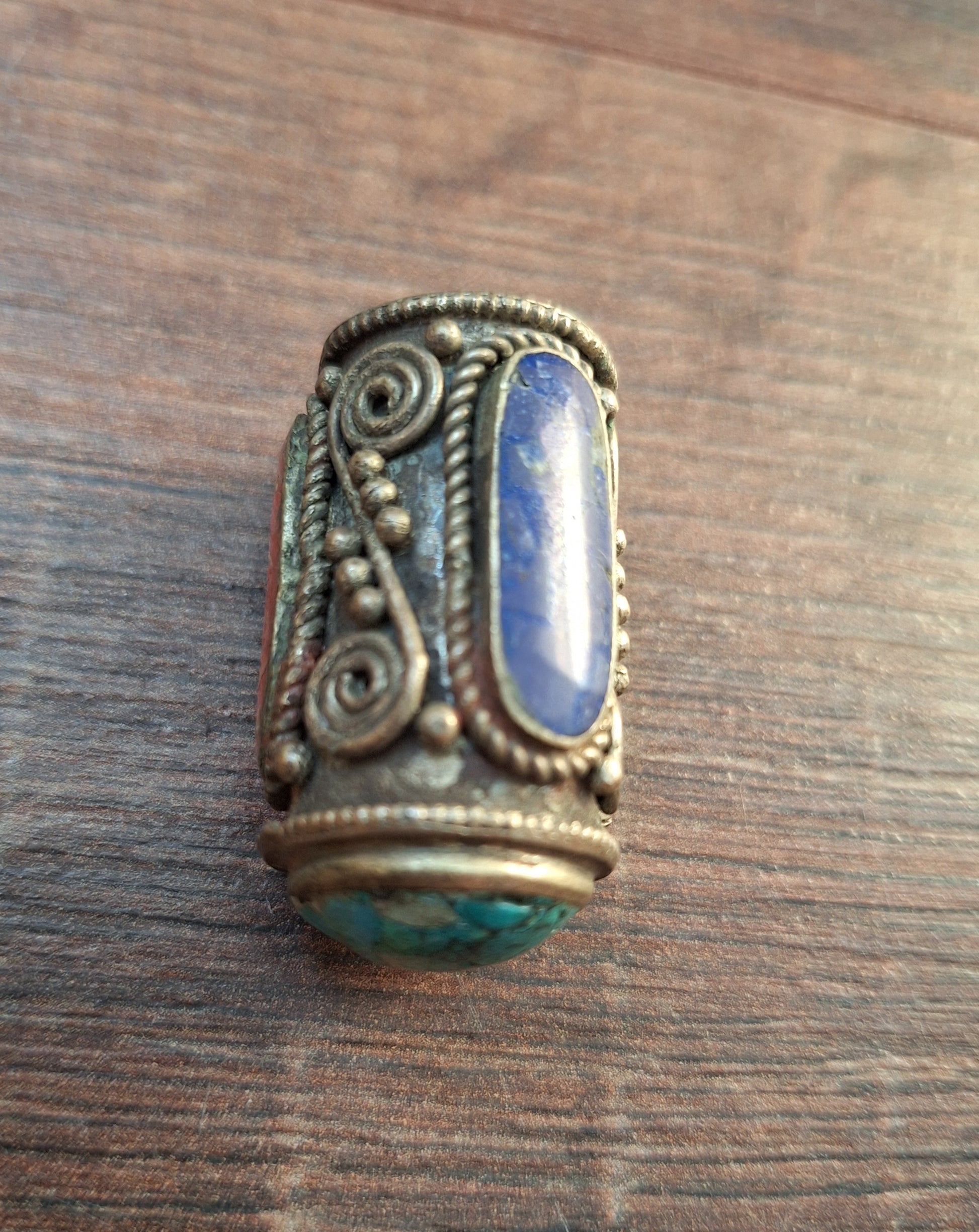 Vintage Tibetan silver pendant with a (gem)stone inlay created by supplementing gemstone chips/flakes with a stone gravel paste.