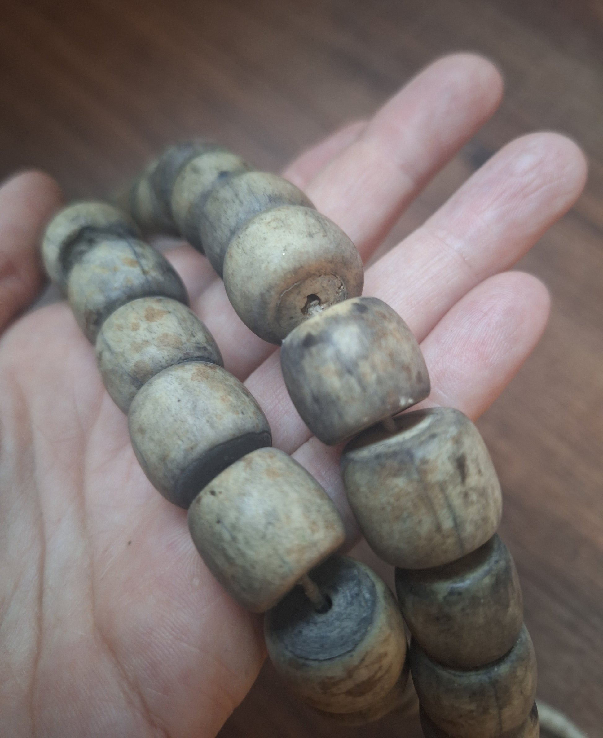 The beads have been made from bones that have a natural hollow inside after cleaning out the marrow (such as the leg bones from smaller mammals). After cleaning and polishing the pieces of bone, the hollow has been filled again with a clay-like substance, which has been pierced with an approximately 1-3 millimeters wide hole for threading.