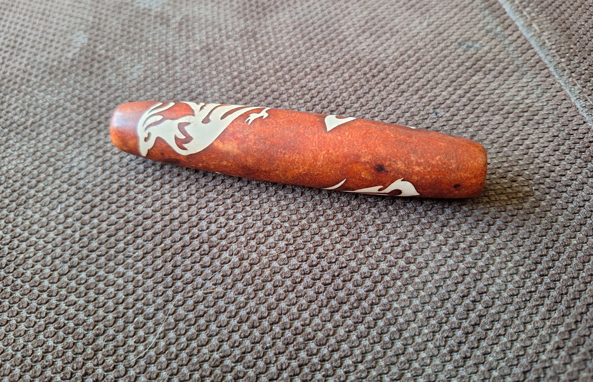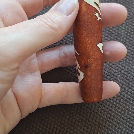 Recently made natural stone bead with the depiction of a phoenix. This bead has a nice, warm orange-brown color and is in good condition. The bead has been made in the traditional Tibetan tubular bead style which can often be seen in dzi beads. But given that the depiction on this bead is not a traditional dzi bead pattern, we prefer to not call this a 'dzi bead'. It is however a very nice bead.