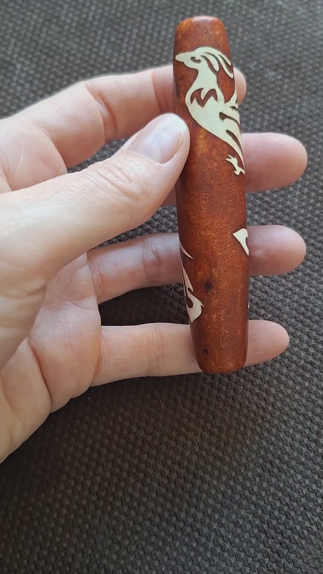 This is a large size bead; 98 millimeters long and 23 millimeters wide. Weight is 67 grams. A bead in such a big size might not be very practical as an everyday personal amulet to wear around your neck, but it will for example make a great piece to attach to your ritual clothing or attributes or as an altarpiece. And of course, with the well-known and popular symbolism of the phoenix associated with transformation and rebirth, a bead such as can be a great supporting item during your meditation practices.