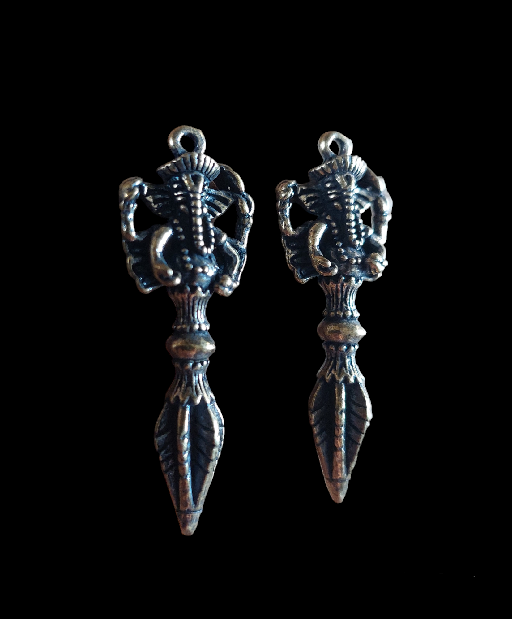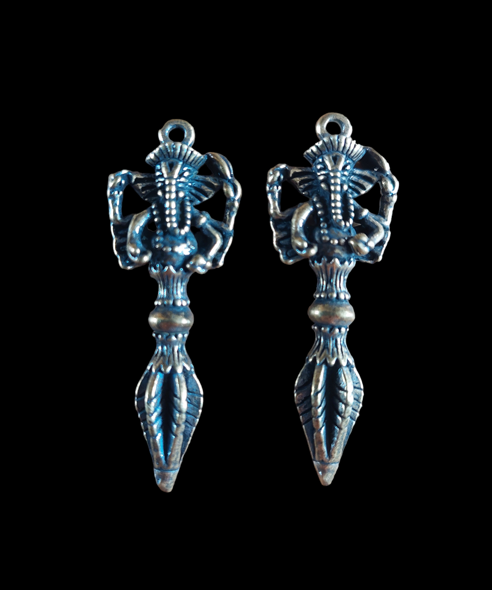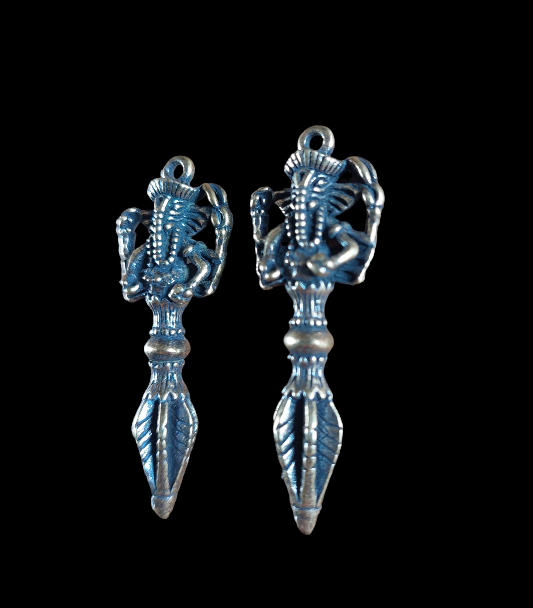In these pendants the image of Ganesha is combined with the symbol of the dorje; a widespread symbol in both Buddhism and Hinduism, which can be found on for example depictions and statues of the buddha, decorations on ritual attributes, furniture and fabrics. The word 'dorje' (or in Sanskrit 'vajra') translates both as 'lightning bolt' and as 'diamond'.