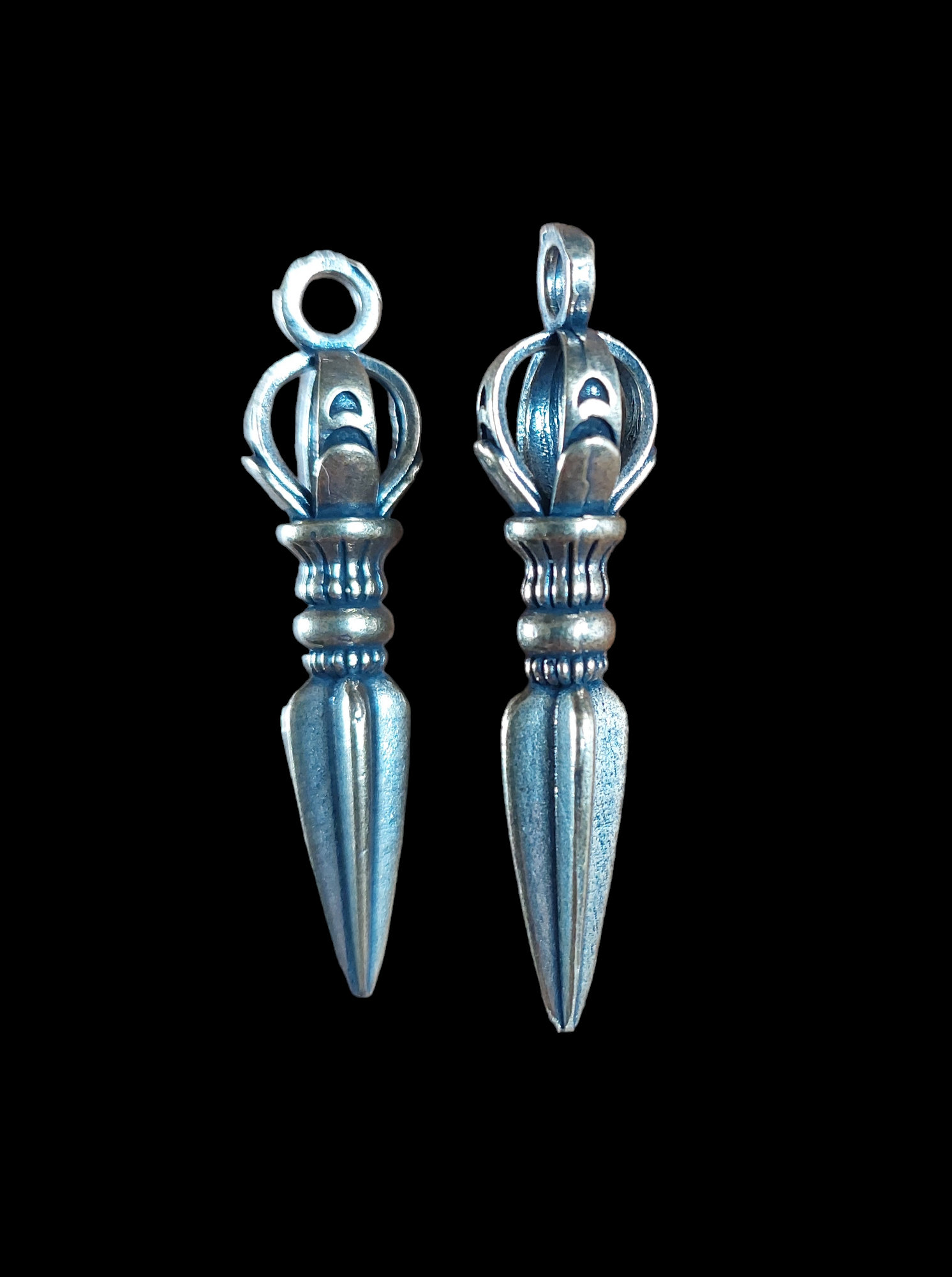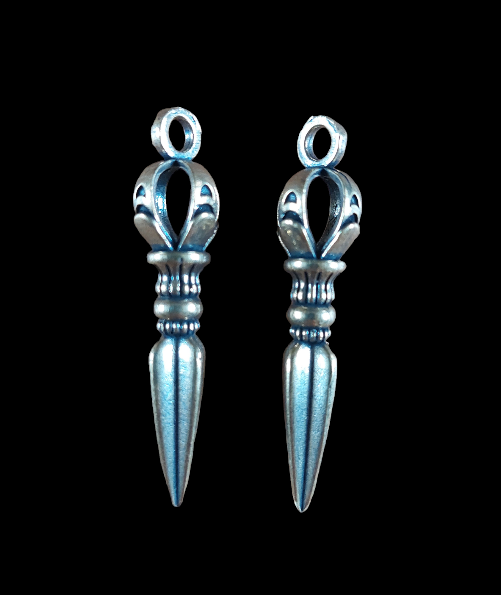 Nice phurba pendants made in Tibet. Simple in design, but from good quality. Made of bronze. Recently made. Phurba pendants such as these can be worn as a personal protective amulet or for that reason be attached to your ritual attributes or clothing, but can also be used as a fully-functional ritual weapon in handy travel size.