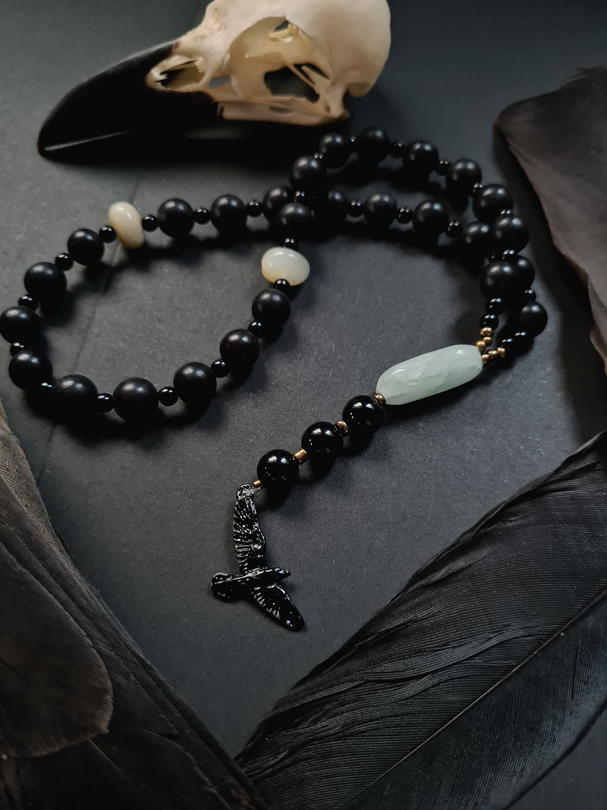This prayer beads connect you with the Raven spirit. You can breathe with the touching of each bead to lower yourself into the energy of wisdom and cleansing of the Raven. It helps you to connect with the Raven qualities and with your subconscious and the dreamworld. There is a link to the night and Moon (moonbeads).