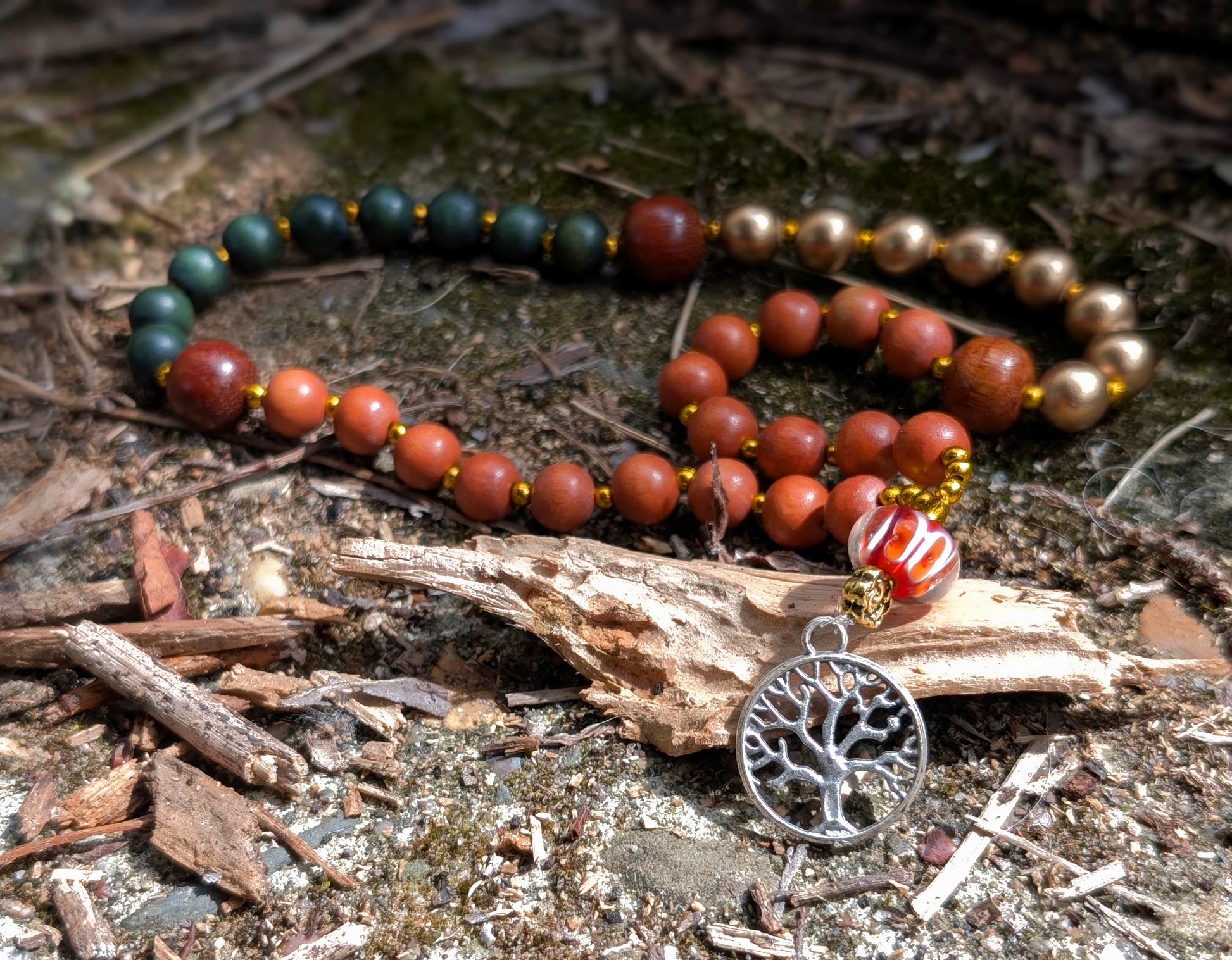 This prayer beads are made for you to connect with the World Tree. The tree is an important spirit in the European myths and in shamanism, known by many names such as Yggdrasil and Irminsul. Through the tree one can travel to the other realms and is a connection point for people and spirits; like an antenna. You can breathe with the touching of each bead to climb up or down the world tree to the Upper or Lower worlds. It helps you to connect by each breath to the great Tree that holds the universes, the Axis Mundi, pillar of the world. Qualities: travel, trance journeys, Centering, grounding, connection.