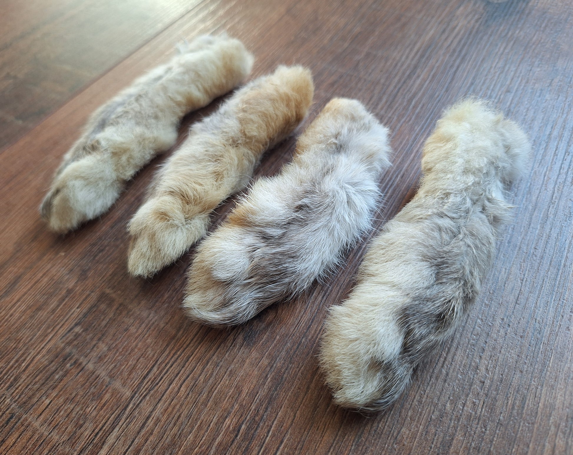 Set of 4 prepared paws from a domestic rabbit, died of natural causes. These paws have a blend of light beige, grey and creamy white colors. For all kinds of crafting or ritual purposes.