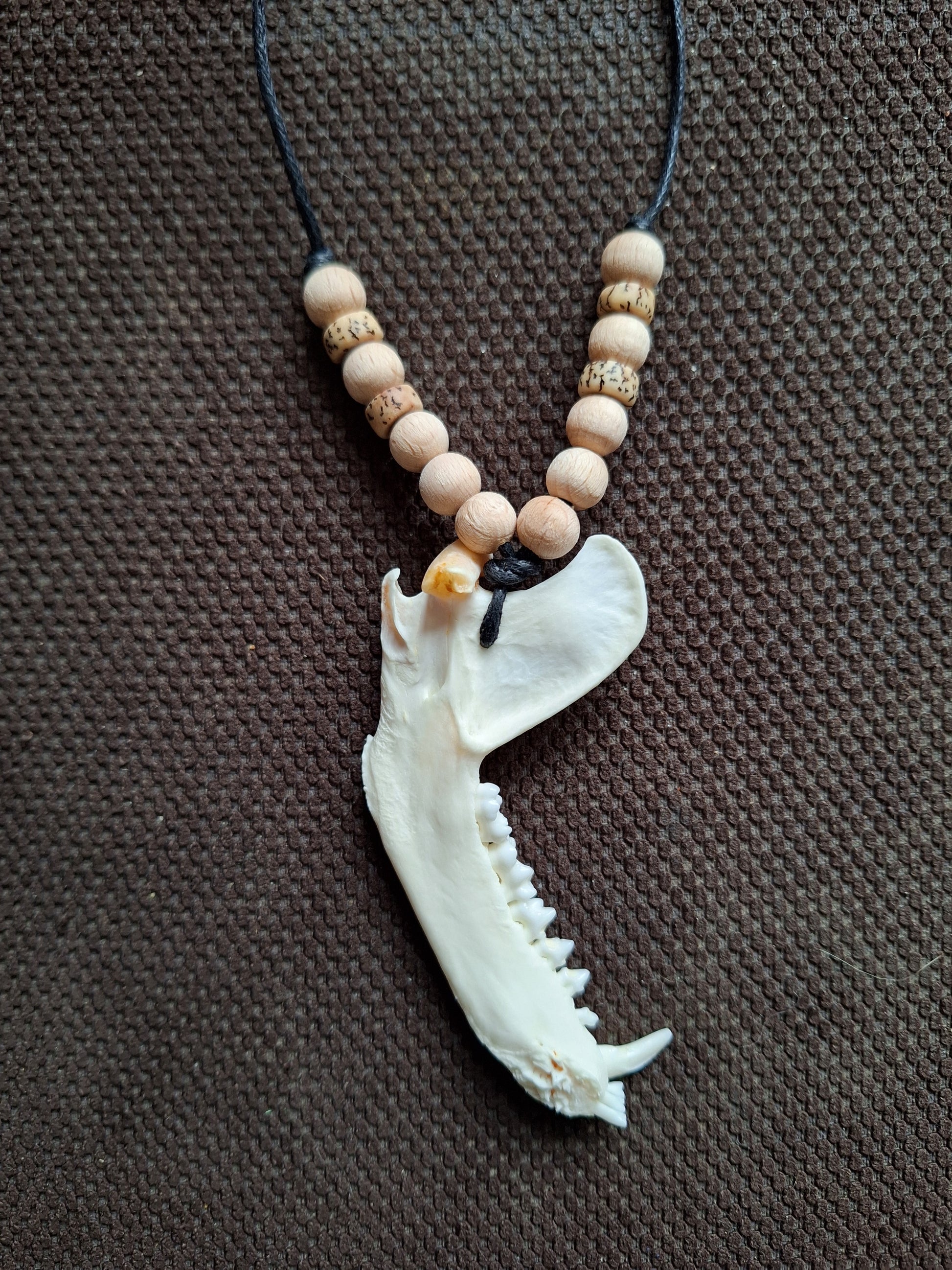 Amulet necklace made with a very nice jaw bone from a racoon. The jaw bone has been strung on black wax cord together with some re-used wooden beads, taken from old necklaces, and a Tibetan skull bead handcarved from yak bone.