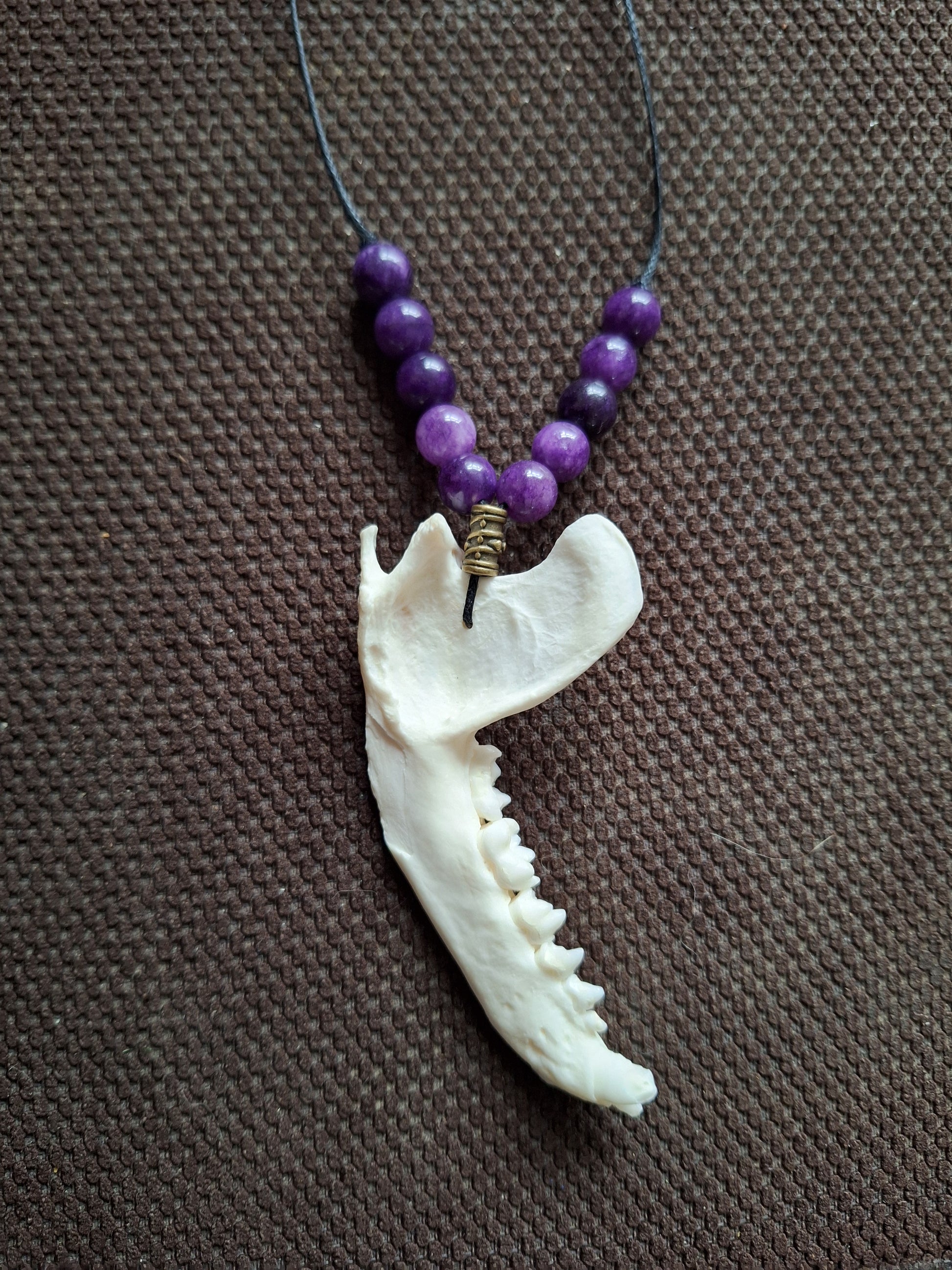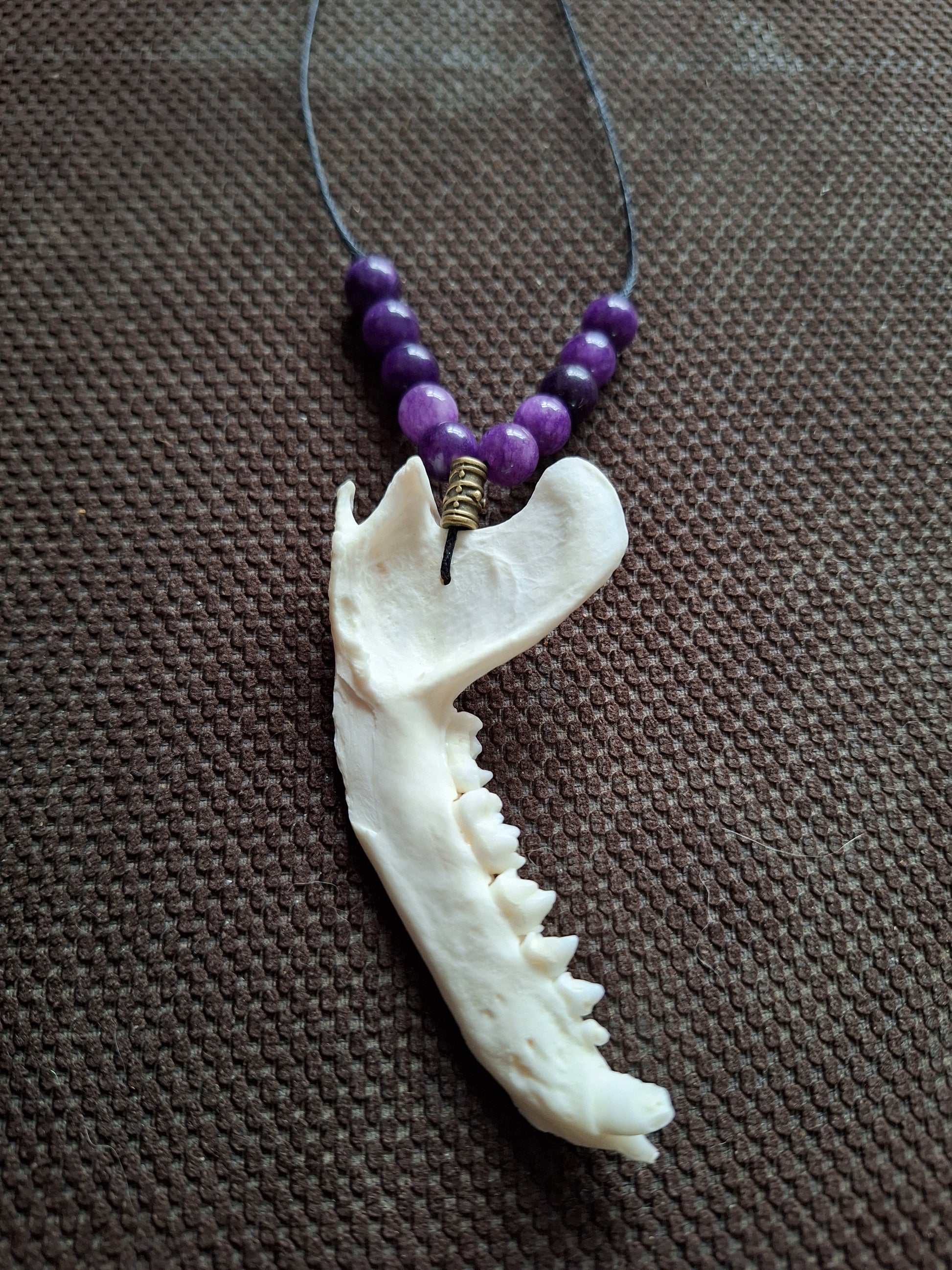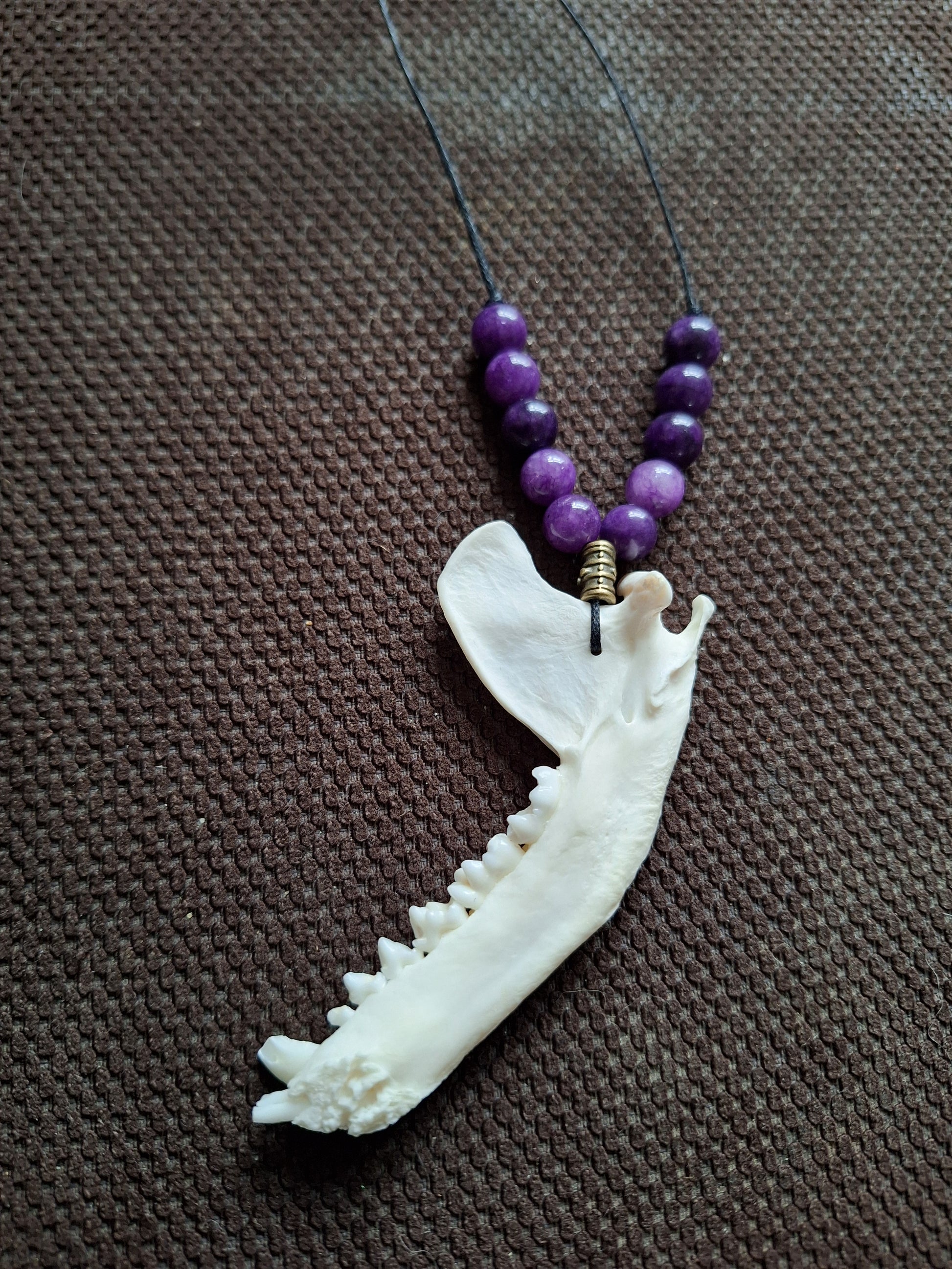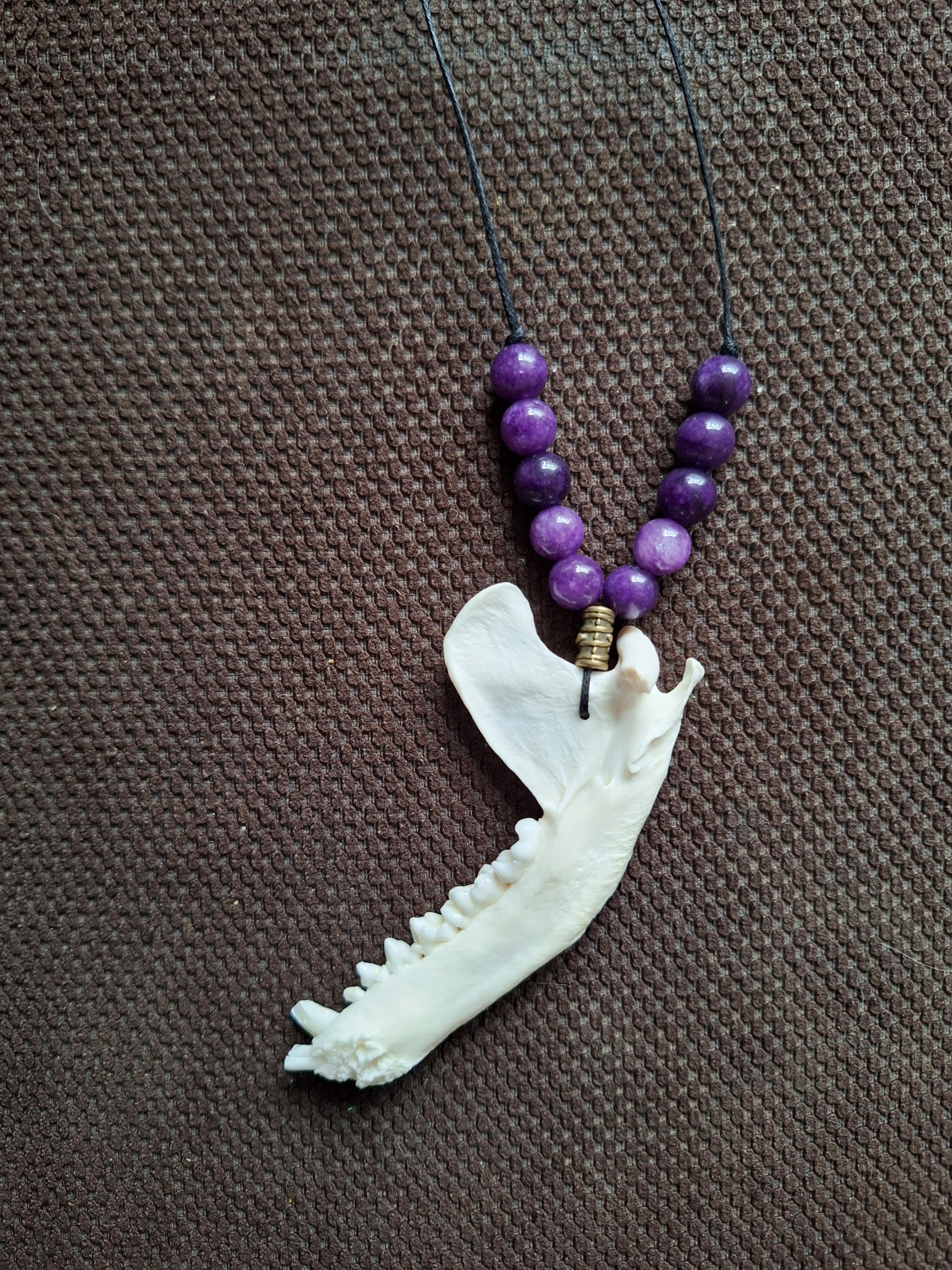 Racoon jaw bone and amethyst amulet necklace