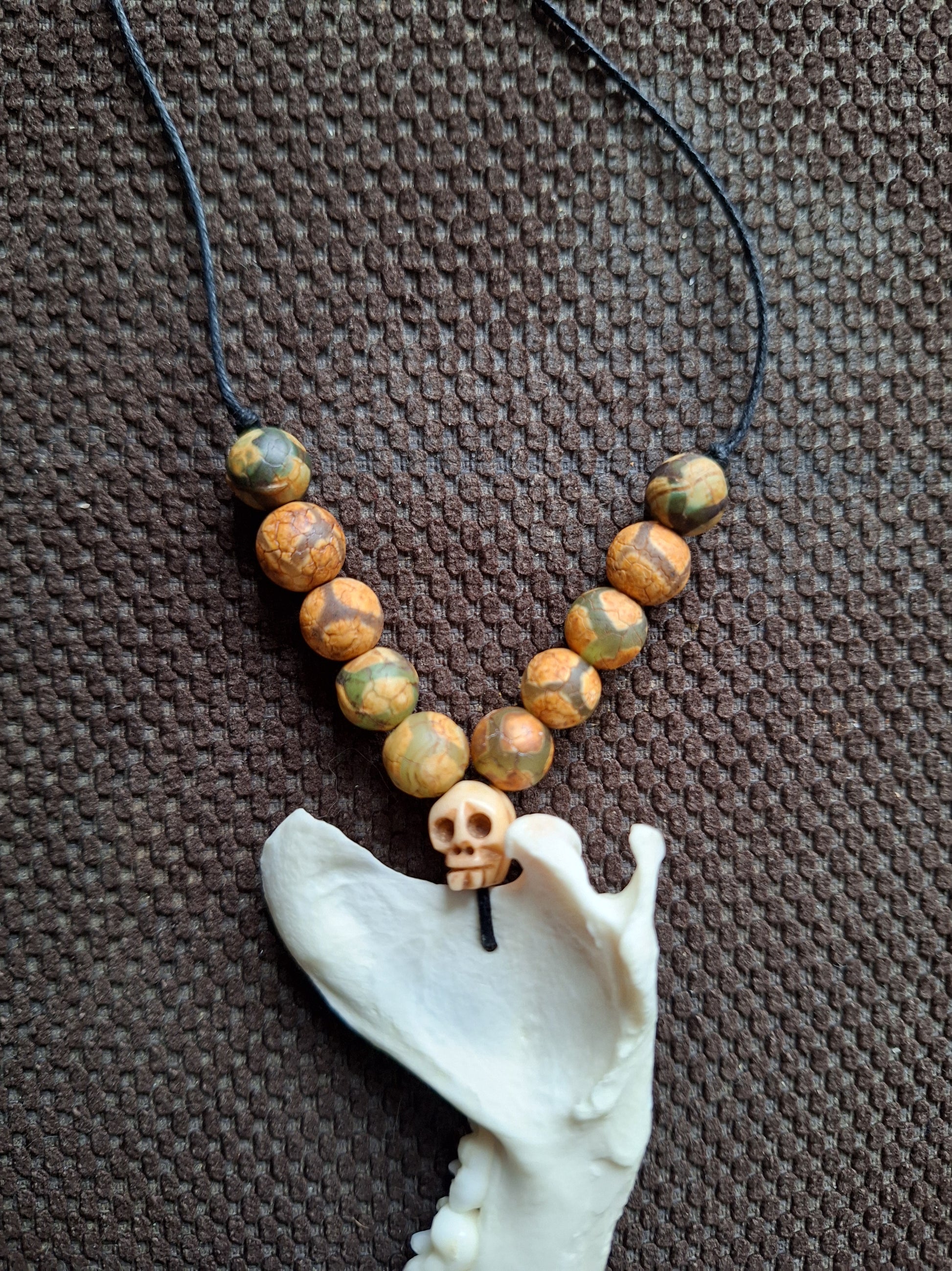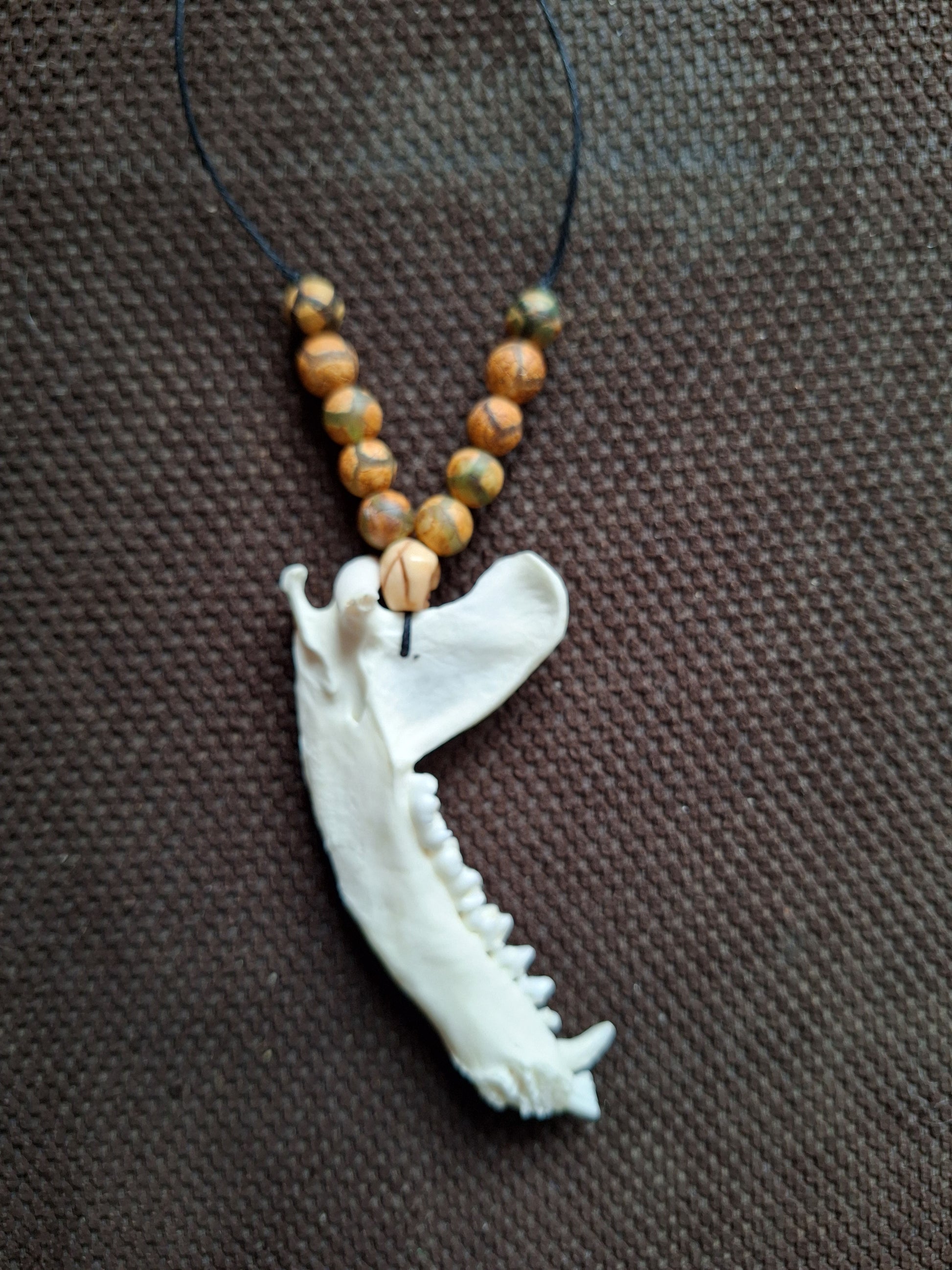 Amulet necklace made with a very nice jaw bone from a racoon. The jaw bone has been strung on black wax cord together with a Tibetan skull bead, handcarved from yak bone, and some dzi-style beads with a turtle back pattern. There is if course a lot that can be said about the symbolism of these beads (read all about it in the DZI Bead section of our shop), but in this necklace the turtle back patterned beads have been chosen for their protective properties; 'shielding' you from all kinds of negative influences.