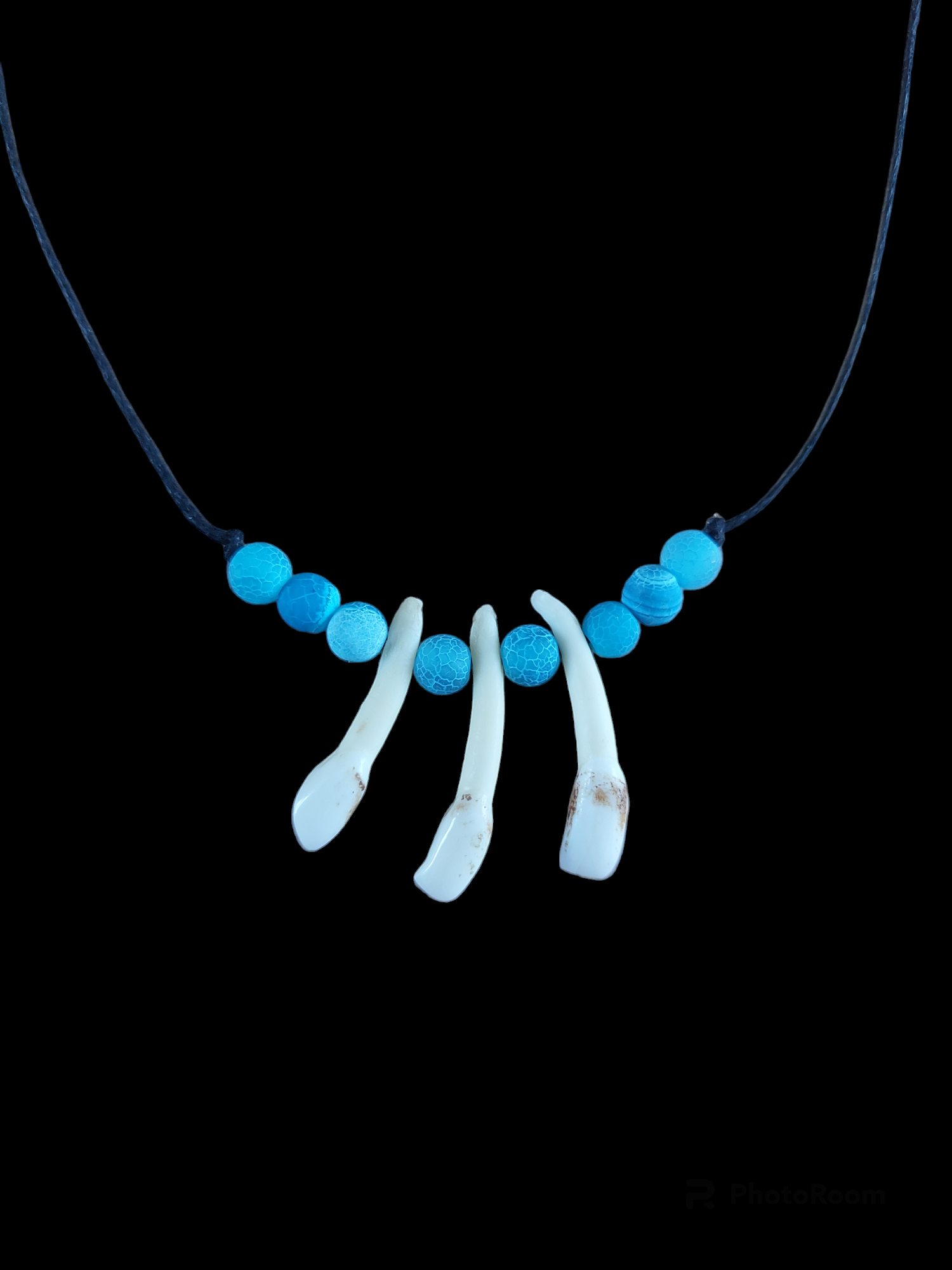 Amulet necklace made with three small incisor teeth from a dutch red deer, combined with frosted blue agate beads.