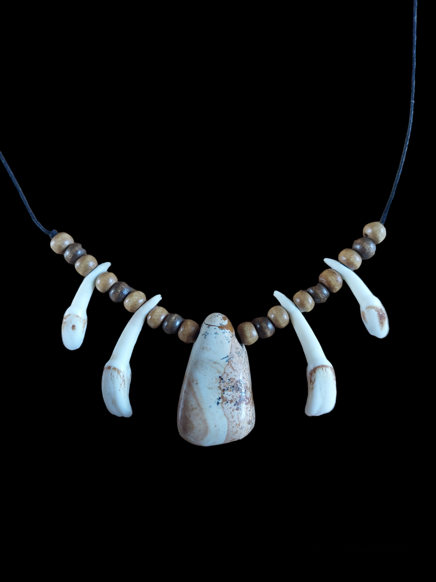 Amulet necklace made with four incisor teeth from a dutch red deer. In between them hangs a speckled, beige colored landscape jasper pendant. This pendant comes from vintage origin and is given a second life in this amulet necklace.
