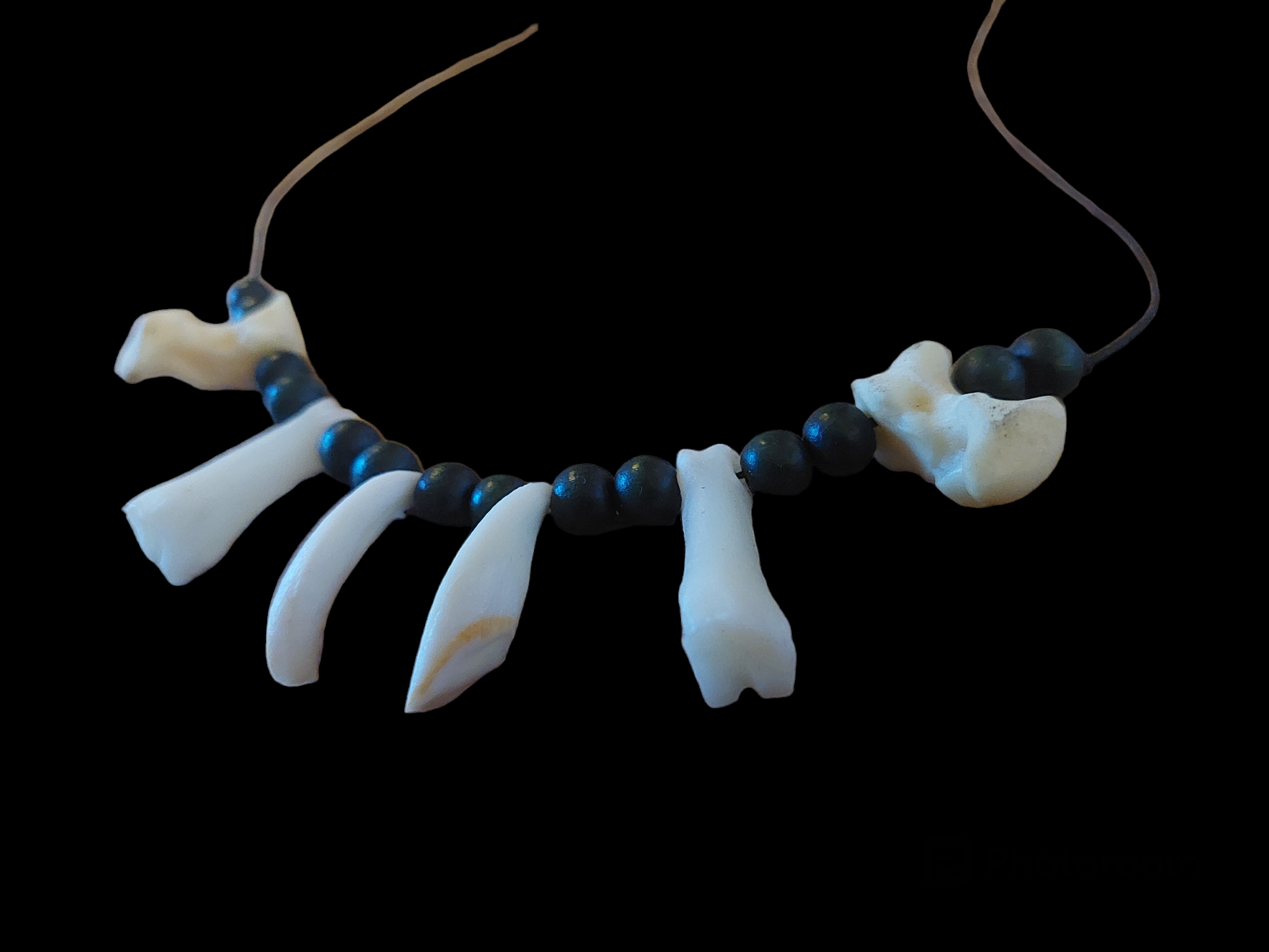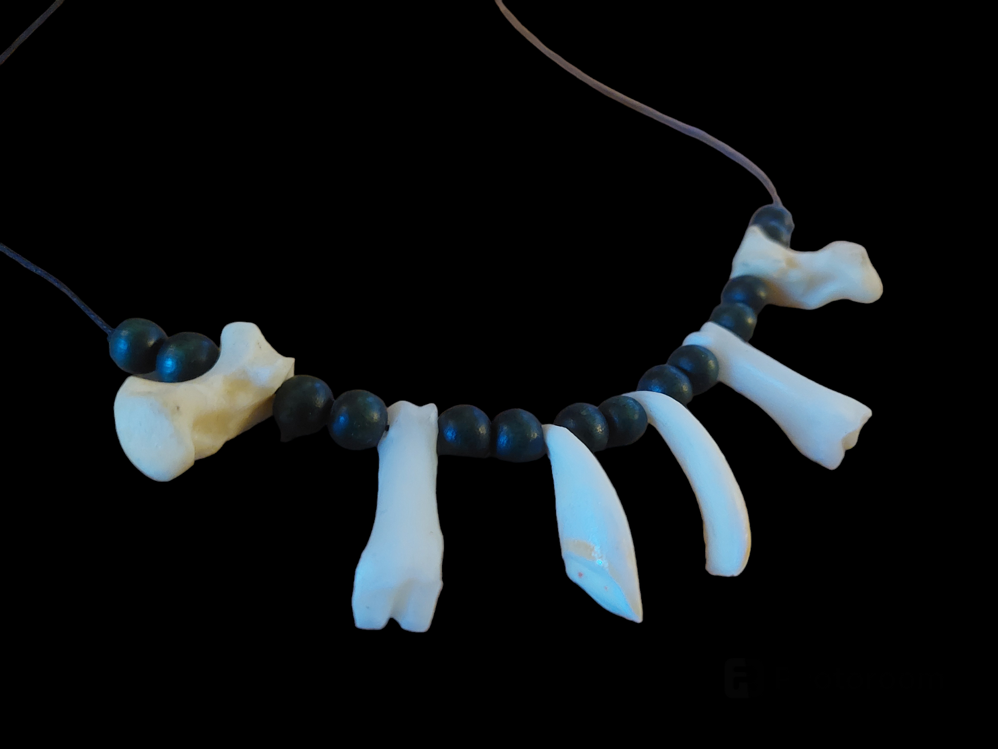 Amulet necklace made with a pair of incisor teeth from a dutch red deer and foot- and anklejoint bones from a dutch roe deer.
