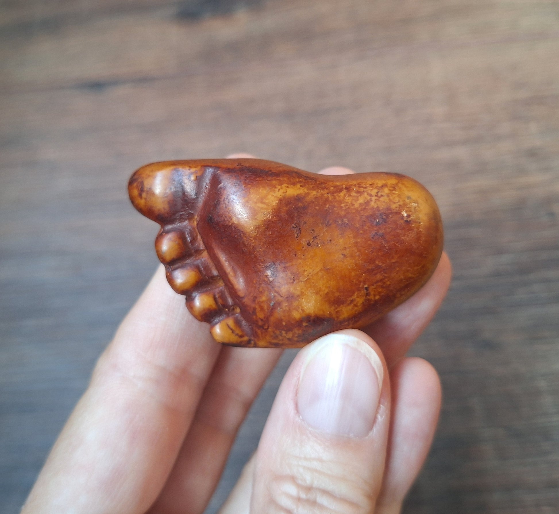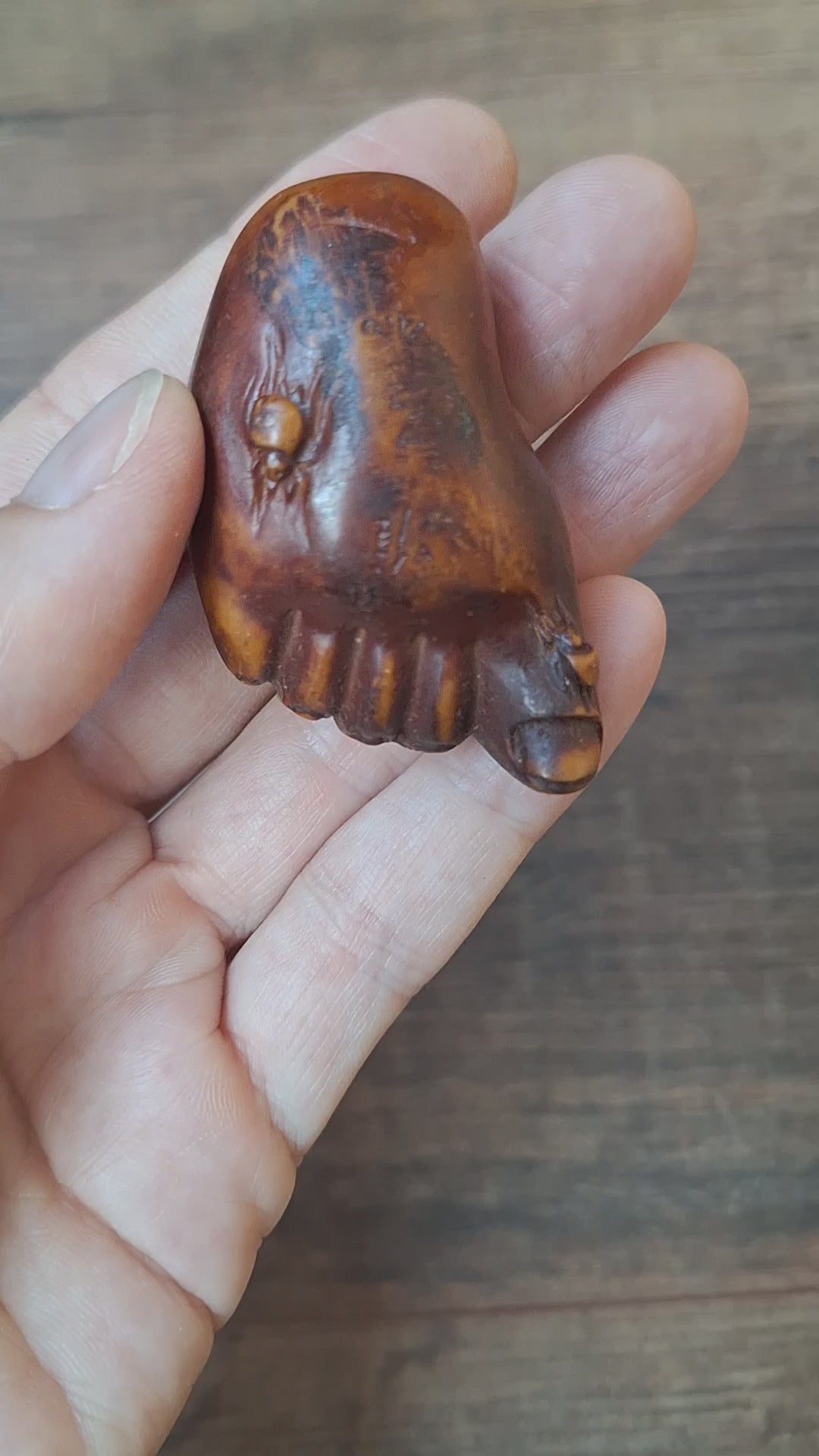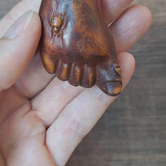 This netsuke here in our shop is such a recently made one. It is made of resin, which mimicks the appearance of a bone carving. It is modelled in the shape of a foot, with two spiders crawling on it.