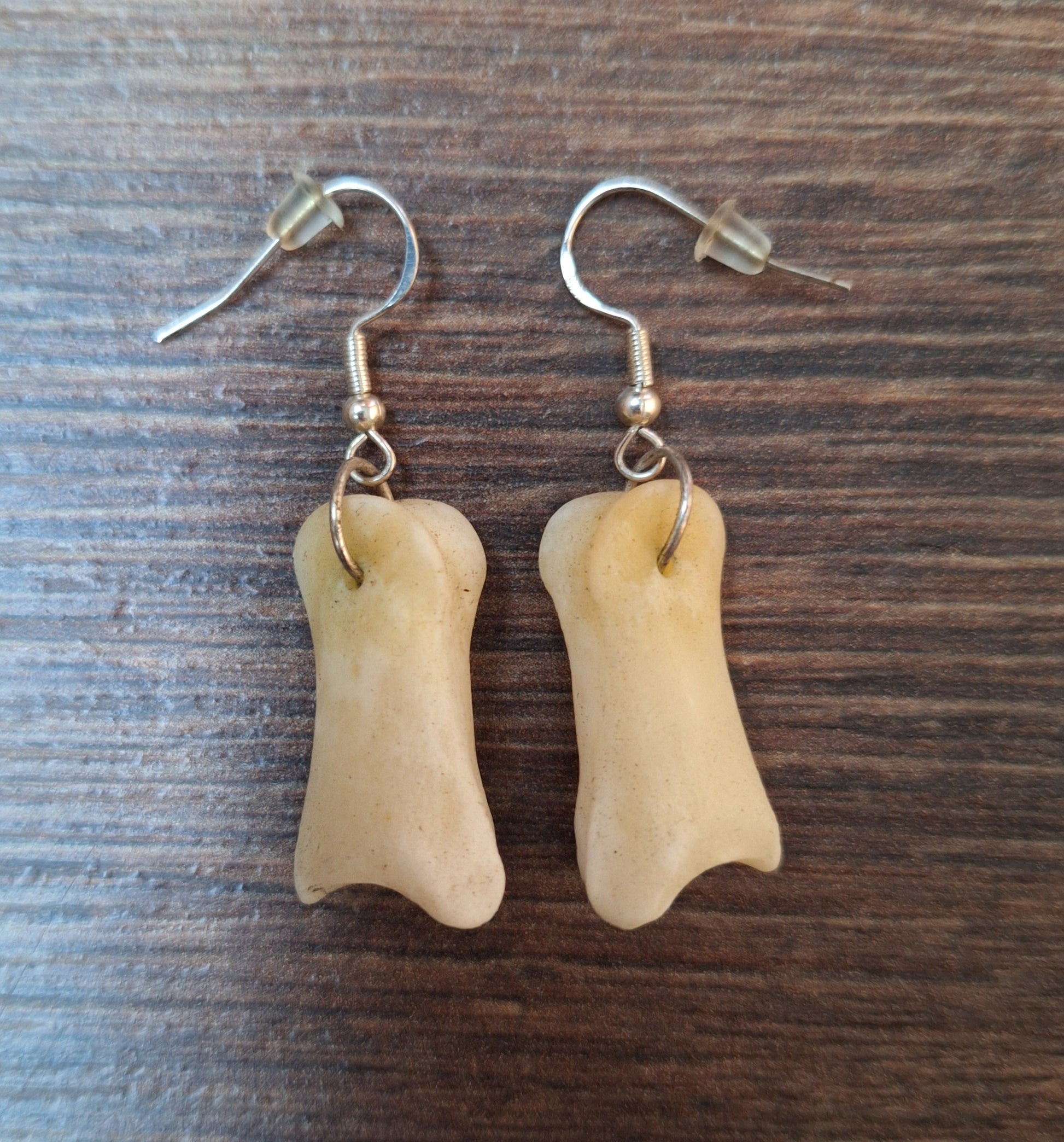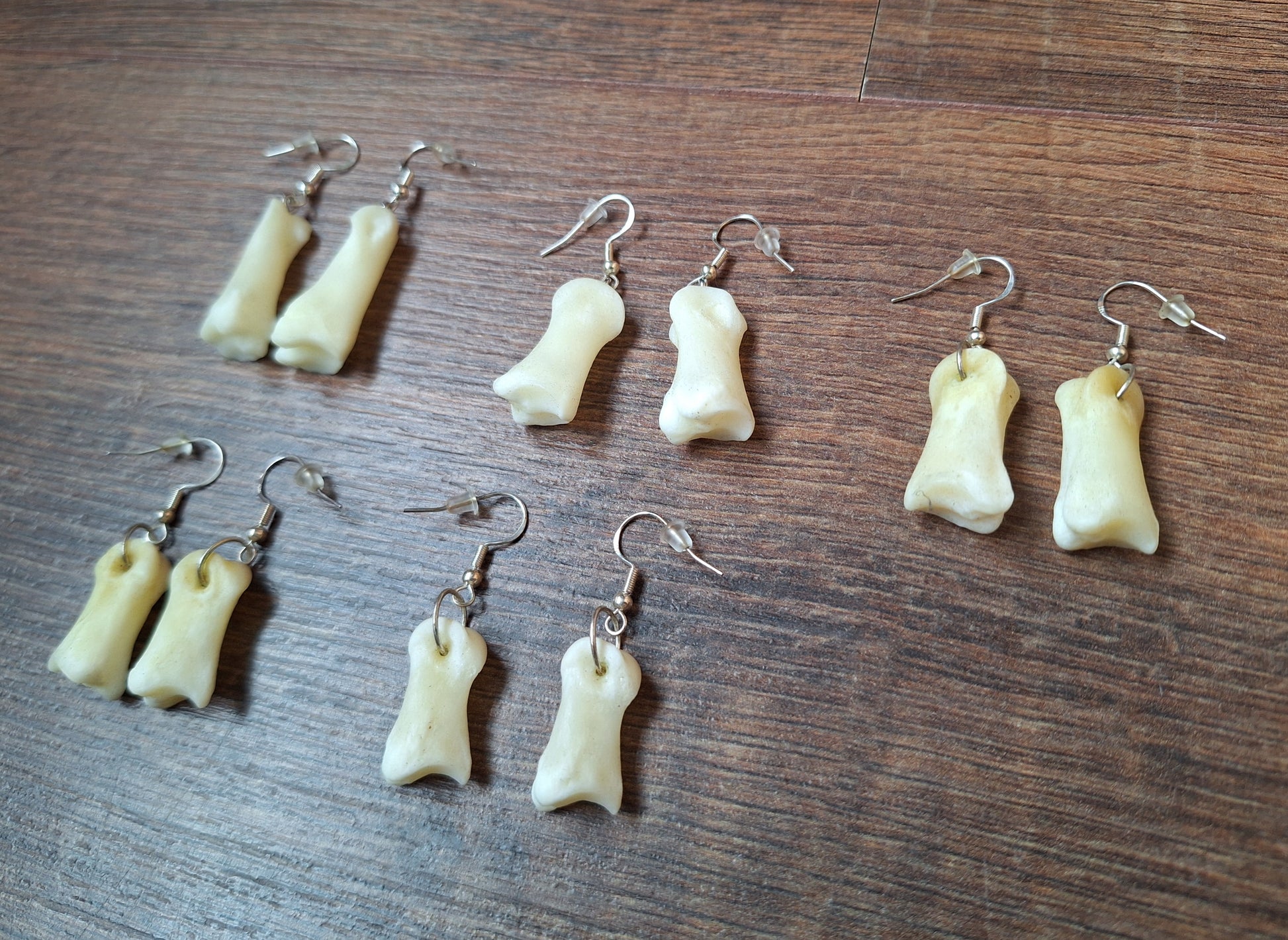 Sold per set of two earrings. Of course a set consist of two matching foot bones from the same animal. You can choose your favorite set via the selection-menu. On the overview picture the sets are numbered from upper left to lower right, with the following sizes of the bones: