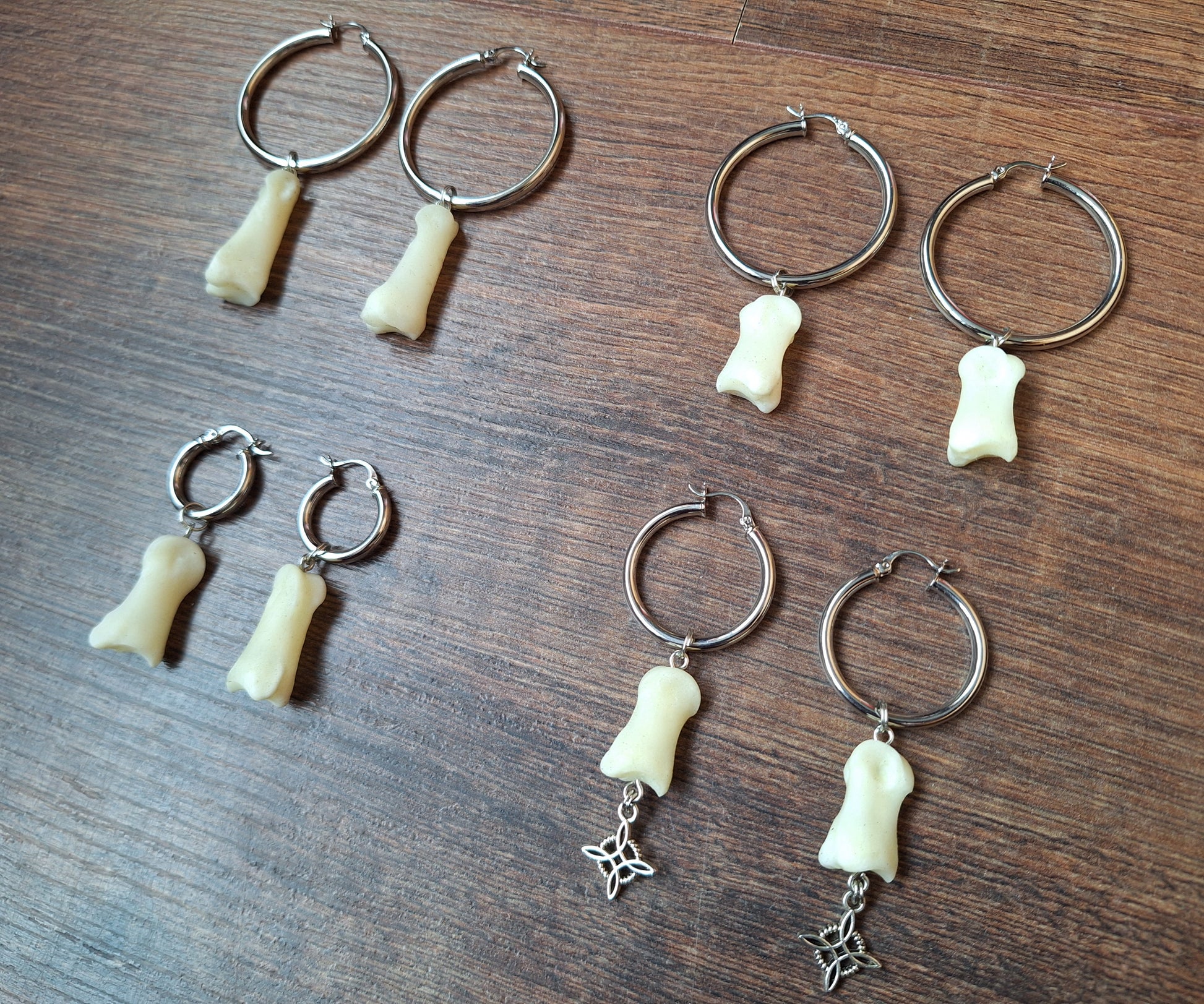 Set #4: 2,3 centimeters long bones, with a tibetan silver witch's cross pendant, on a 29 millimeters diameter hoop.