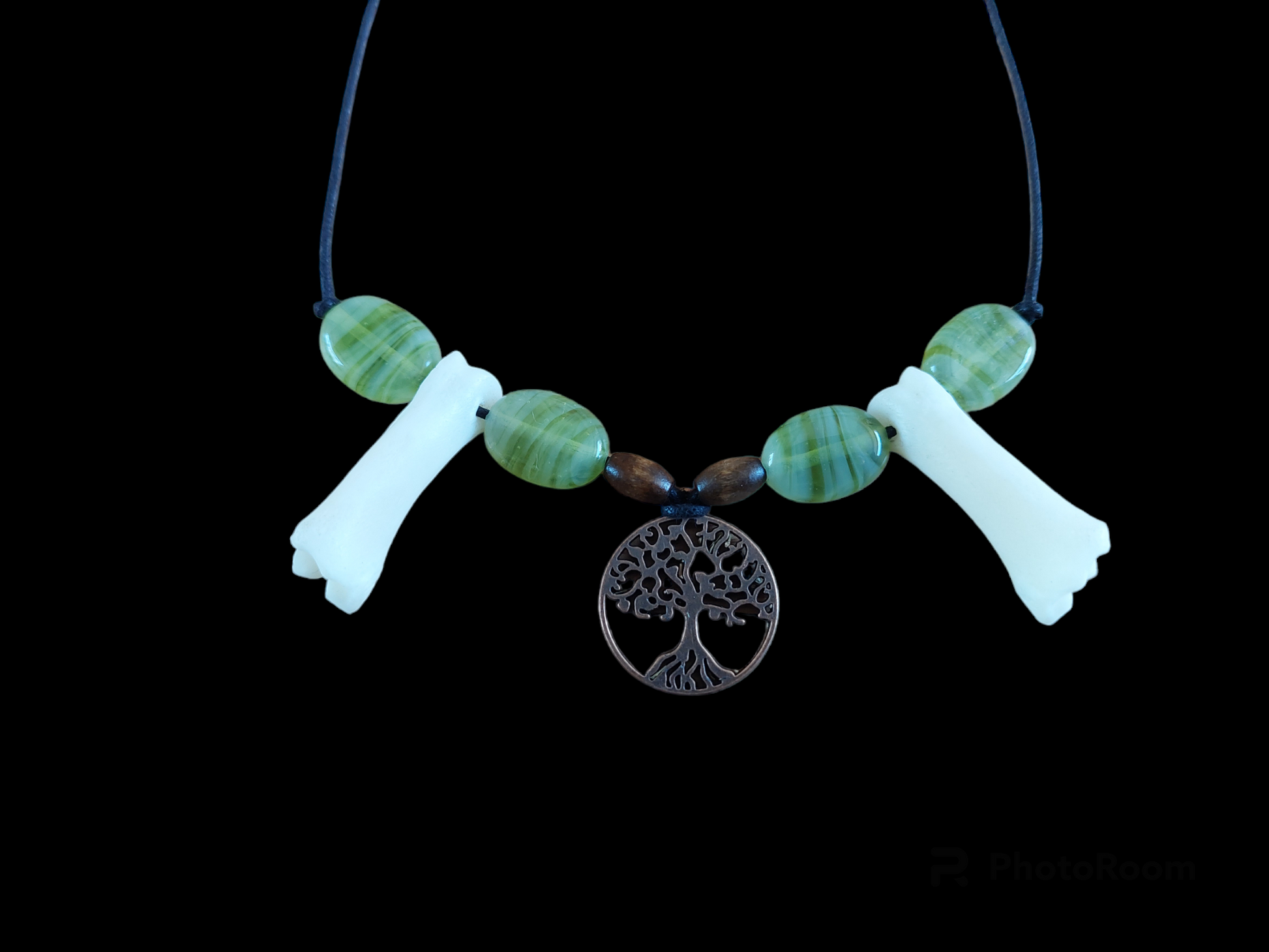 Amulet necklace made with two foot bones from a dutch roe deer. In between them hangs a bronze colored pendant of the Tree of Life.