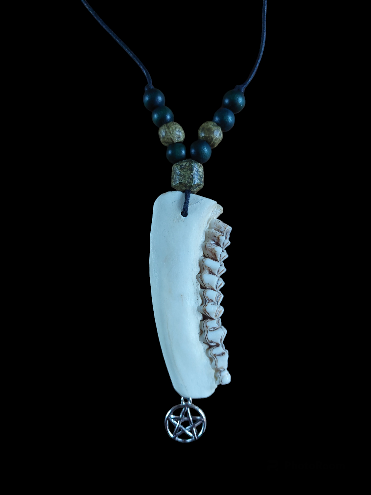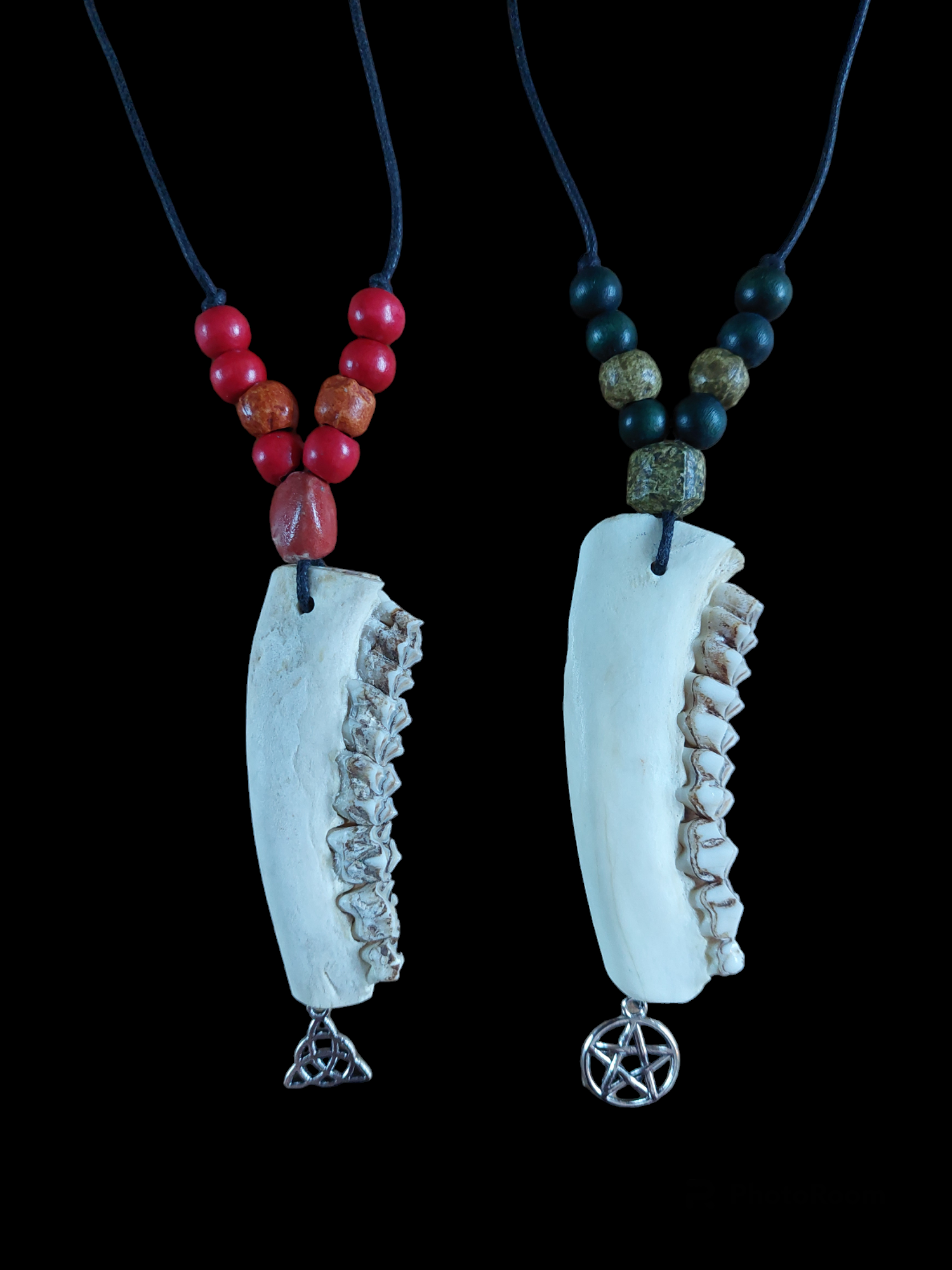 Partial lower jaws of a dutch roe deer, made into amulet-necklaces with vintage beads and black wax cord by Chyltys Kam. The roe deer jaws are from vintage origin, approximately 1960, so of course they have some 'imperfections' because of their age.