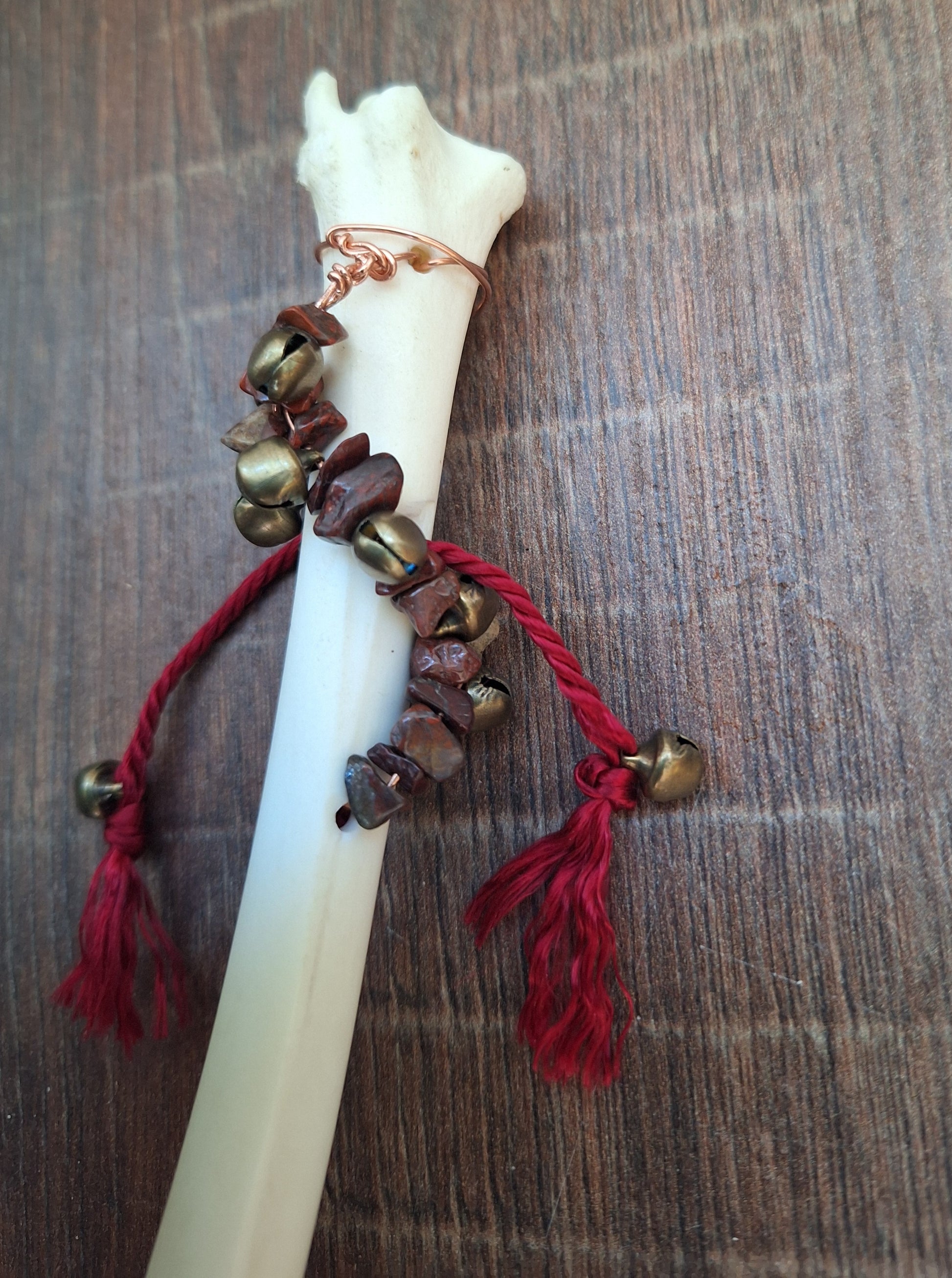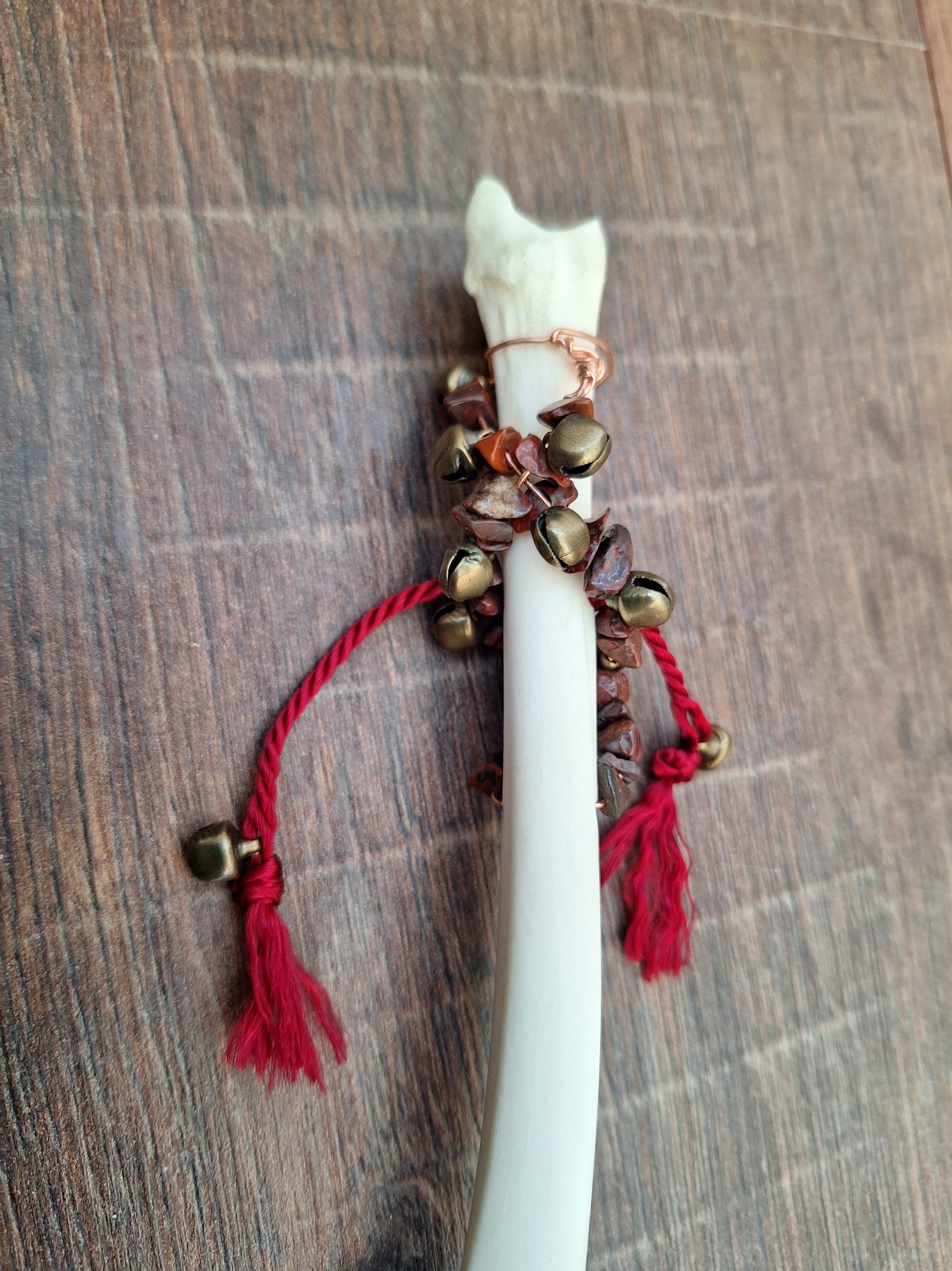 Rattle made with a very nice legbone from a dutch roe deer. The bronze colored small metal bells produce a soft tingling sound. The bells have been wrapped around the bone on a piece of copper colored metal wire, together with small red jasper beads.