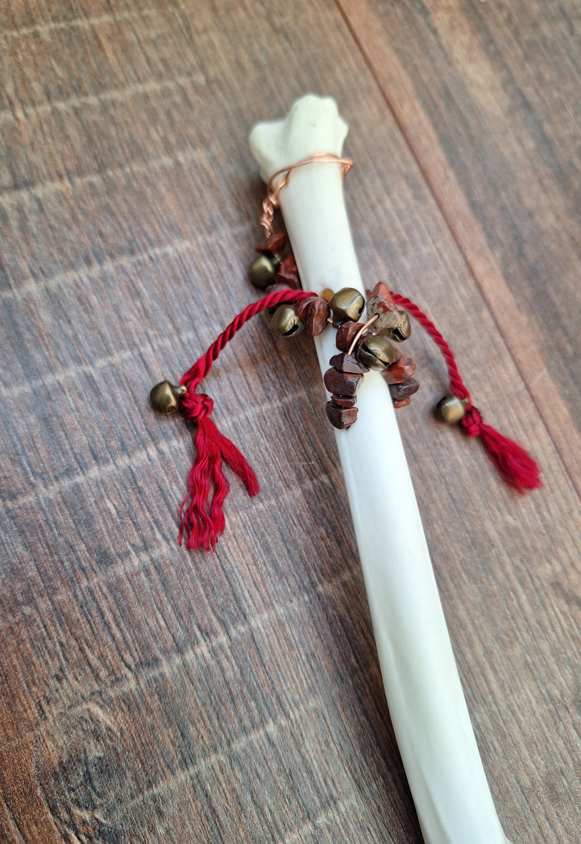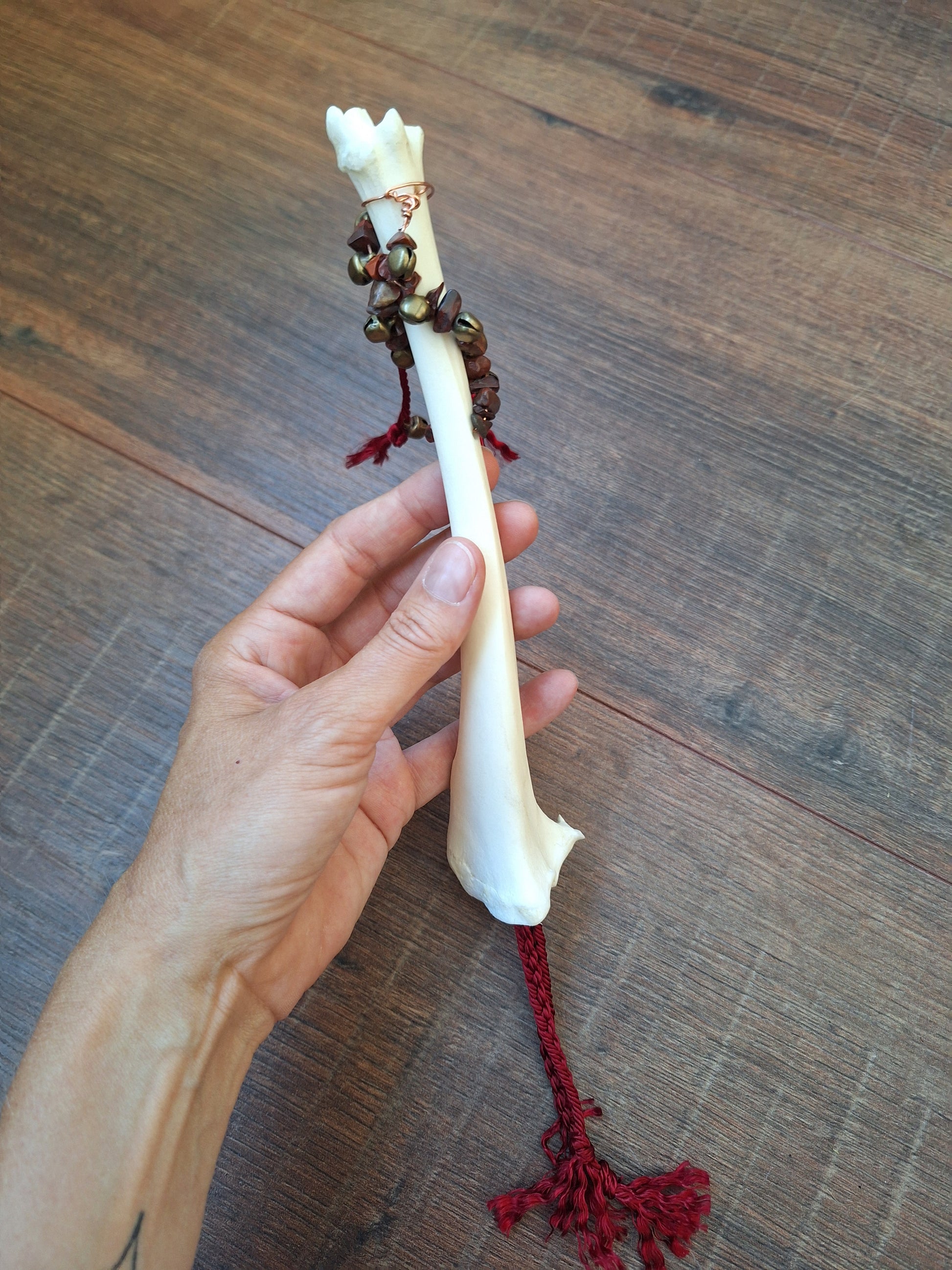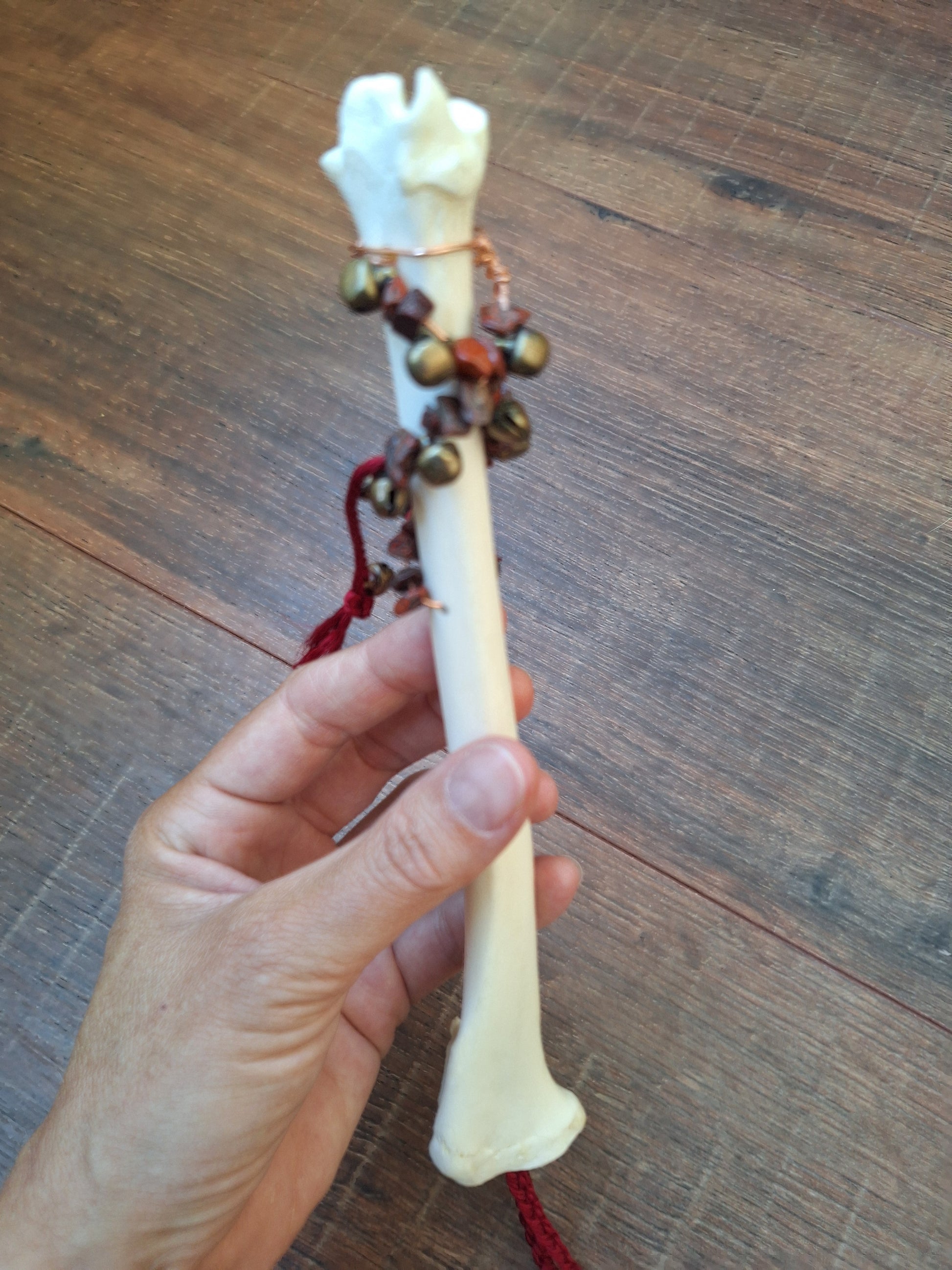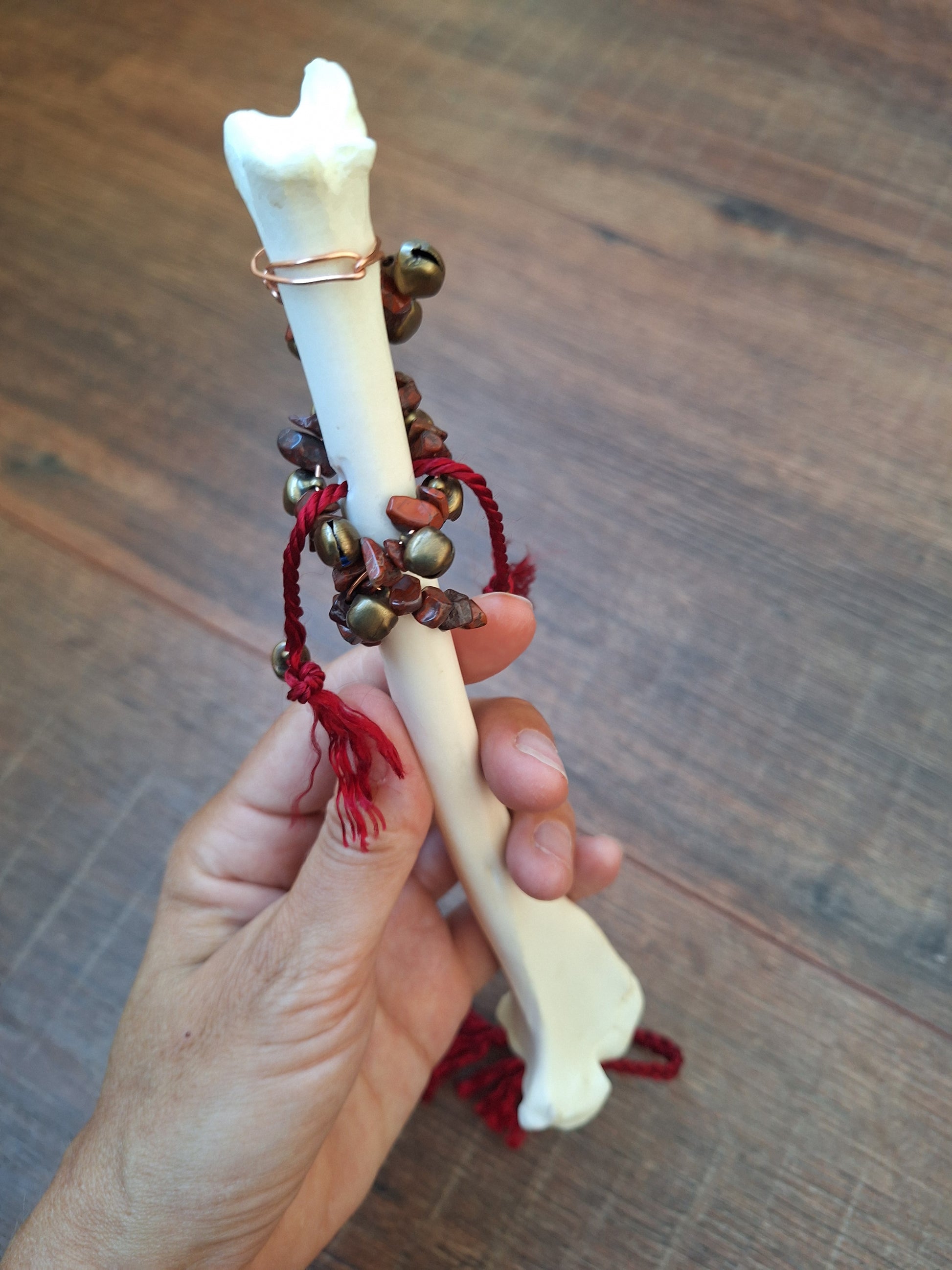 The legbone has been hollowed-out and a braid of satiny red cord has been pulled through. This adds to the symbolism of this rattle; this rattle is about grounding yourself and connecting with your innermost core. The red jasper stones bring in the grounding dynamics and the red braid symbolizes your lifeforce. This rattle supports in coming home to yourself.