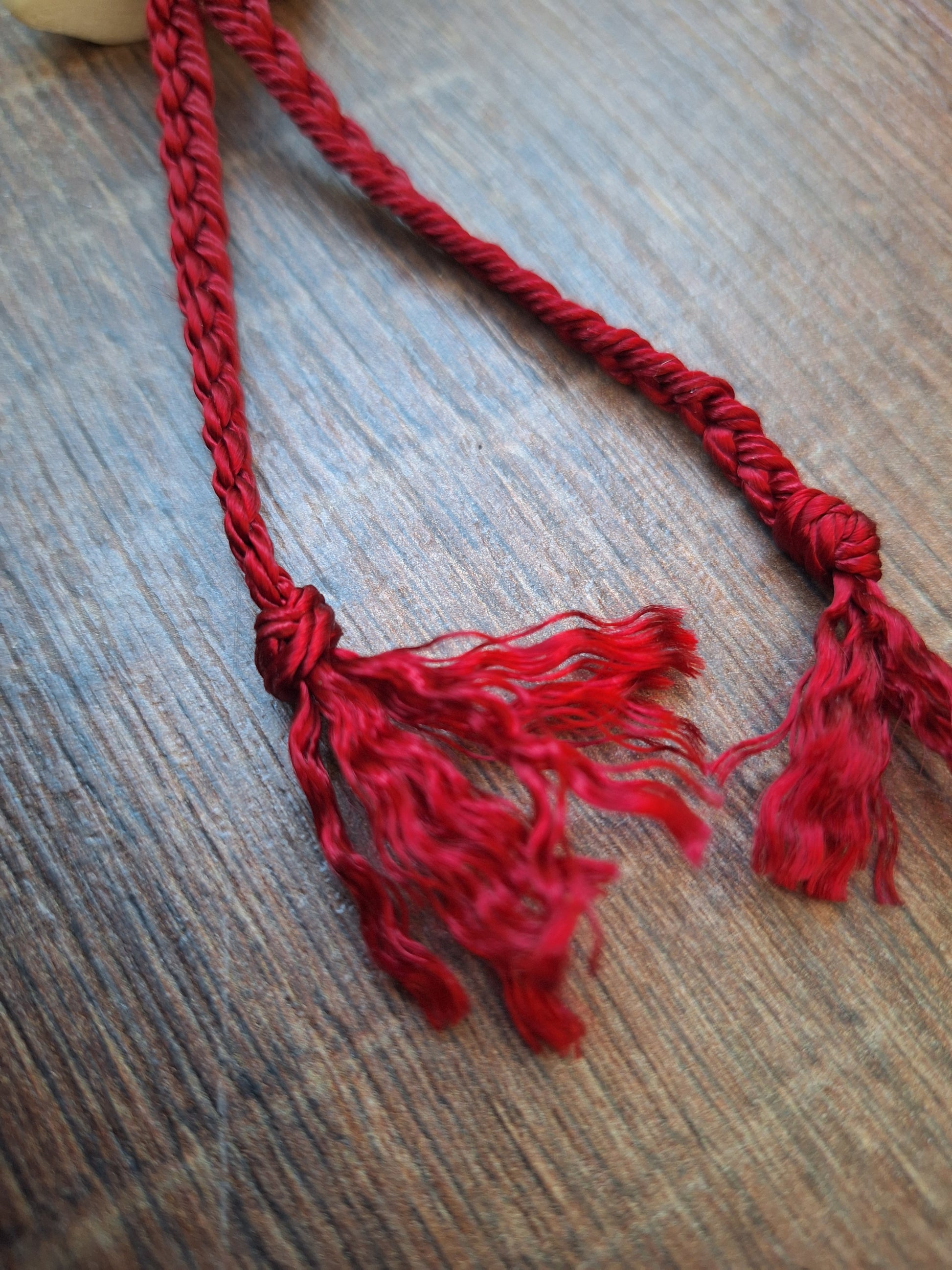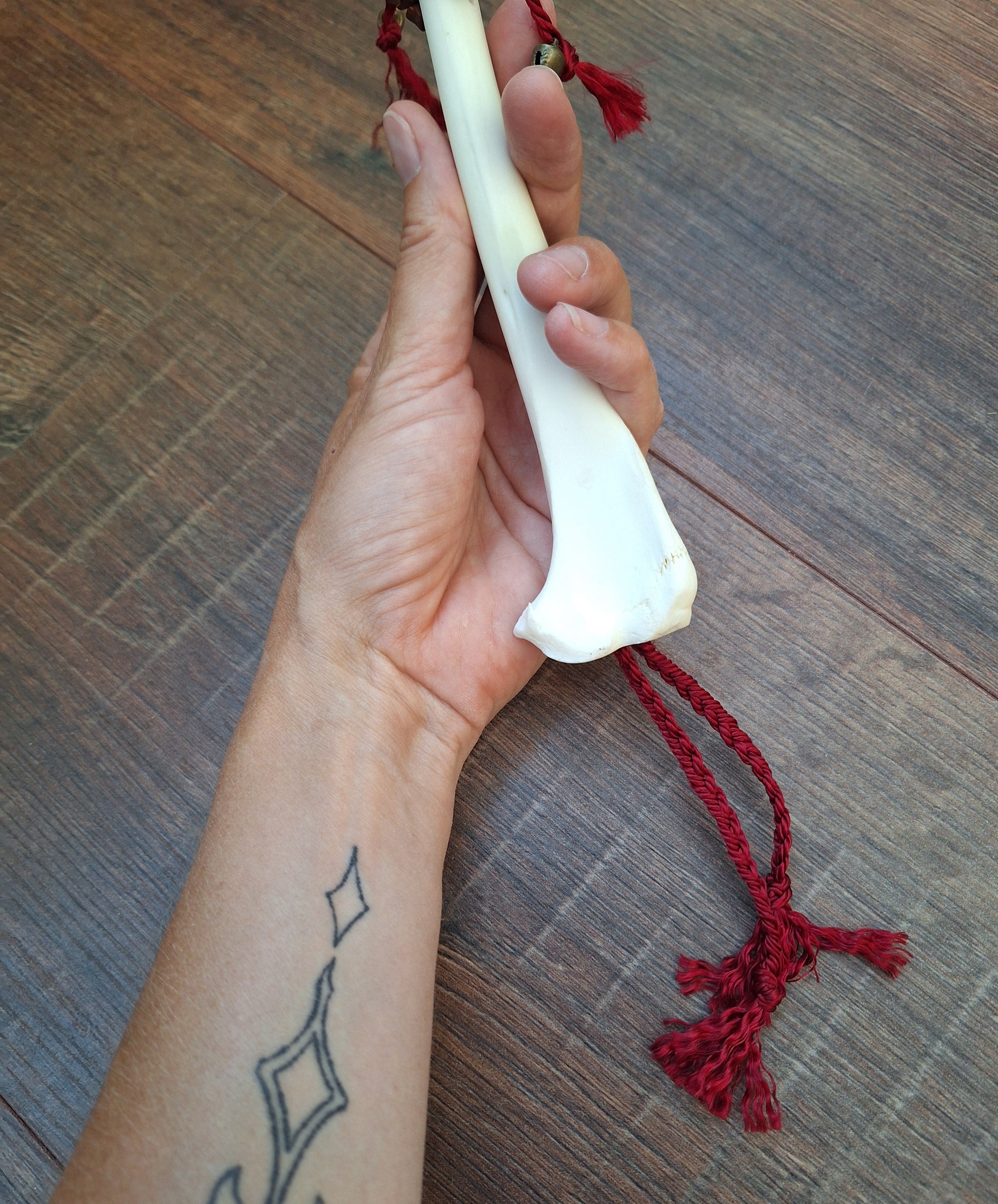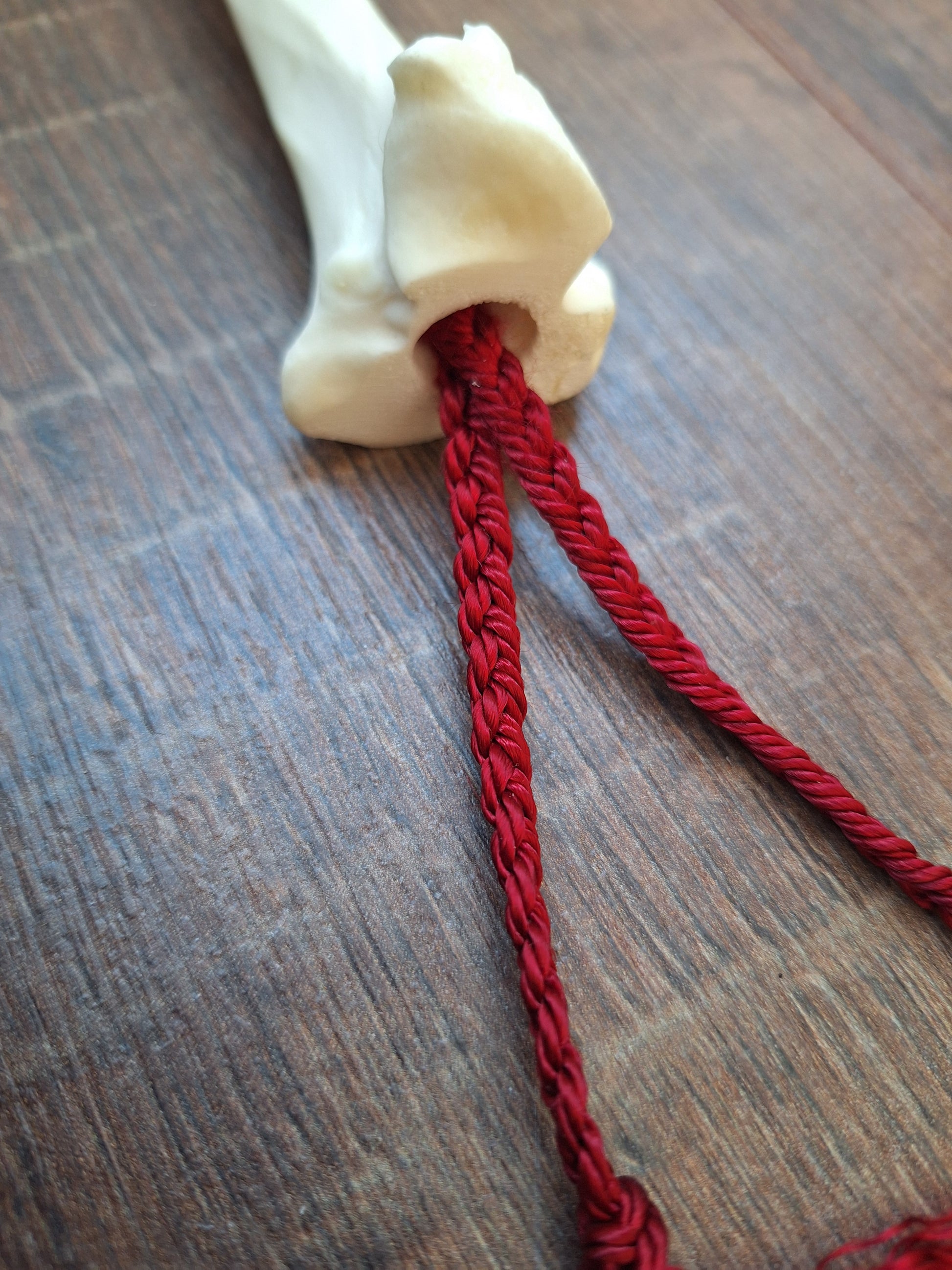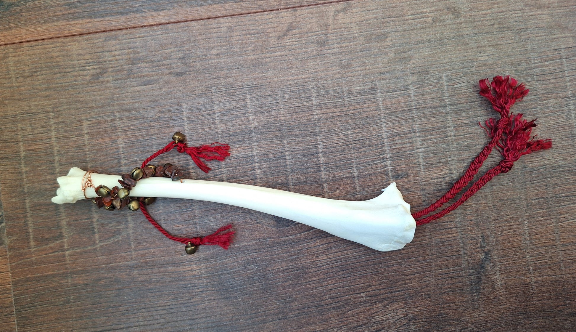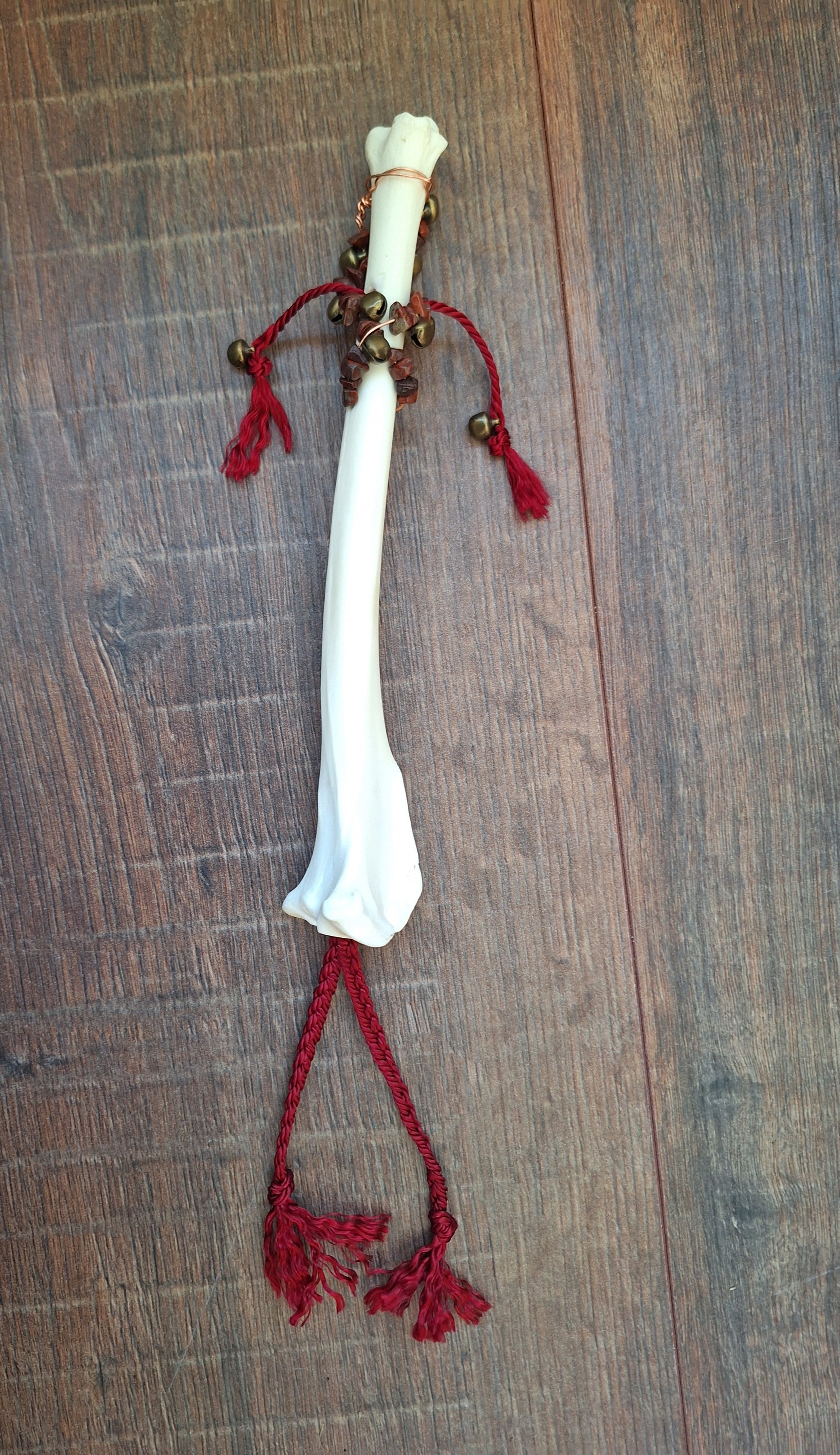 The legbone has been hollowed-out and a braid of satiny red cord has been pulled through. This adds to the symbolism of this rattle; this rattle is about grounding yourself and connecting with your innermost core. The red jasper stones bring in the grounding dynamics and the red braid symbolizes your lifeforce. This rattle supports in coming home to yourself.