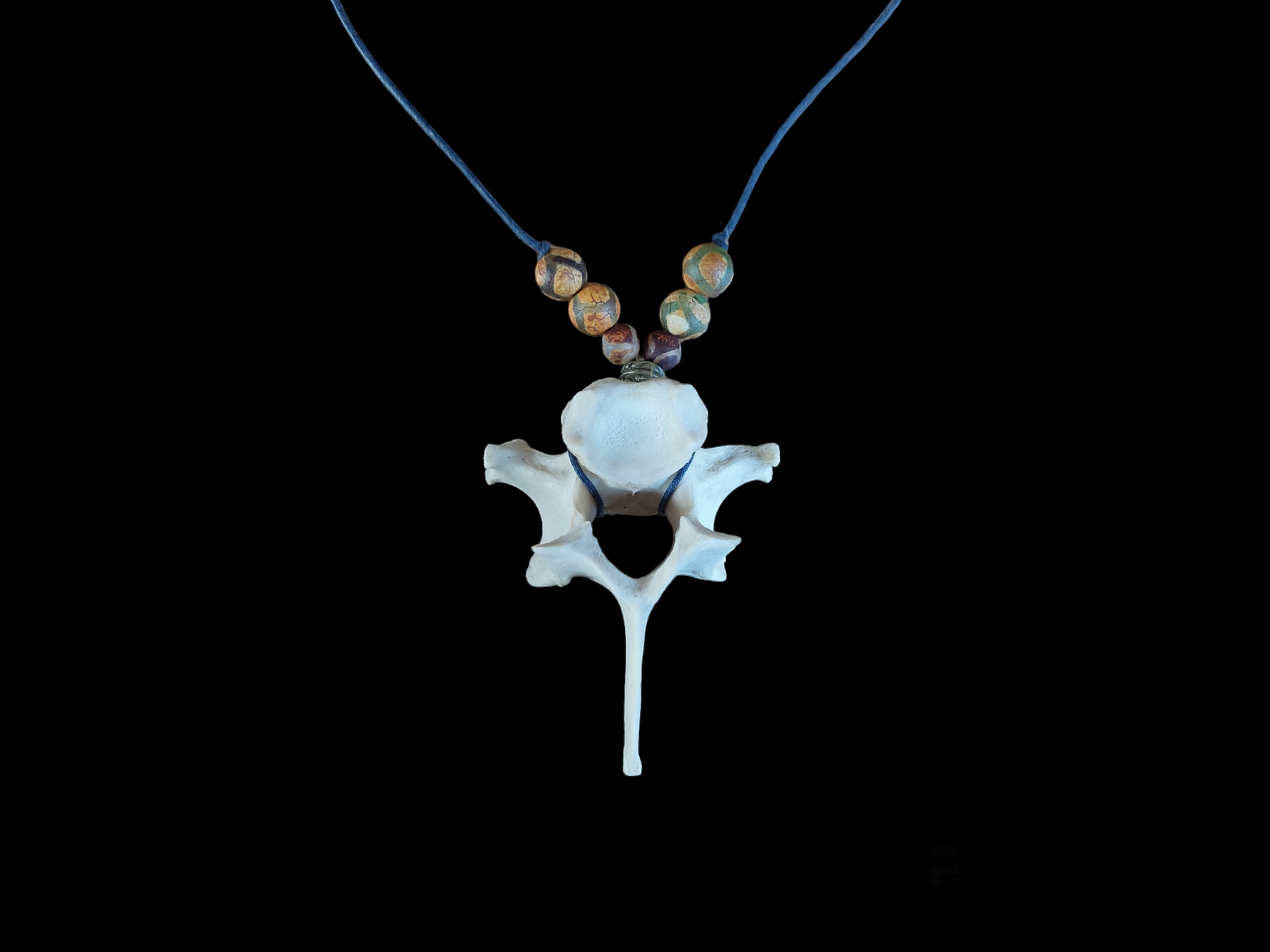 Amulet necklace made with a lower back vertebra from a dutch roe deer. On top of the vertebra glass beads in Tibetan turtle dzi-bead style have been used, symbolizing longevity; a long and healthy life.