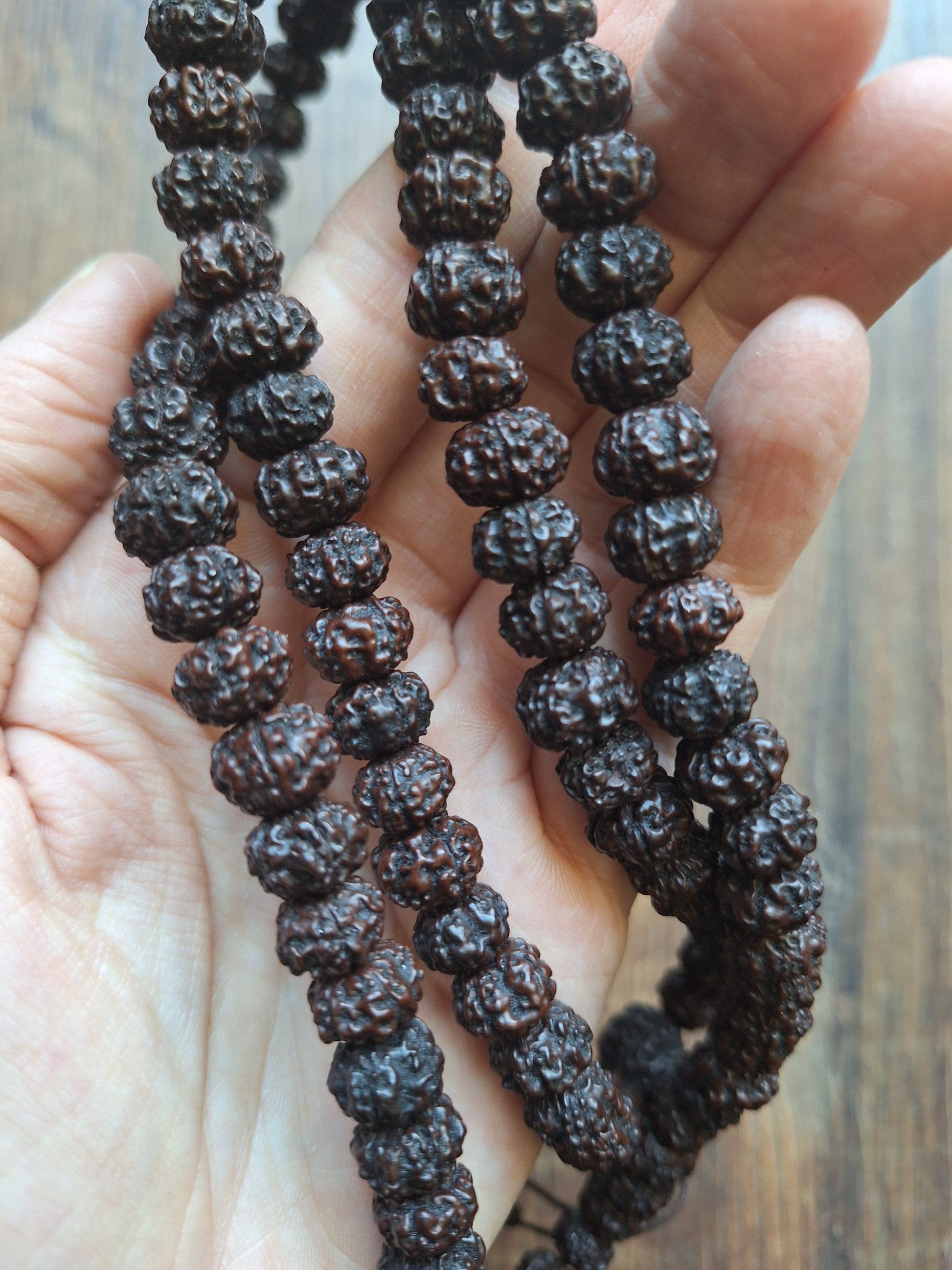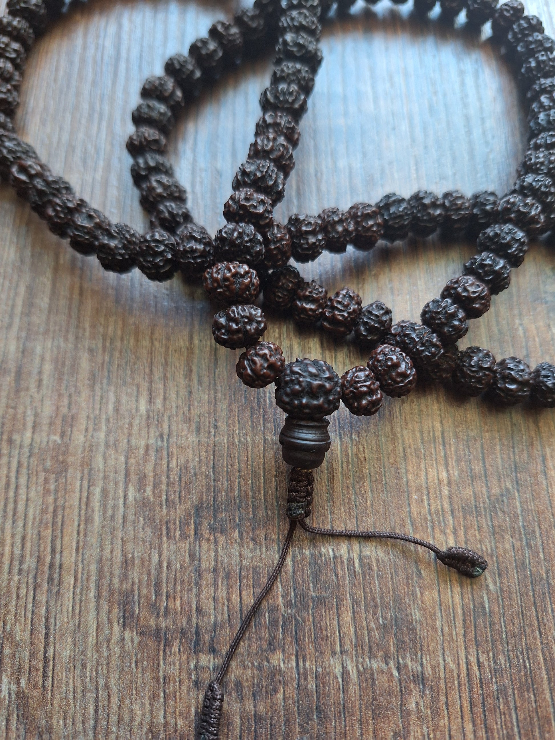 The beads used in this (recently made) mala have a size of approximately 7 x 10 millimeters. The guru bead is slightly bigger. Total length of the necklace is approximately 82 centimeters. The beads have been treated with a tea-dying method to obtain a nice dark color and shine, and are strung on durable, dark brown nylon macrame cord.