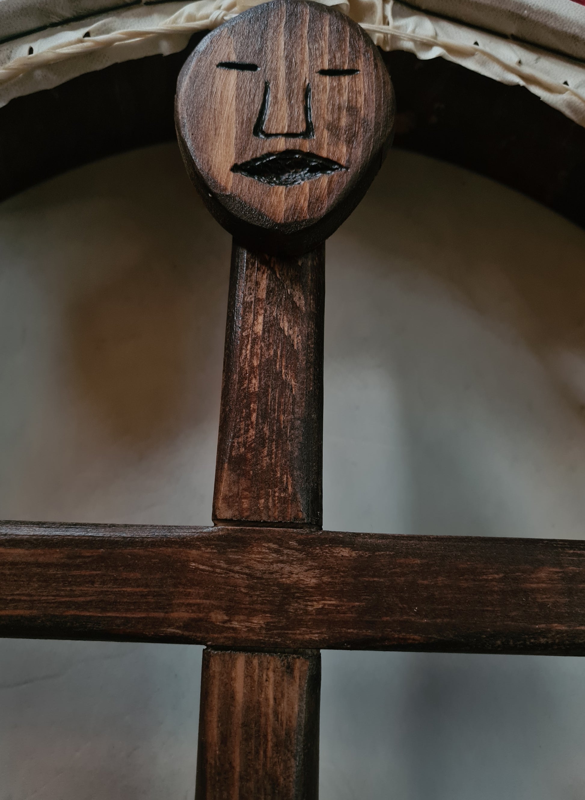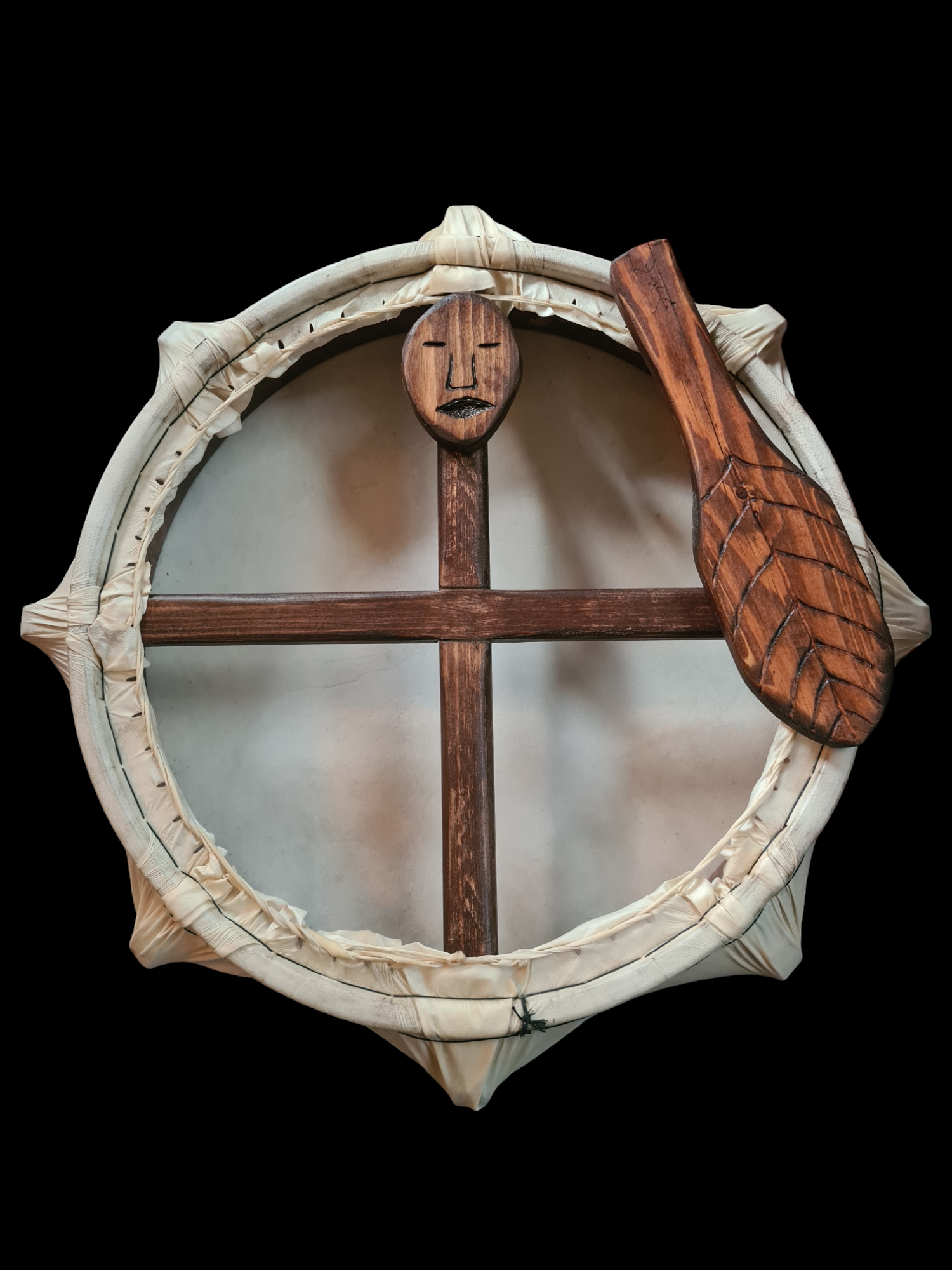 Beautiful Siberian style drum. Handstitched to the frame. White goat skin, 45 cm diameter with 8 horns. A big enough drum for the bigger rituals, blessing or healing rituals with a low and deep voice. It comes together with a Khakassian style drumbeater called "orba" which represents a leaf of the World Tree.