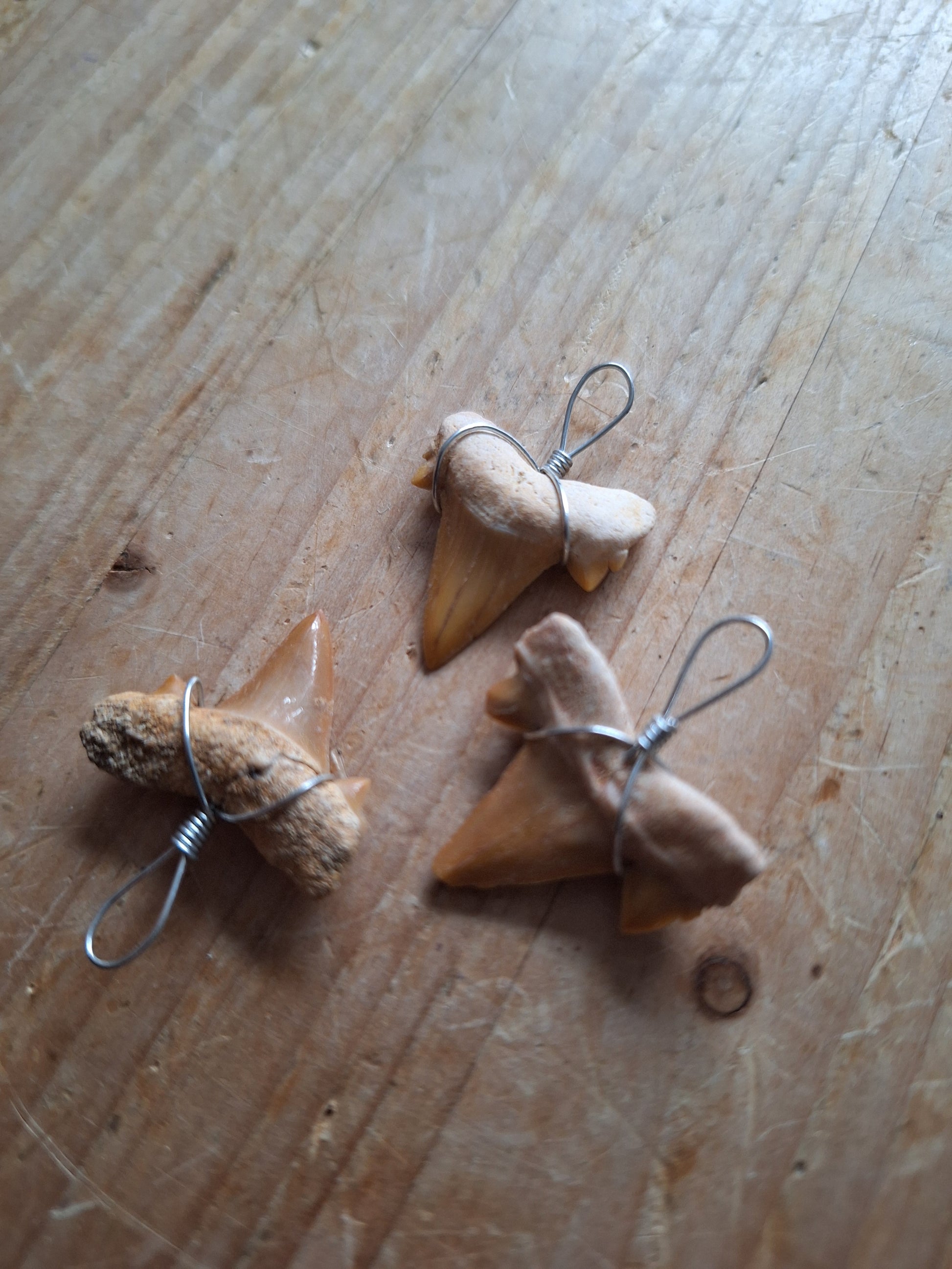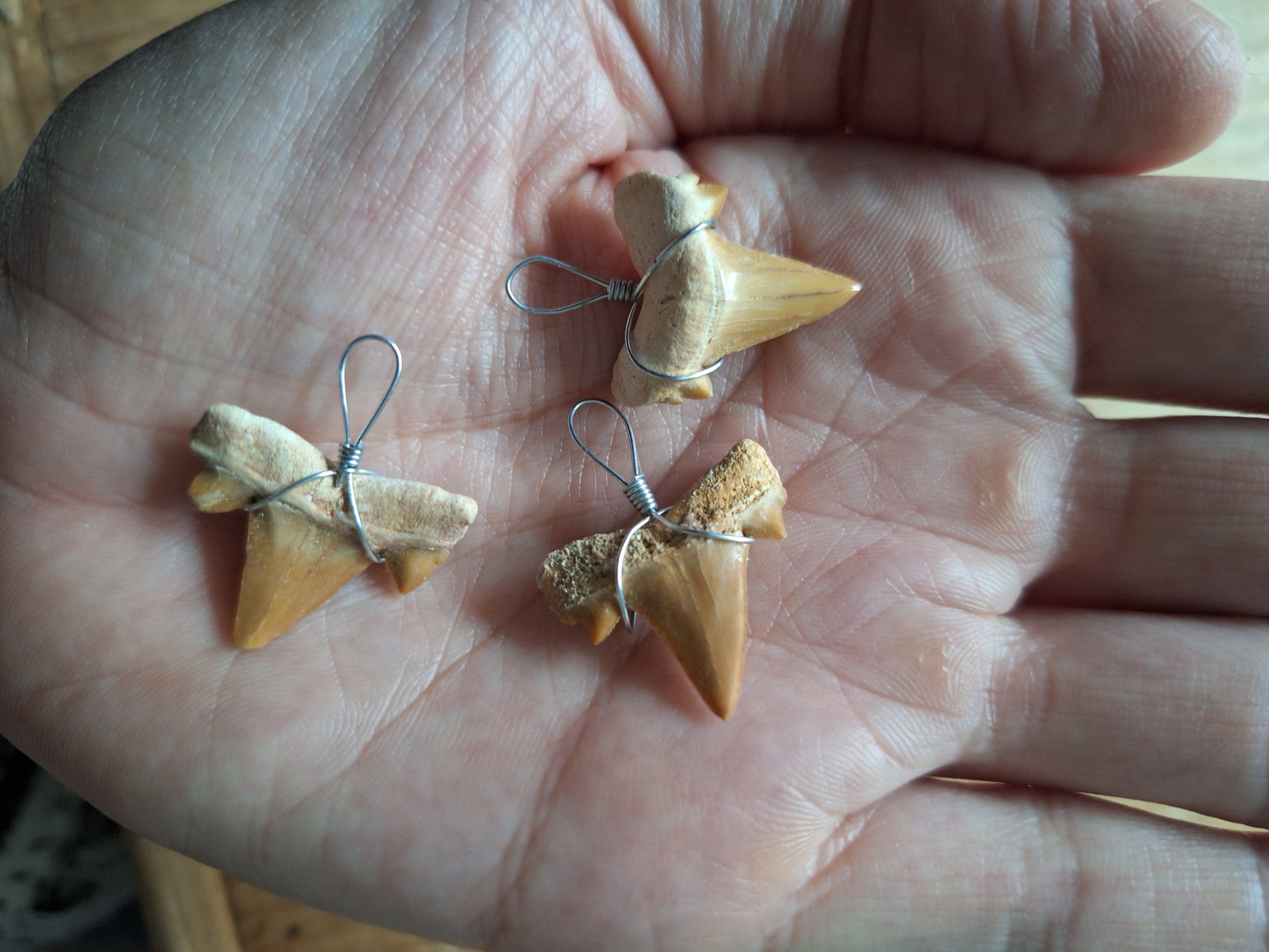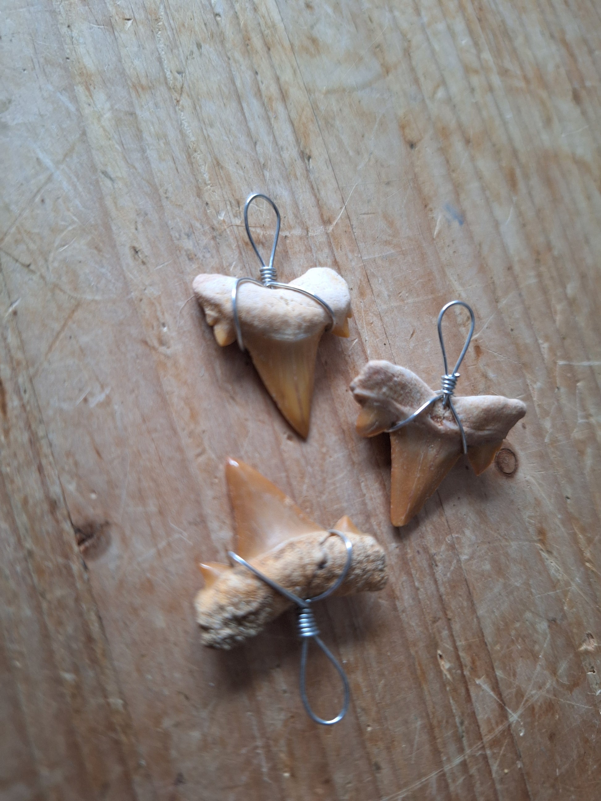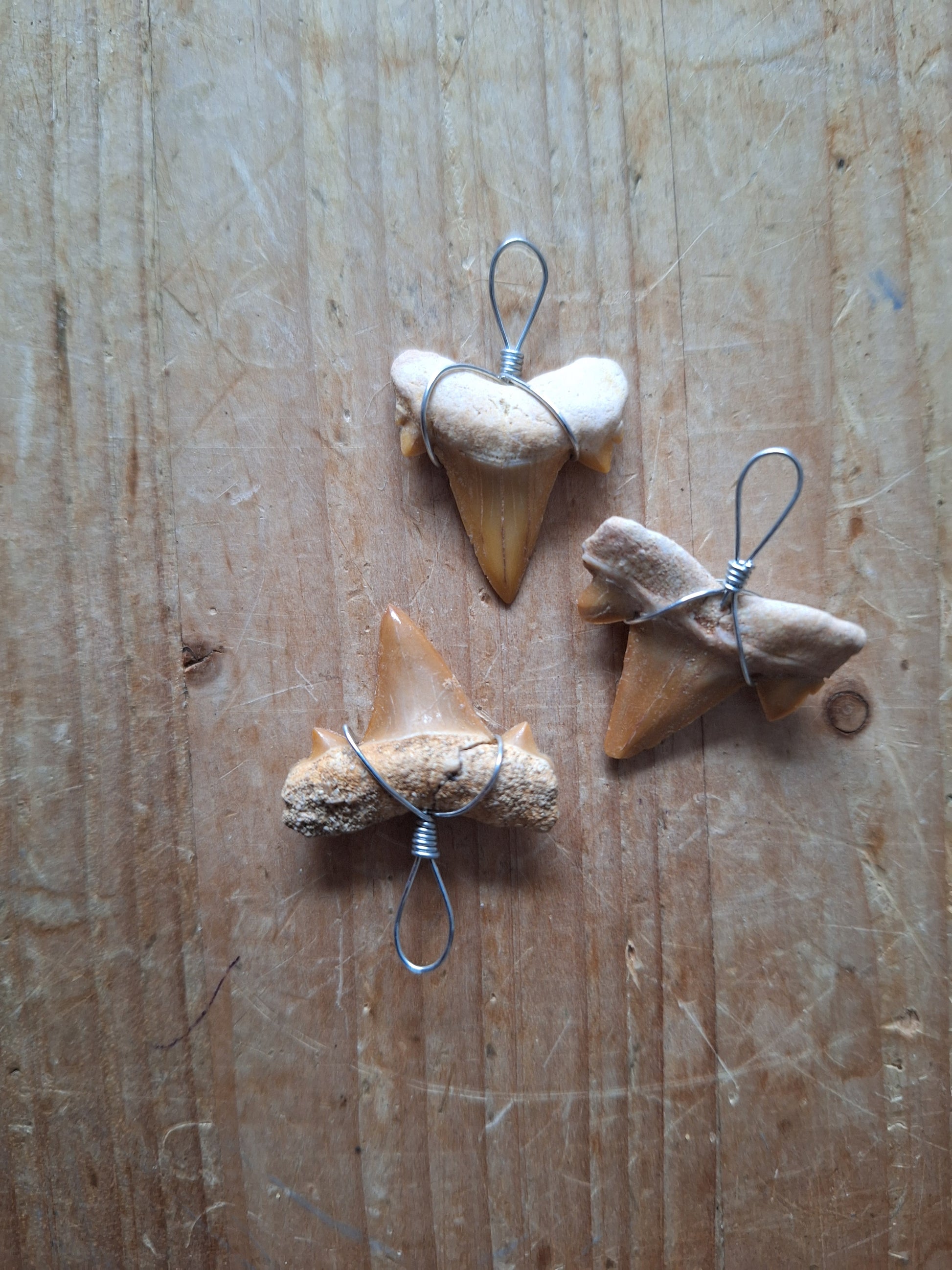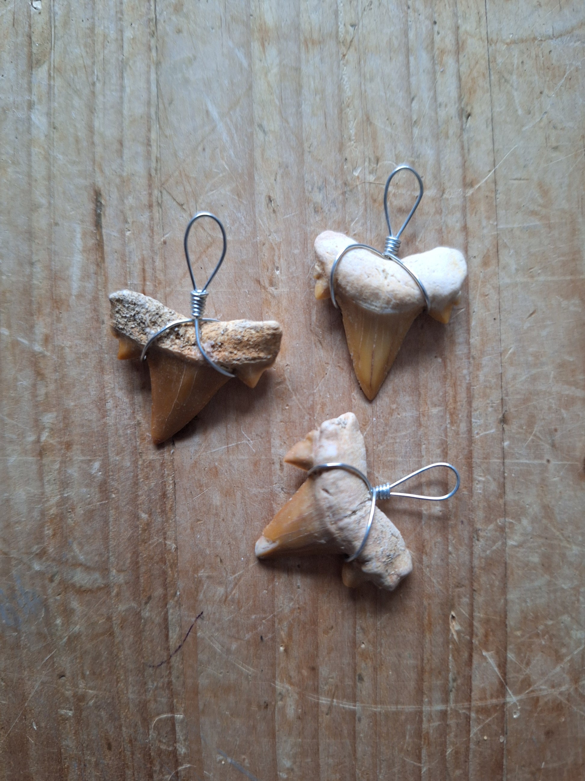Very nice fossilized shark teeth turned into a pendant with silver colored metal wire. Ready to be hung on a cord or necklace to be worn as a personal jewelry- or amulet item.