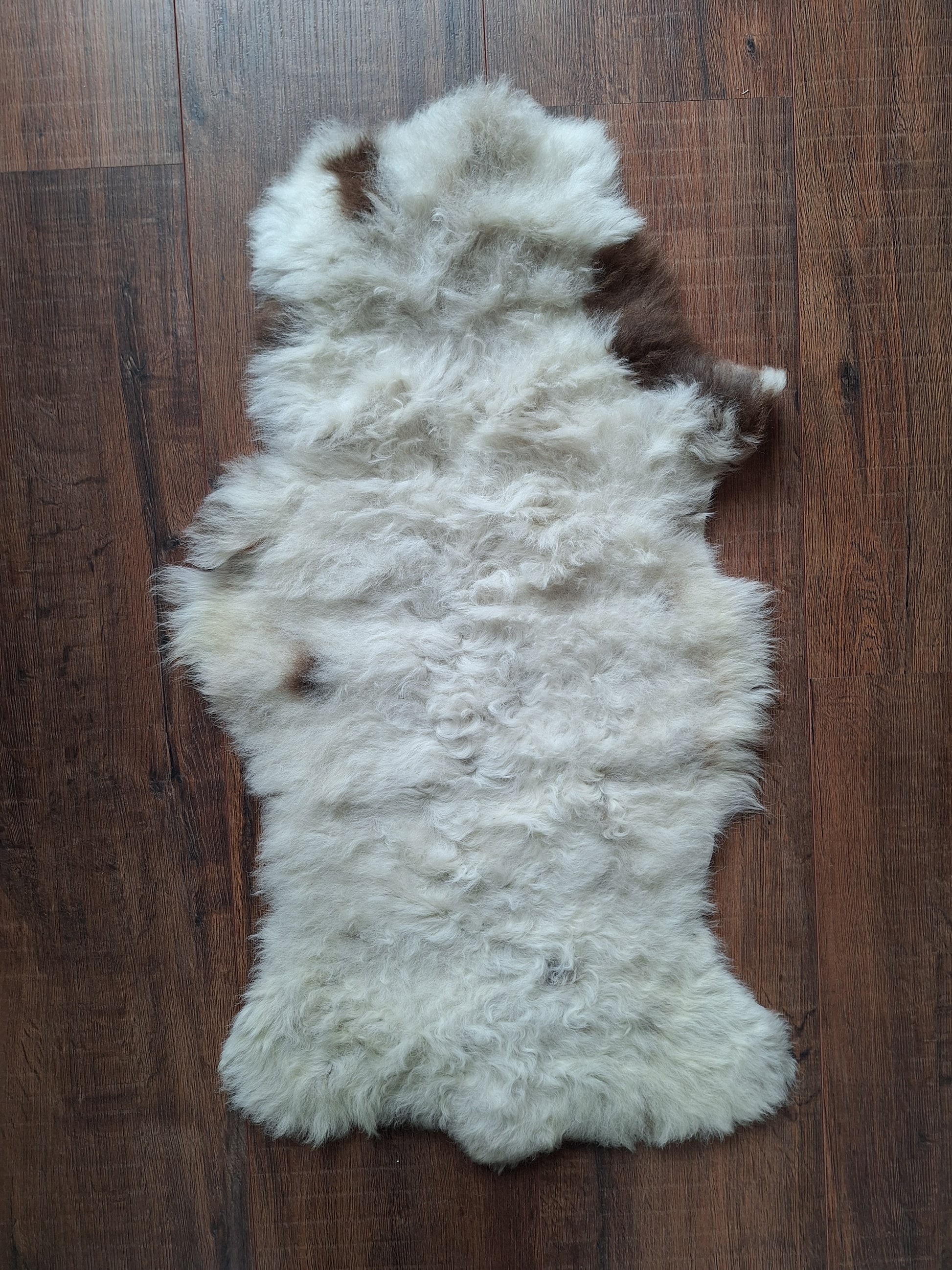 Very nice, somewhat smaller, sized sheep hide, recently professionally tanned here in the Netherlands to a very soft, supple and flexible hide. Beautiful soft, medium long curly white hair with a few brown spots.