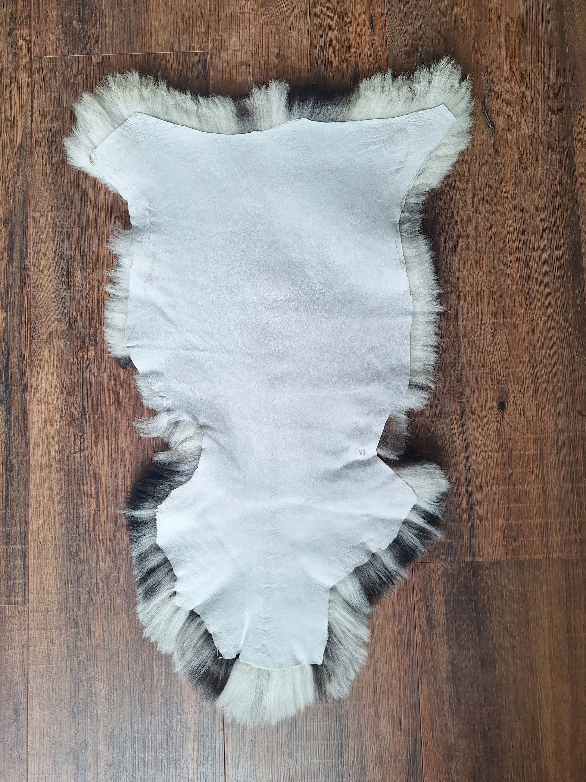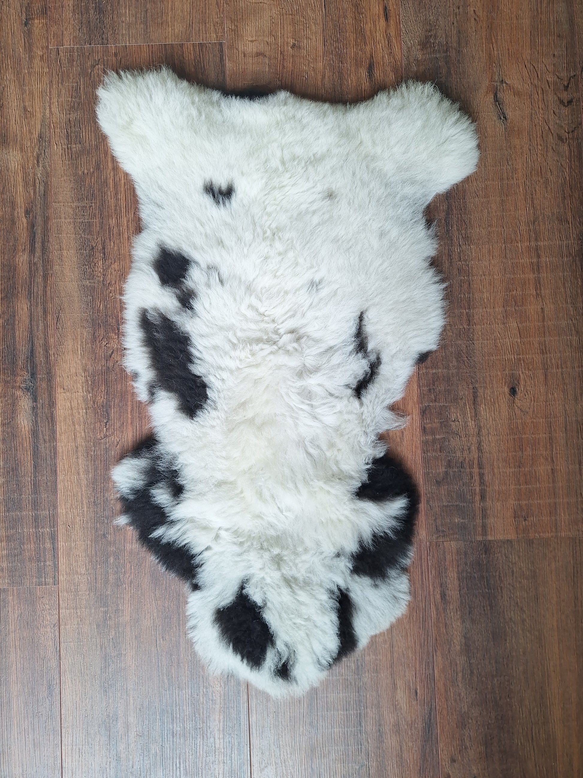 Very nice, somewhat smaller, sized sheep hide, recently professionally tanned here in the Netherlands to a very soft, supple and flexible hide. Beautiful soft, medium long curly white hair with a few black spots.