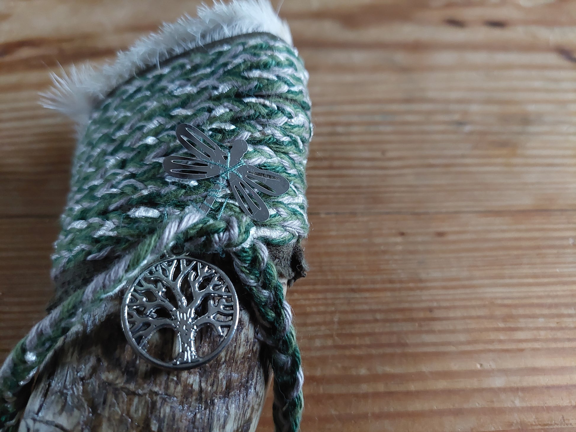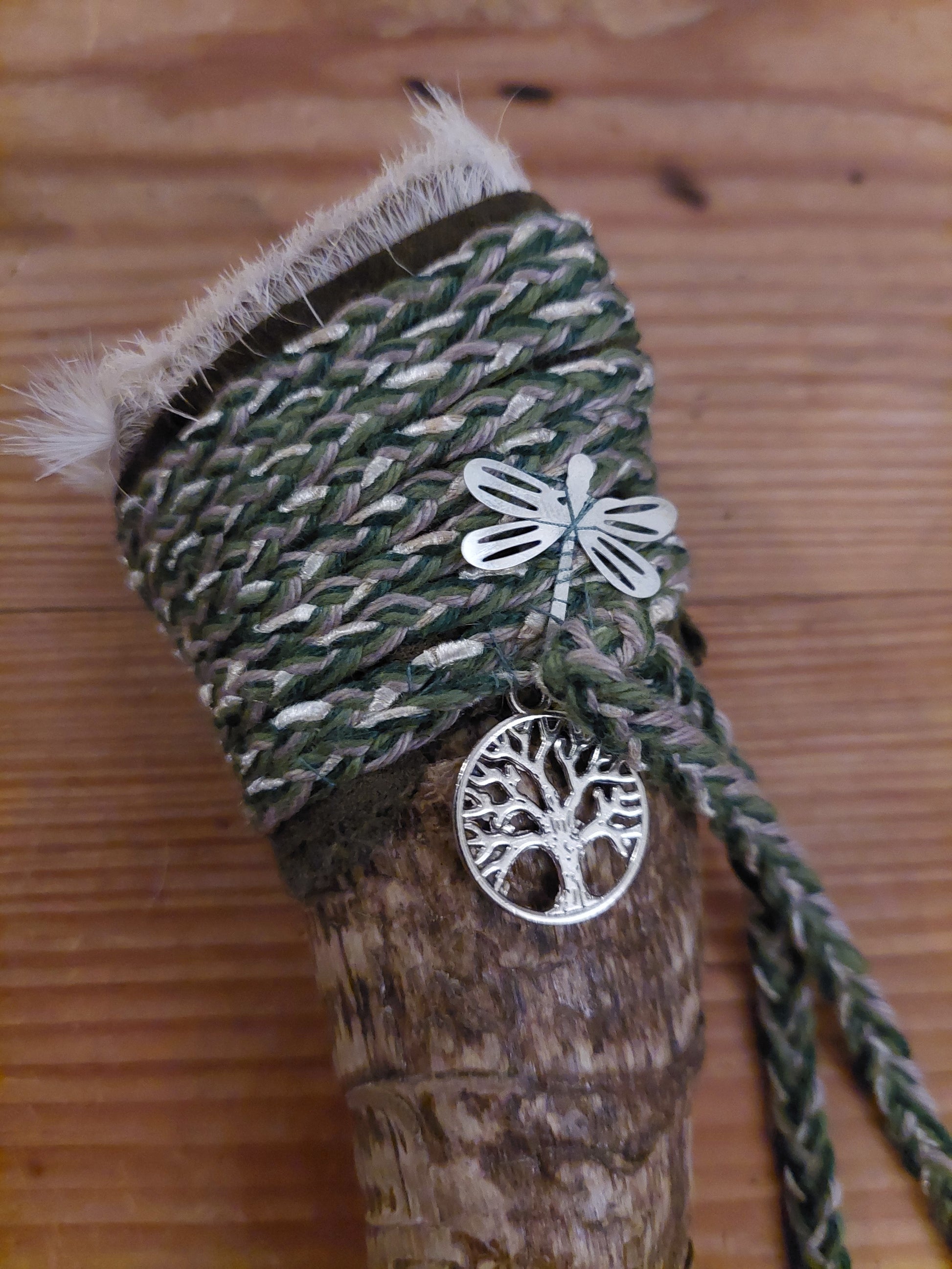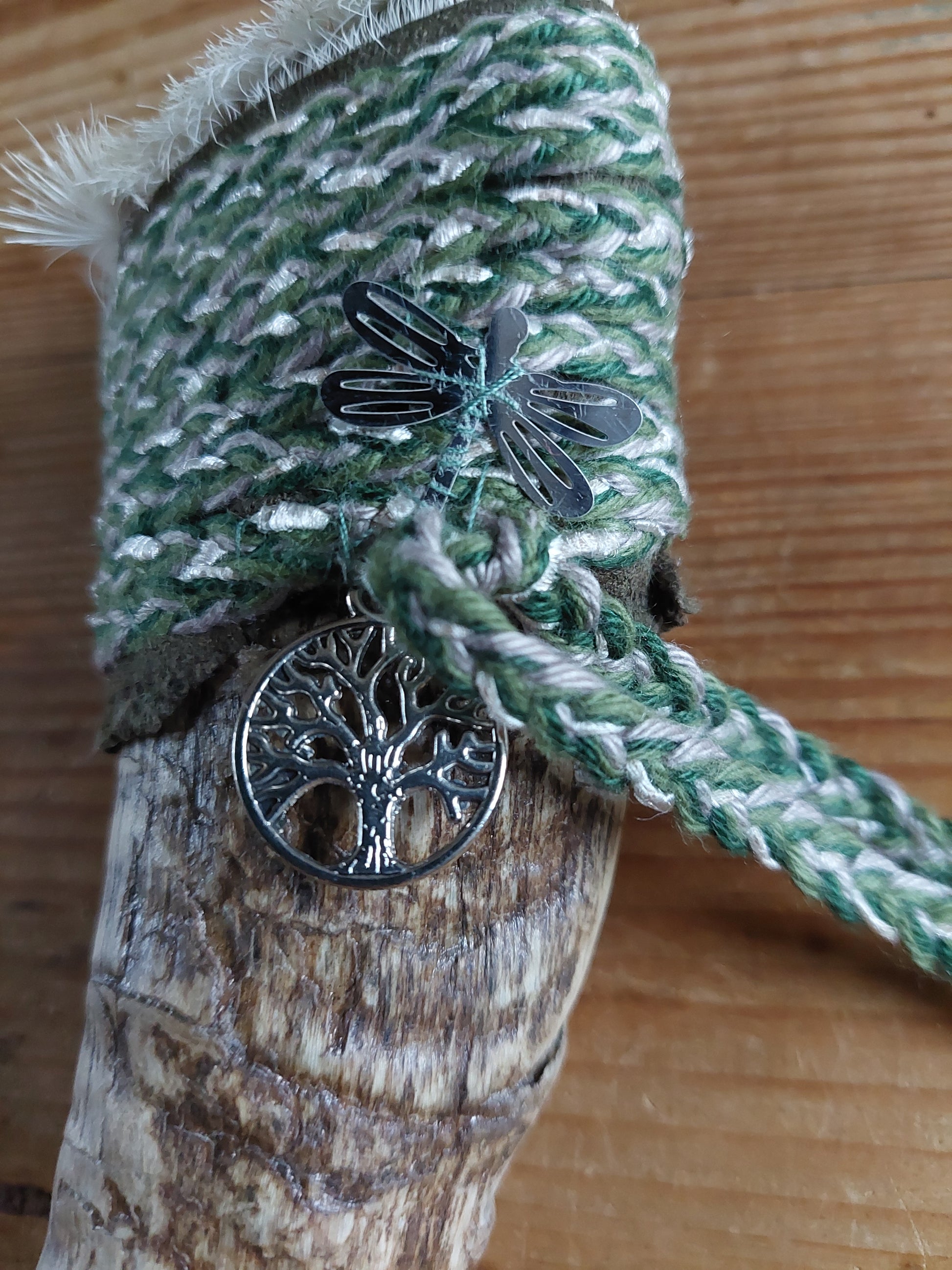 The rattle is decorated with a colorful braid, made from 9 strands of 100% cotton in the colors green, white and grey. During the braiding, only the best of intentions and blessings were put in.